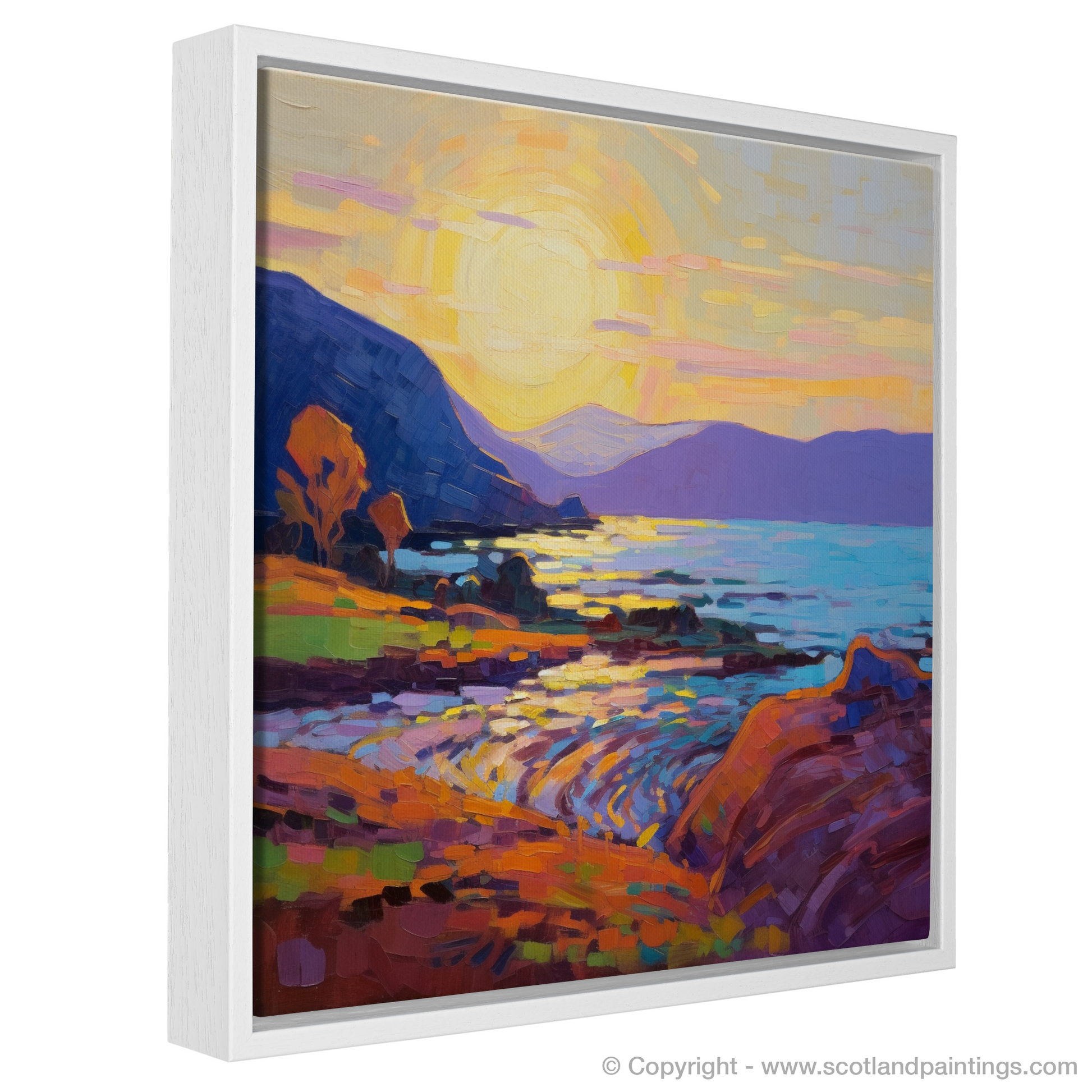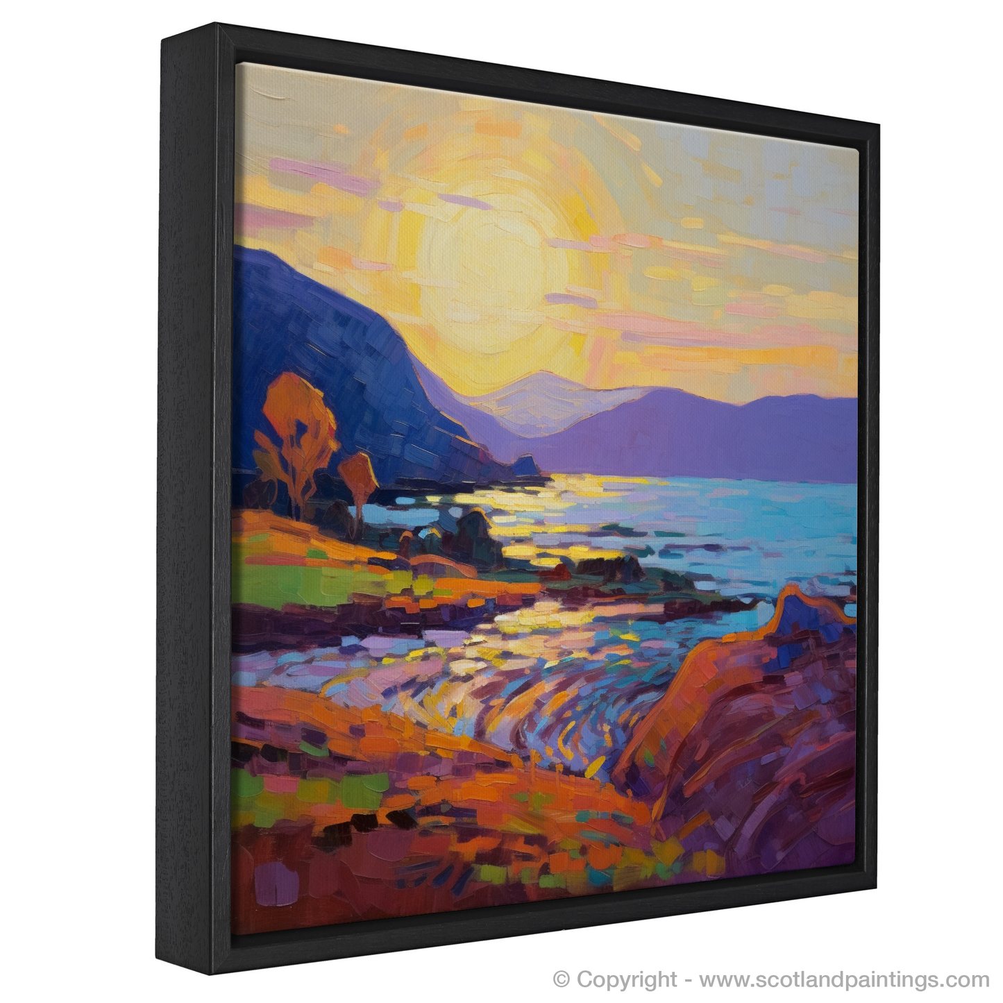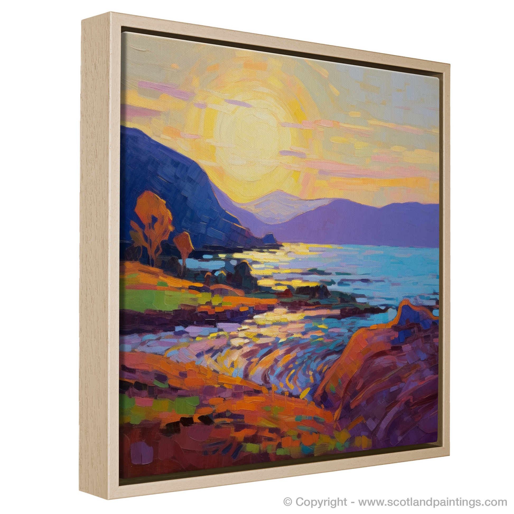 In this stunning portrayal, brushstrokes dance with the hues of twilight, giving birth to a scene that is as much a feast for the senses as it is a testament to the fleeting moments of natural splendour. Golden yellows, rich purples, and soft pinks reflect off the water's surface, creating a symphony of light that mirrors the grandeur of the sky above.