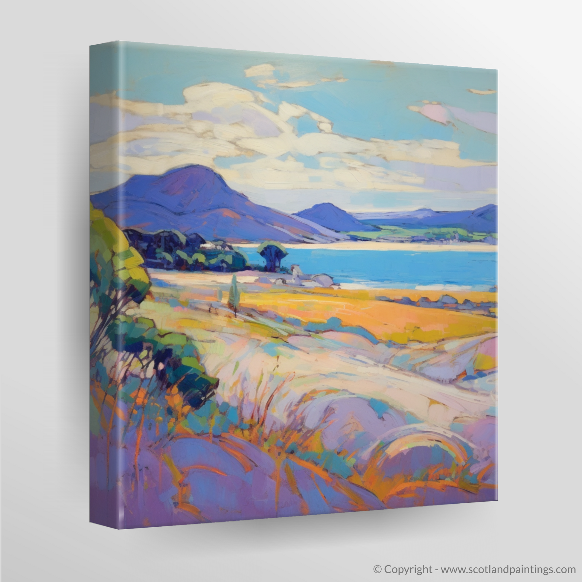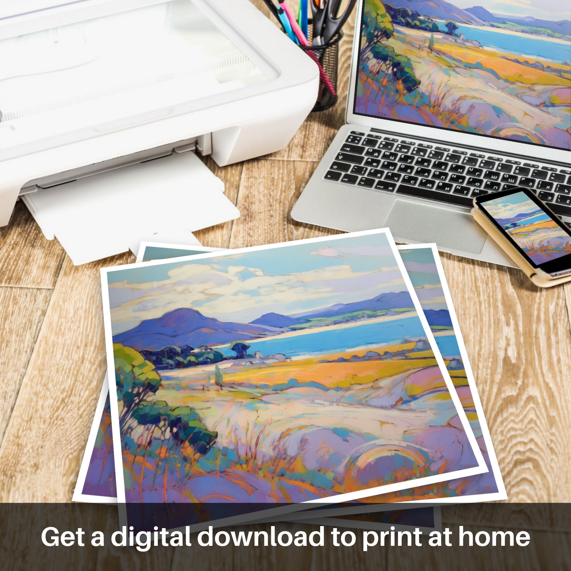 Bathed in the luminous glow of summer, this Impressionist print captures the timeless beauty of Mellon Udrigle Beach, nestled along the stunning shores of Wester Ross. The warmth of the season dances across the canvas, bringing to life the shimmering azure waters that meet the golden sands in a tender kiss. Gently rolling hills rise in soft silhouettes against a sky swept with serene pastels, echoing the tranquillity of a Scottish summer's day.