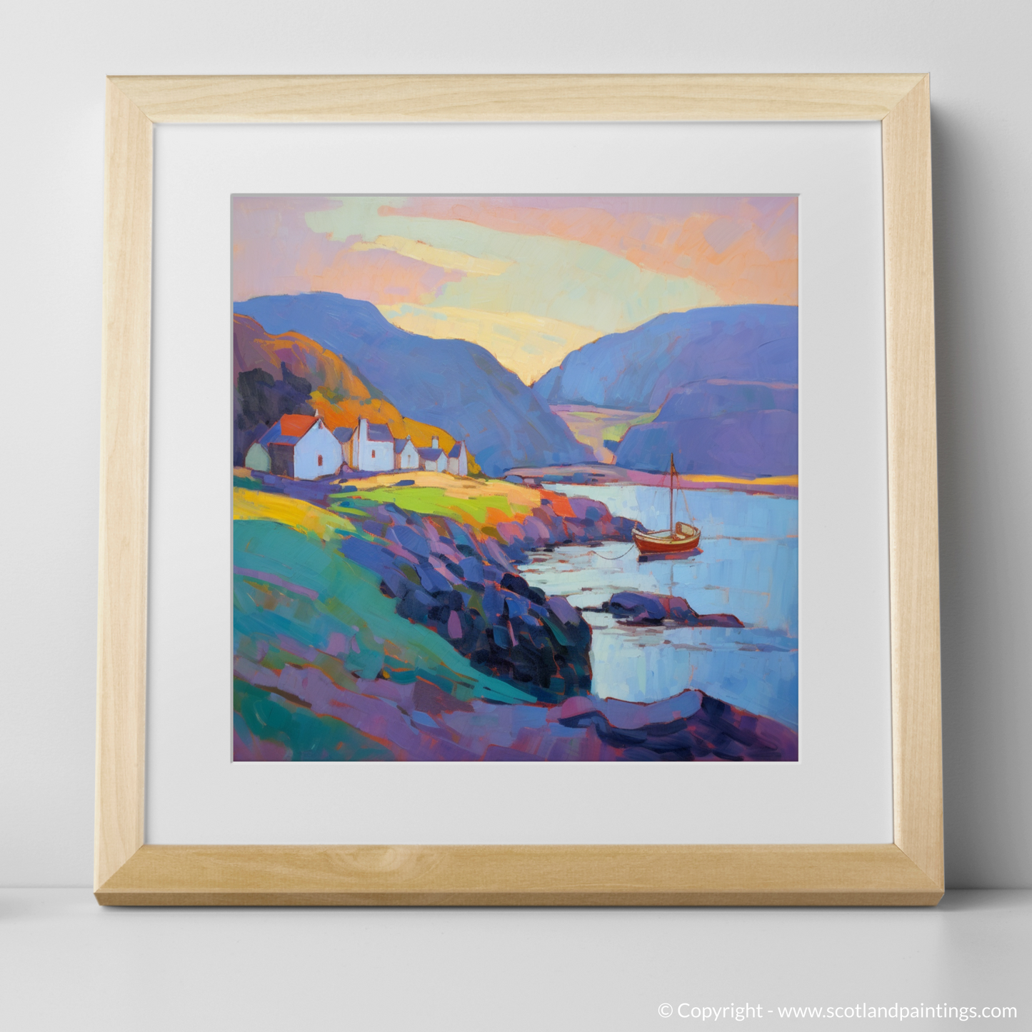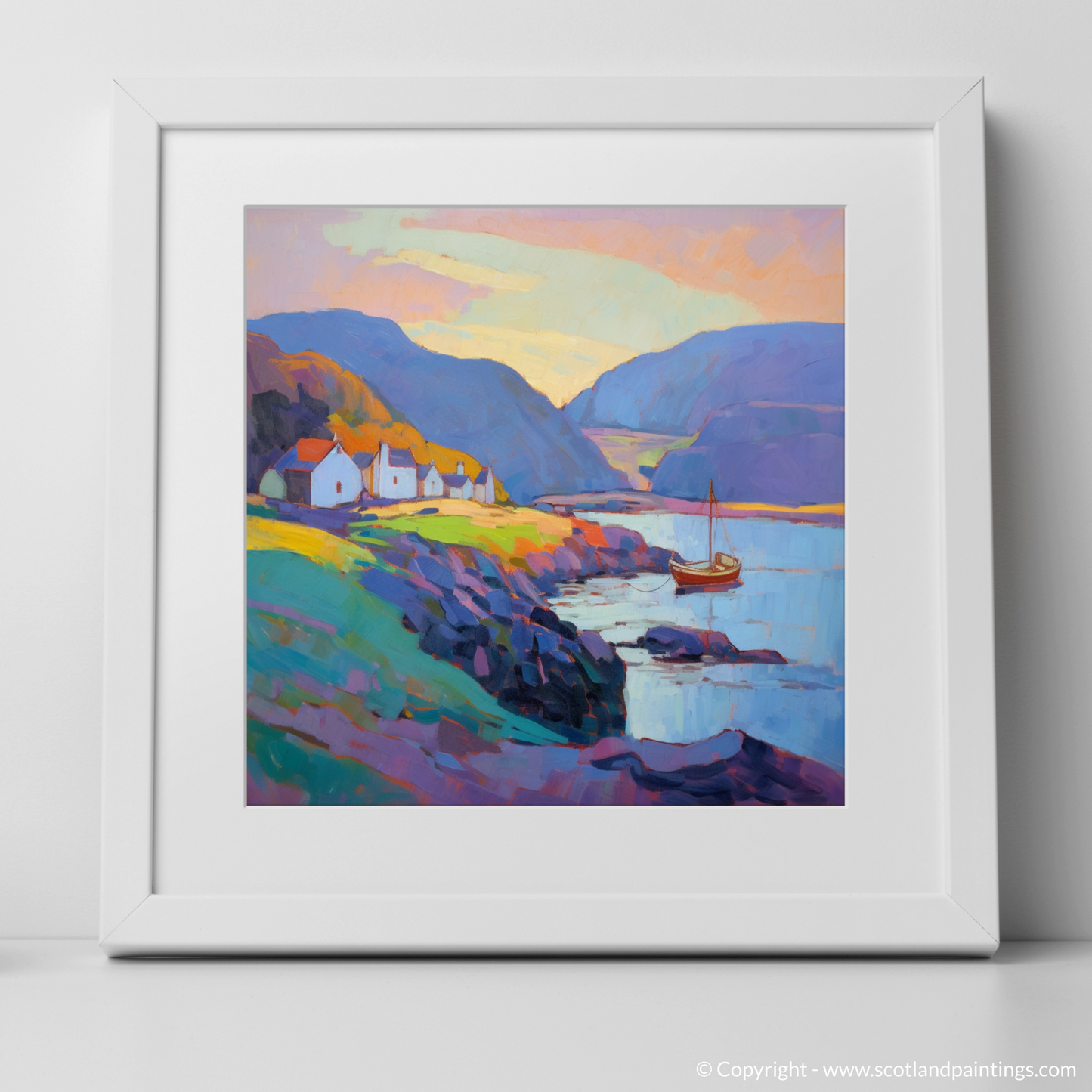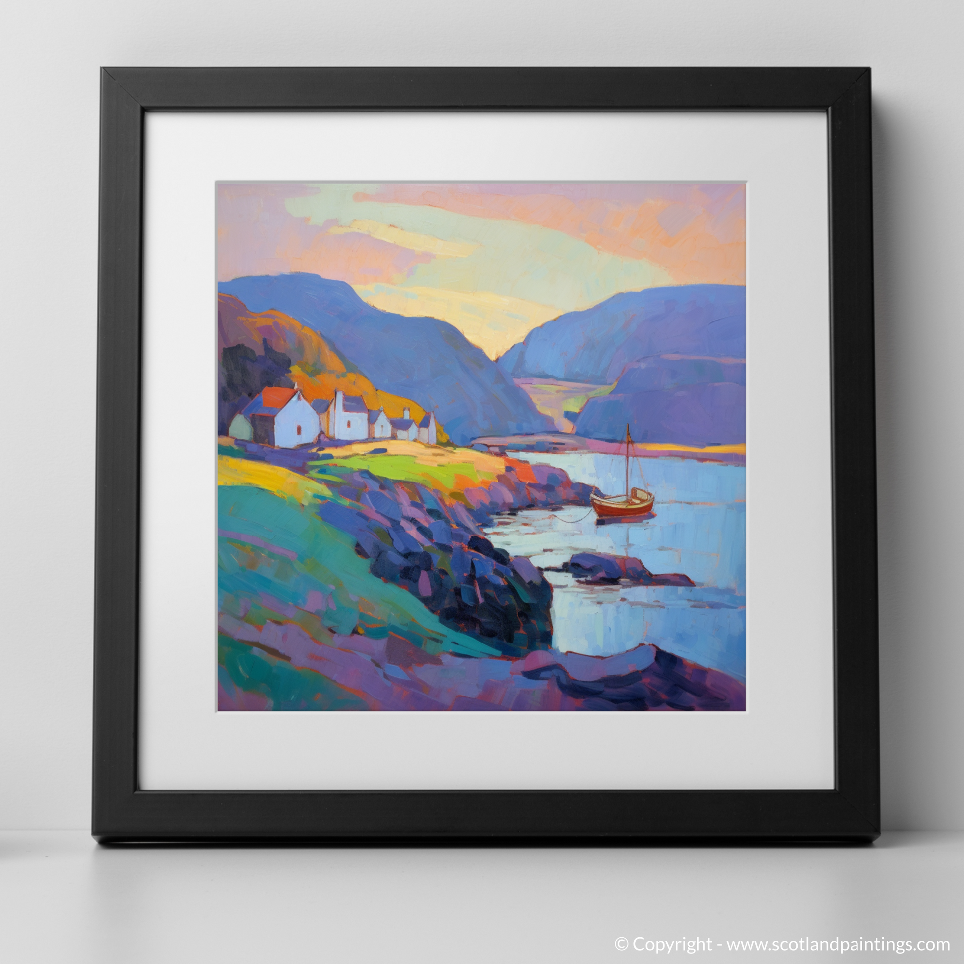 A solitary sailboat, basking in the remaining light, offers a focal point of reflection, evoking a sense of wanderlust and the timeless maritime spirit of the Scottish Harbours collection. Its sails, at rest, capture the essence of tranquillity that is echoed throughout the landscape, where the delicate play of shadows and light dance across the water's surface, creating a symphony of colour that enchants and captivates.
