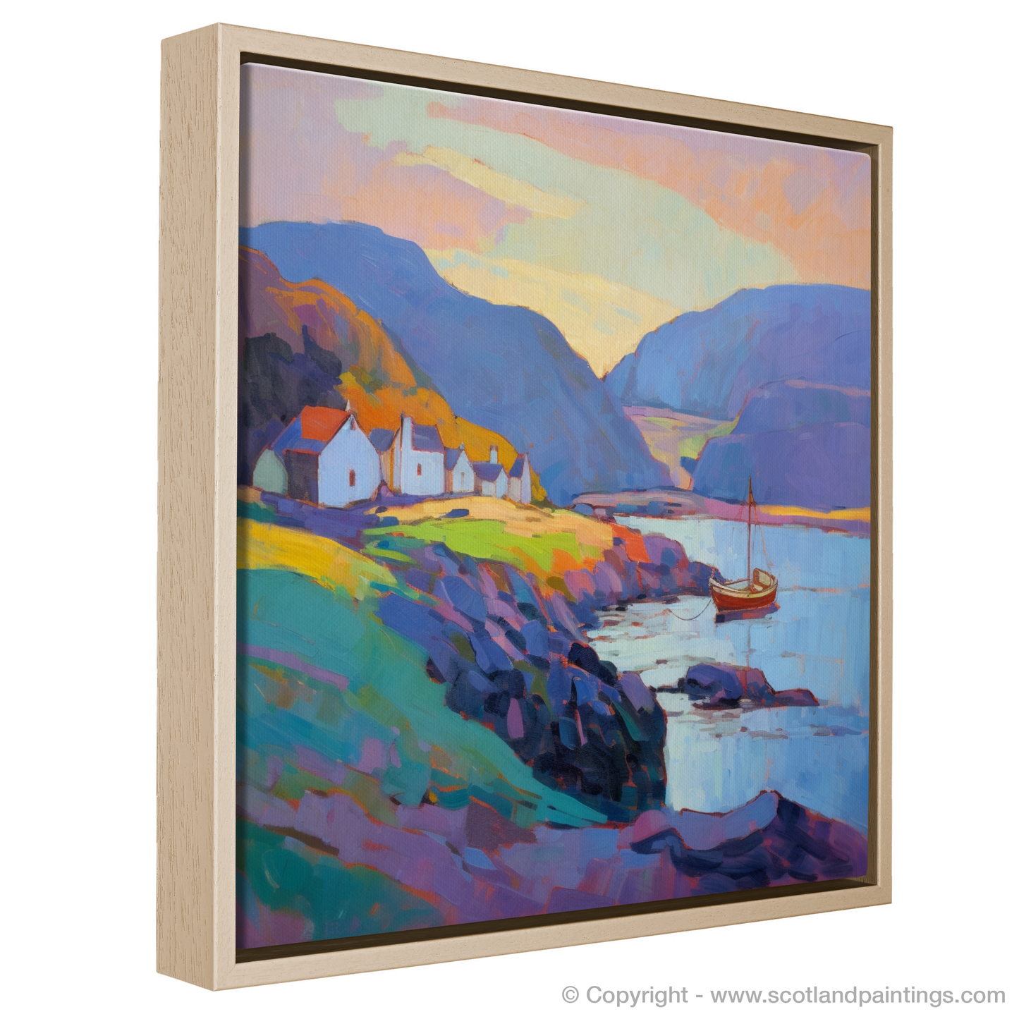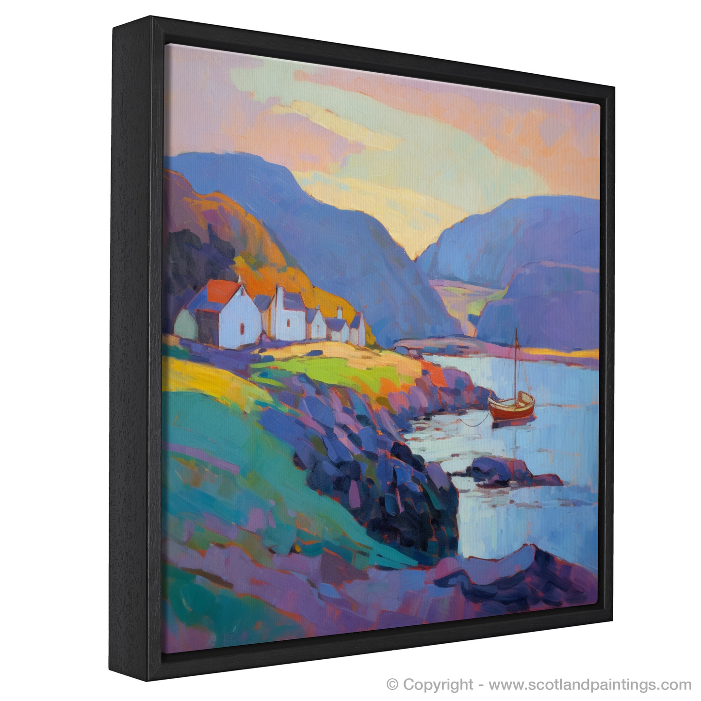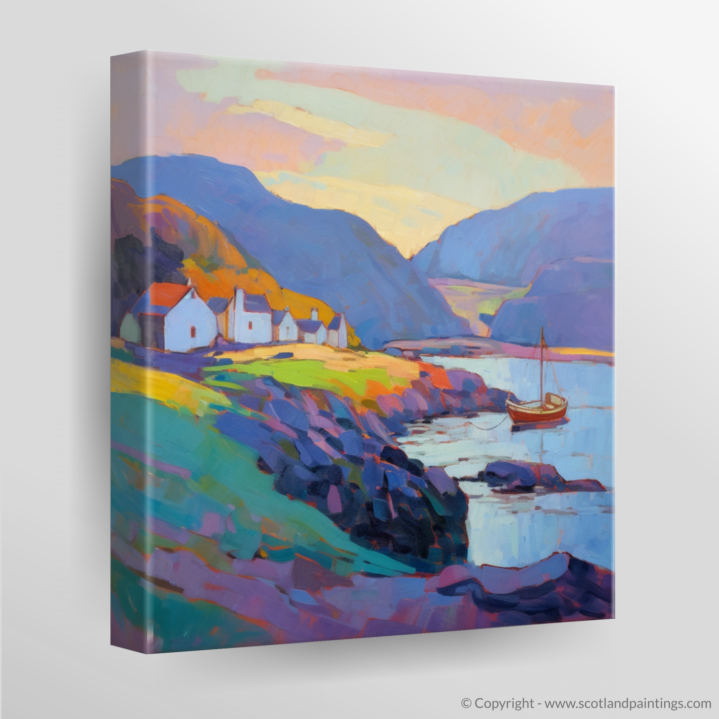 A solitary sailboat, basking in the remaining light, offers a focal point of reflection, evoking a sense of wanderlust and the timeless maritime spirit of the Scottish Harbours collection. Its sails, at rest, capture the essence of tranquillity that is echoed throughout the landscape, where the delicate play of shadows and light dance across the water's surface, creating a symphony of colour that enchants and captivates.
