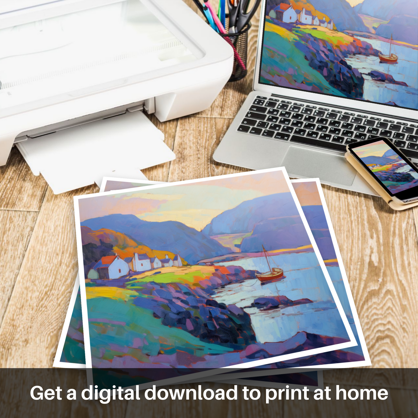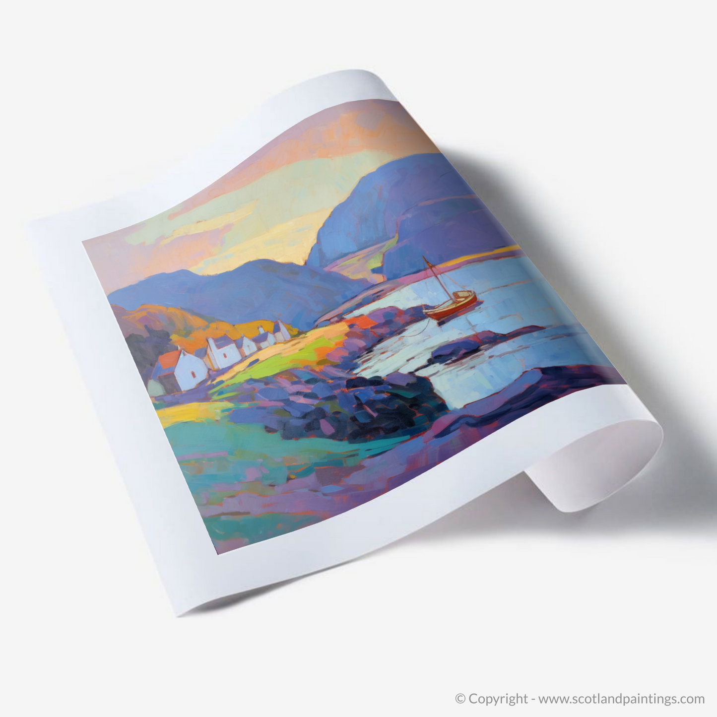 As the soft glow of dusk sets upon Pennan Harbour, this captivating print casts a warm and inviting spell inspired by the serene shores of Aberdeenshire. The scene is tenderly portrayed through sublime brushstrokes and textural depth typical of Impressionism, with passionate sweeps of lavender and peach illuminating the sky, setting a tranquil pace for viewers to unwind and imagine the gentle ebb and flow of the tides.