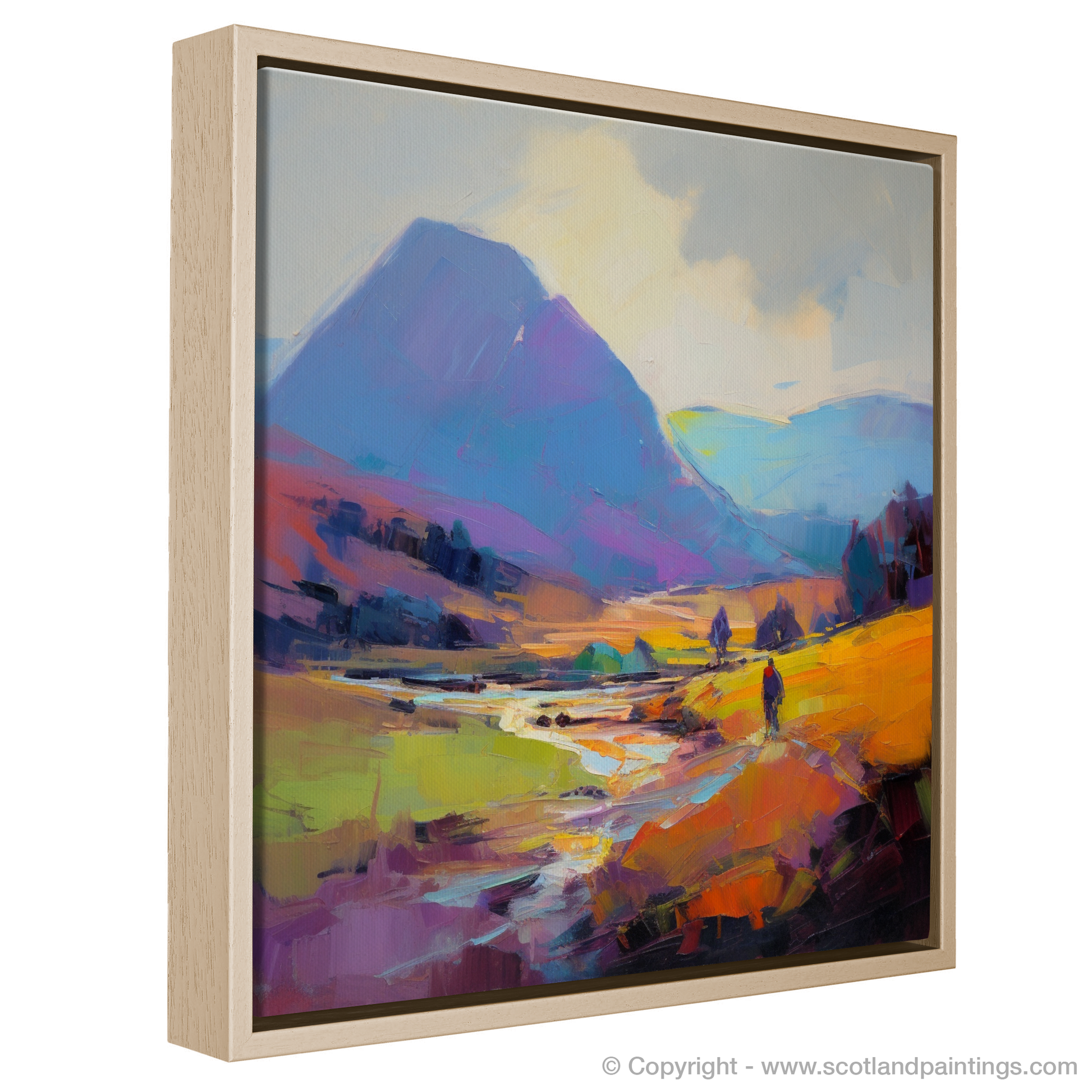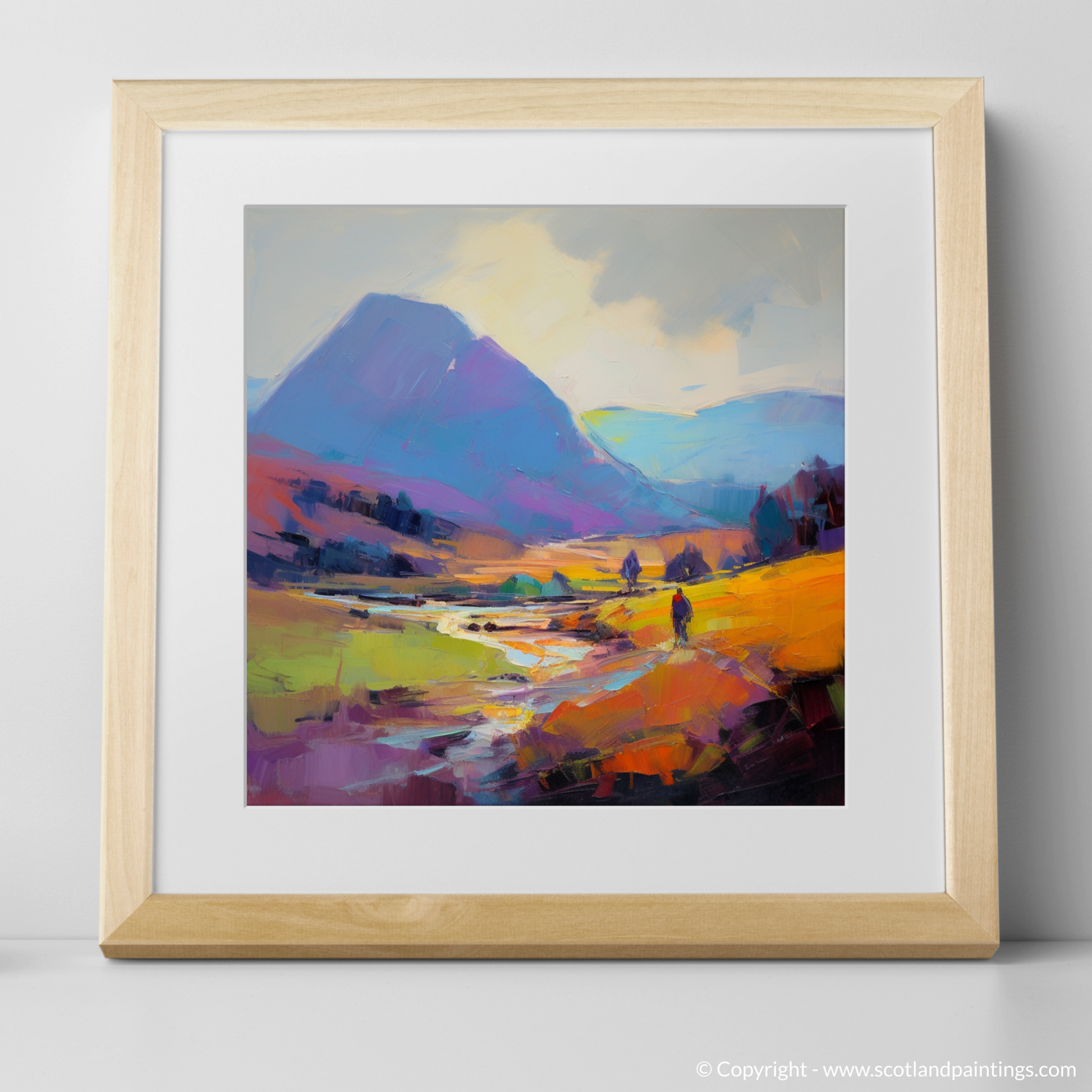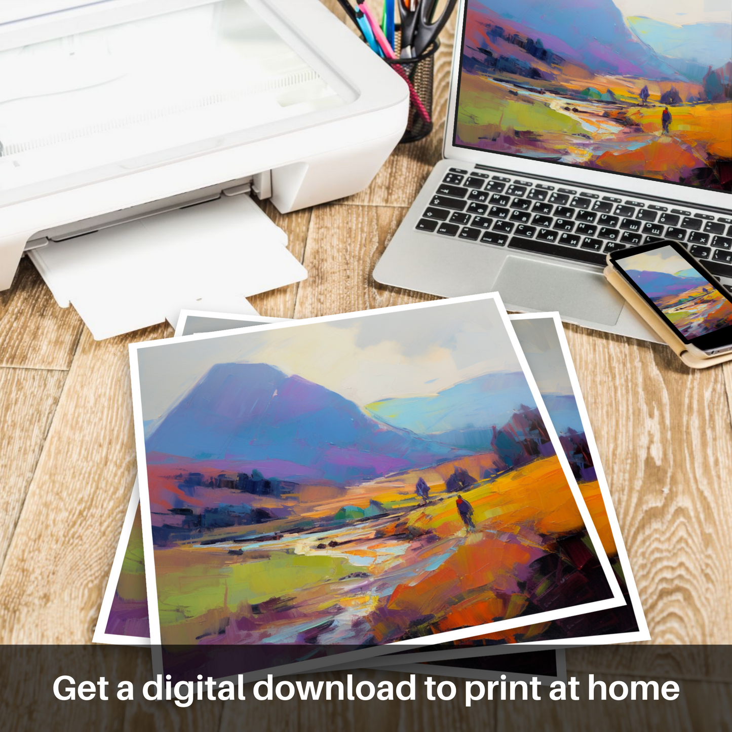 Imagine stepping into a vivid tapestry of colour, where the wild heart of Scotland is captured in bold strokes and a harmony of hues that dance across the canvas. This expressionist rendering of hikers traversing the rugged beauty of Glencoe in the full bloom of summer is a visual ode to adventure and the great outdoors.
