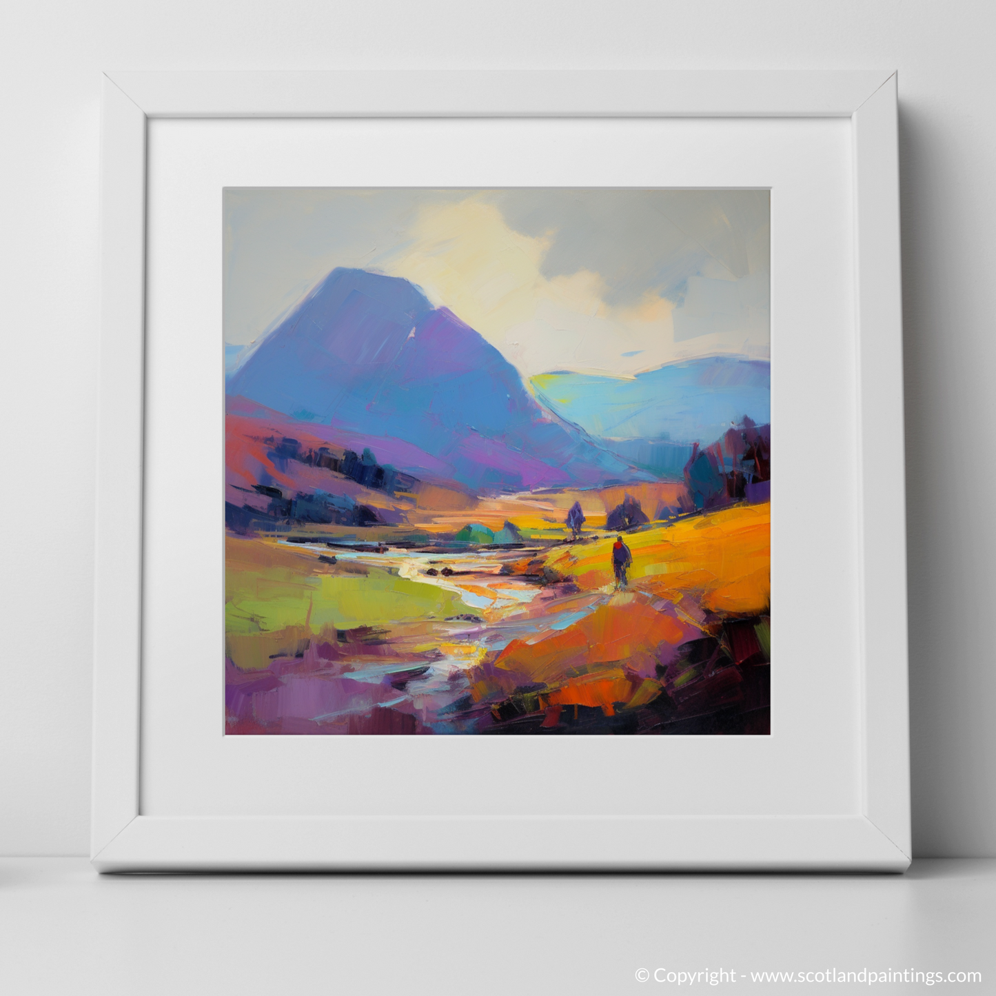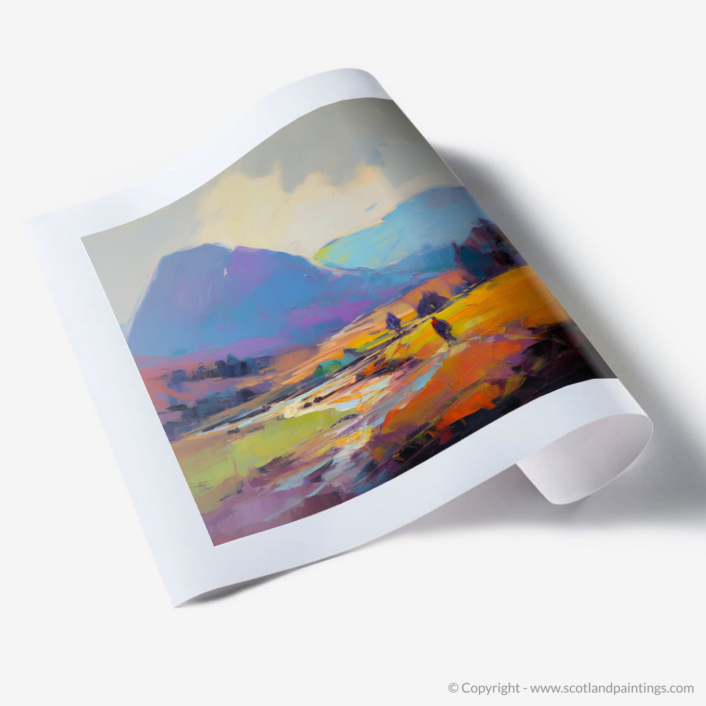 With its vibrant palette, the print embodies the raw energy of the Highlands, as golden sunshine bathes heather-strewn hills and the deep blues of distant mountains meld with the sky. Broad, impulsive brushwork imbues the landscape with movement, conveying the blustery winds that sweep through valleys and over peaks.