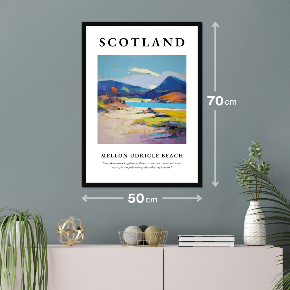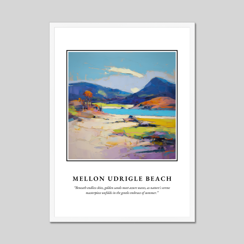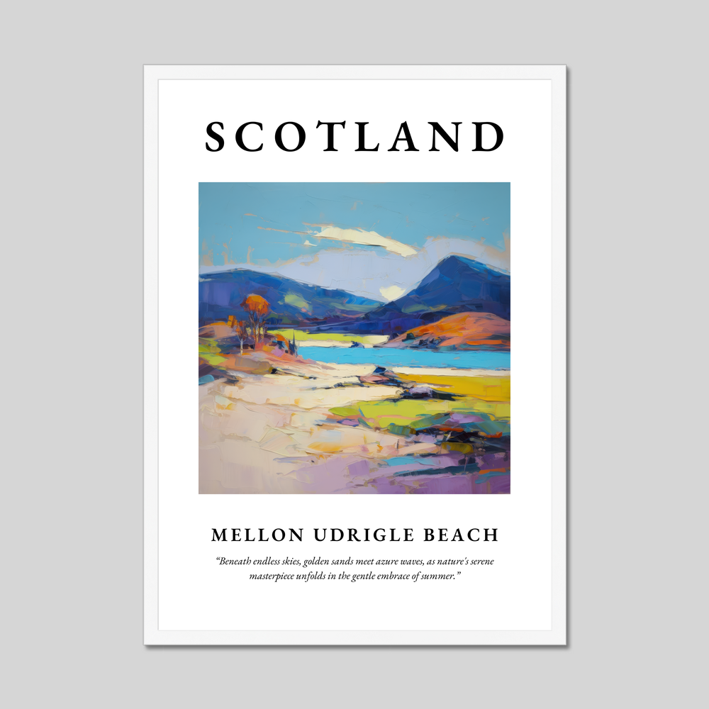 This poster not only encapsulates the serene elegance of Mellon Udrigle Beach but also serves as a cherished keepsake of Scotland’s natural wonders. It's more than just a visual delight; it’s an invitation to escape into a serene Scottish summer, wherever you may be.