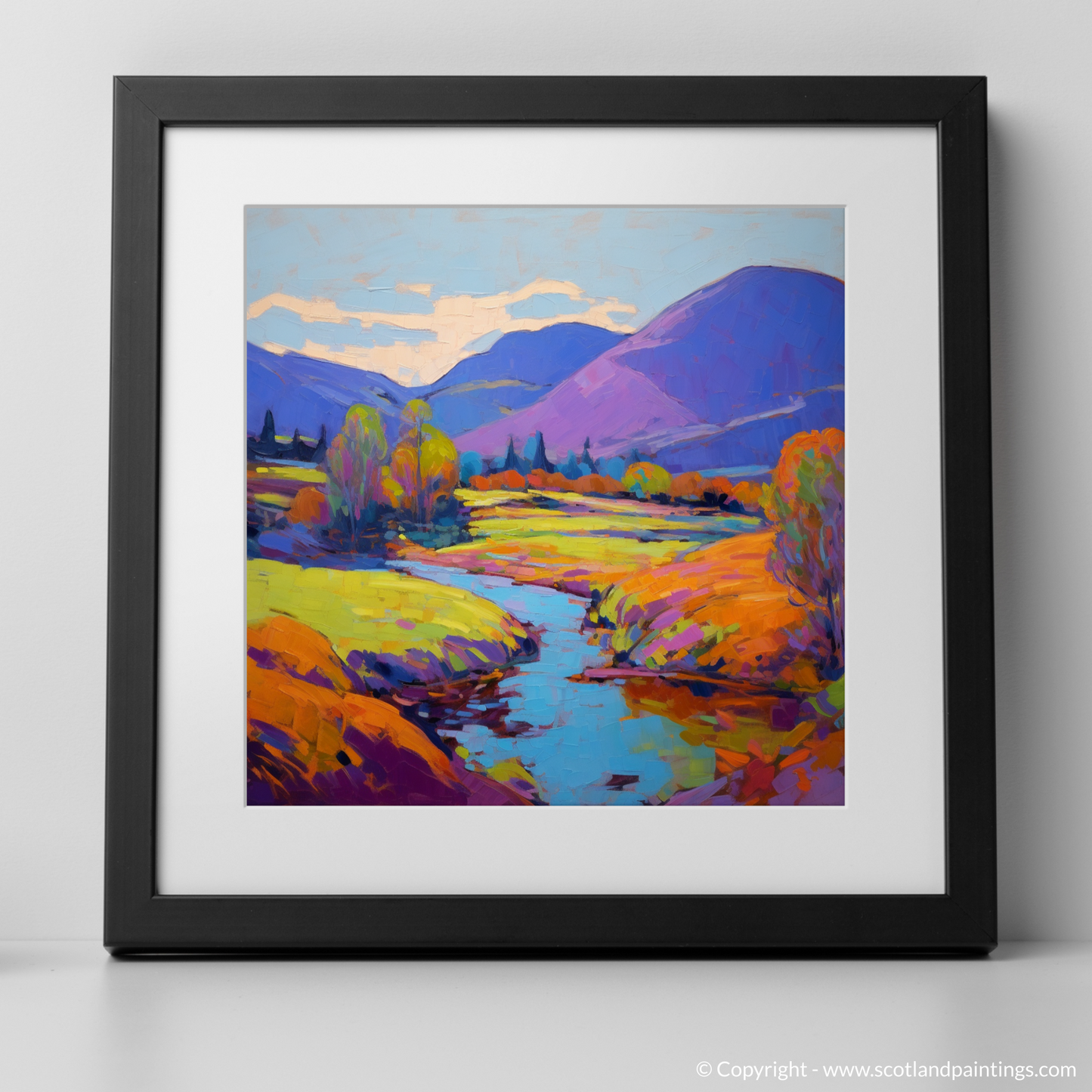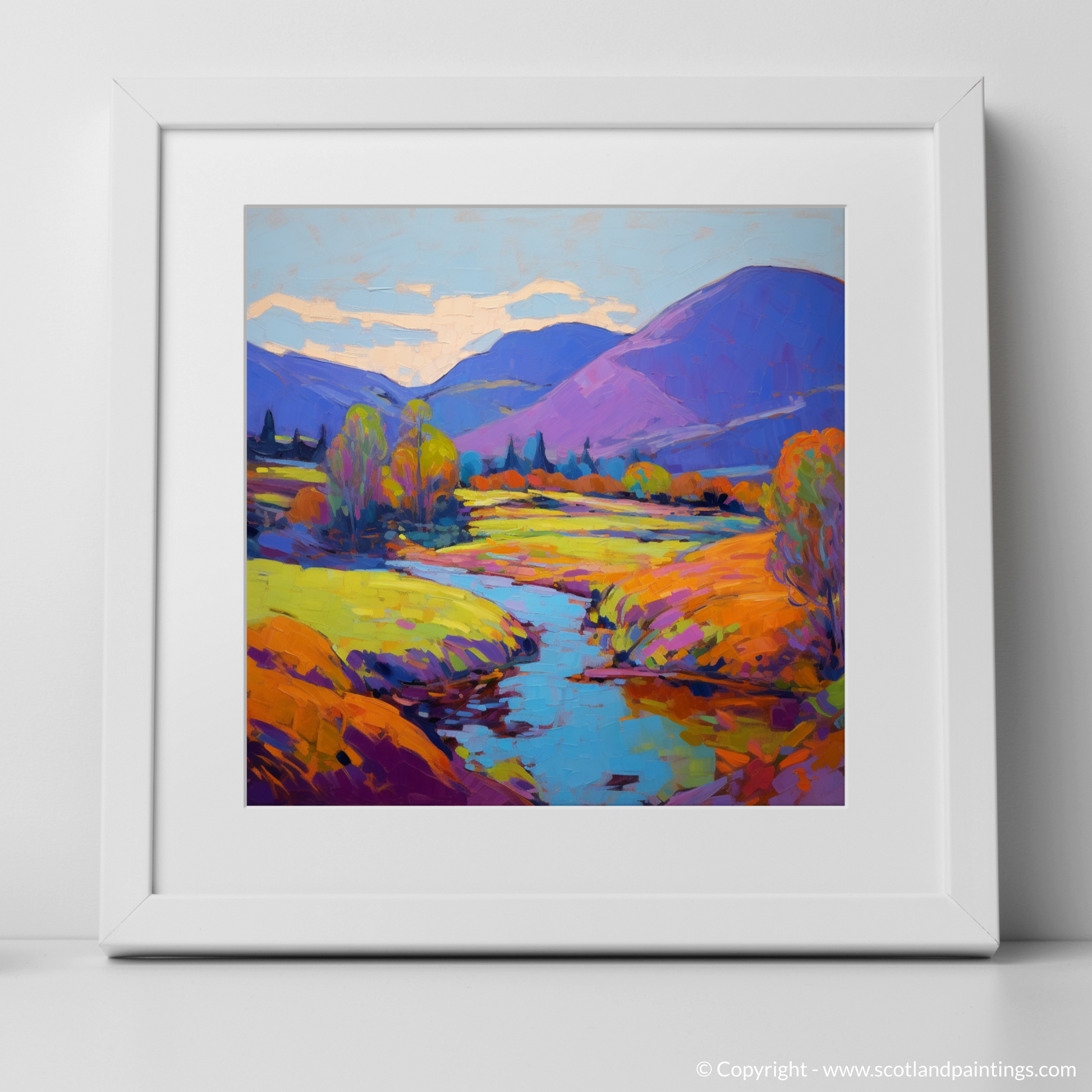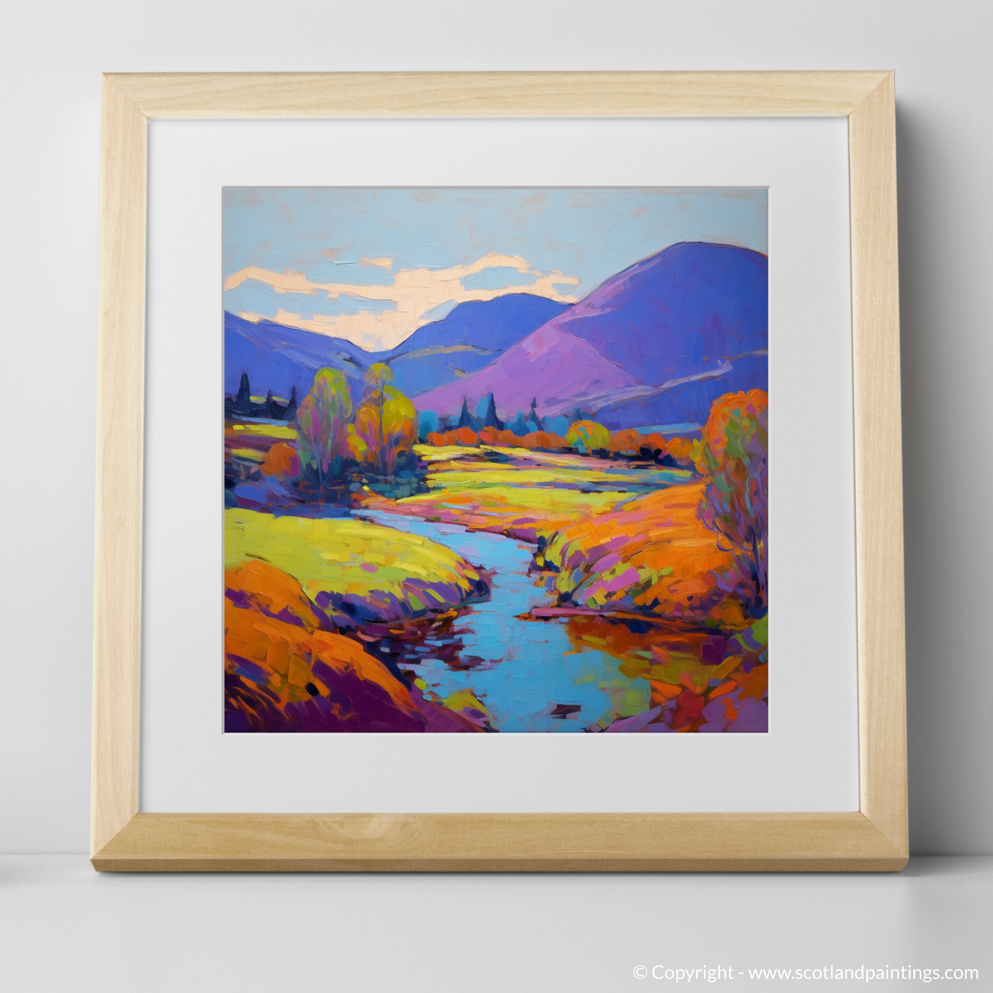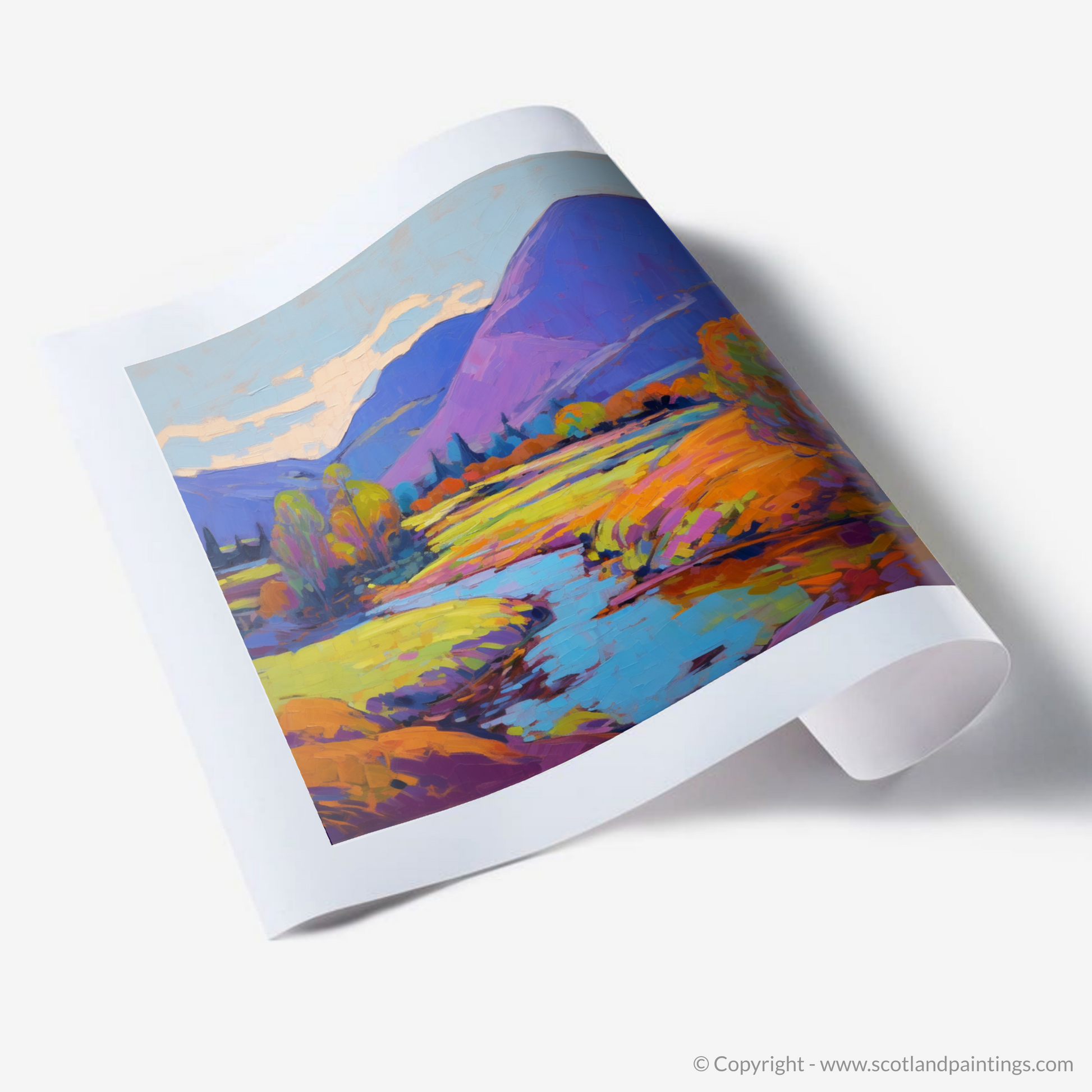 Step into the vibrant serenity of a Highland summer with this exquisite print, capturing the essence of Glen Roy in a blaze of colour and light. Bold, expressive brushstrokes convey the rolling hills in shades of purples and blues, while the foreground is alight with a tapestry of warm yellows, oranges, and greens, reminiscent of the sun-kissed foliage.
