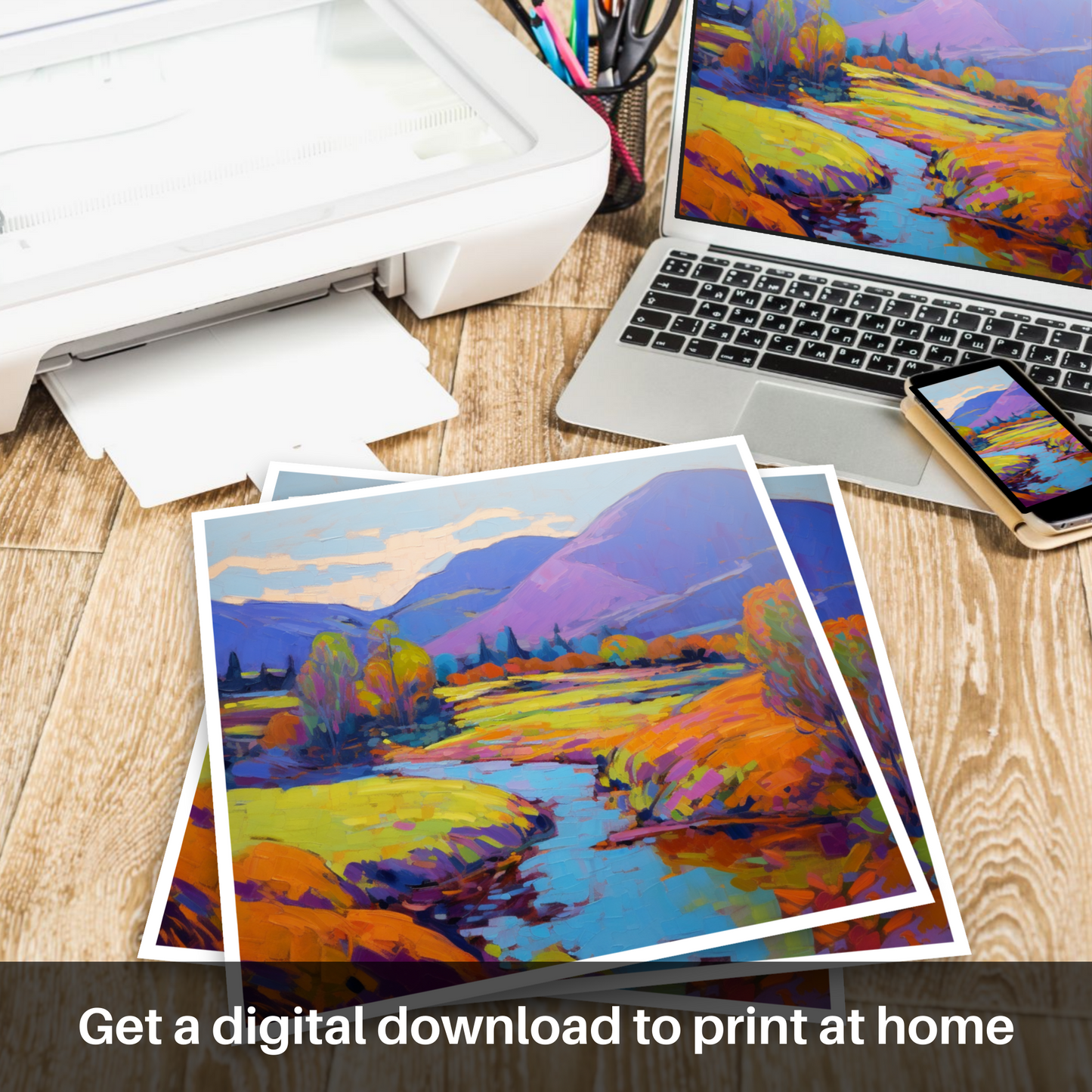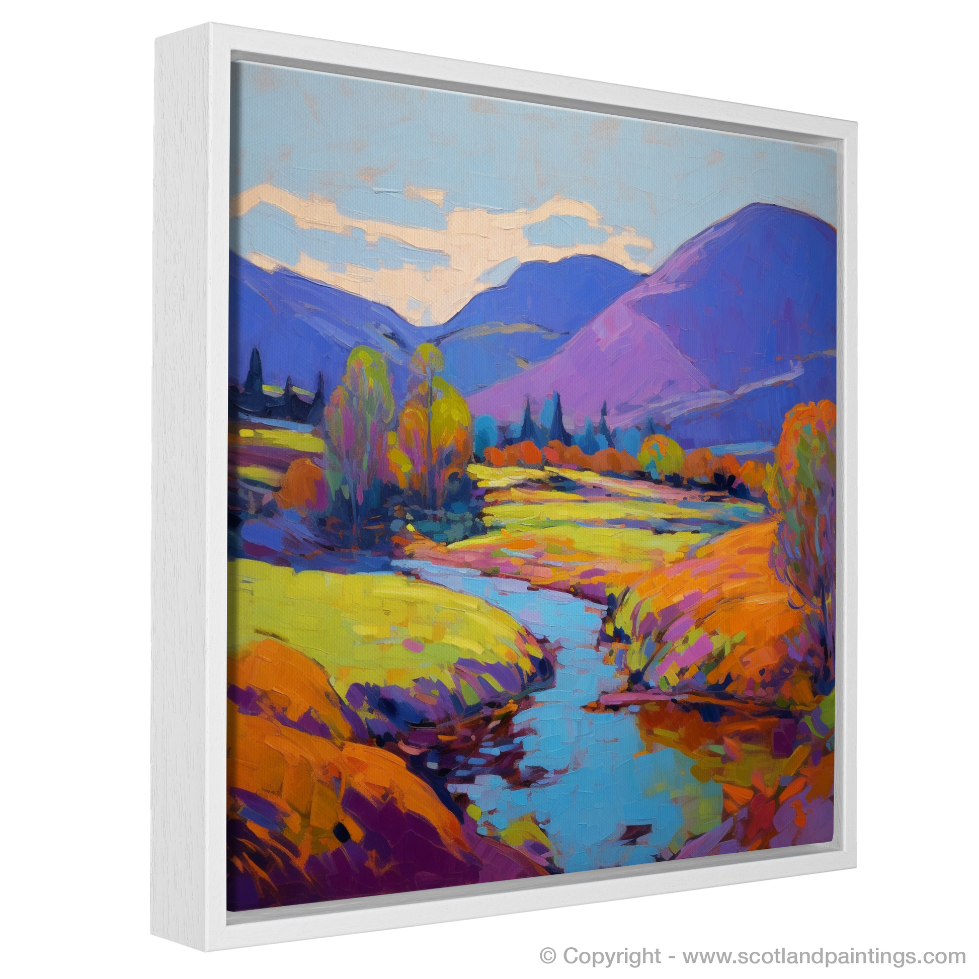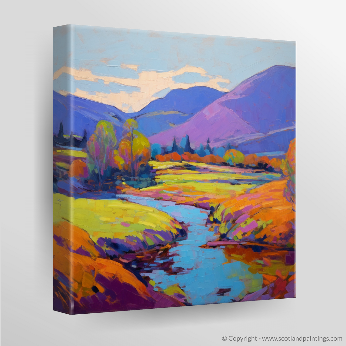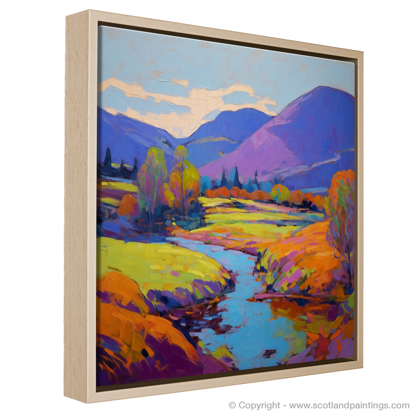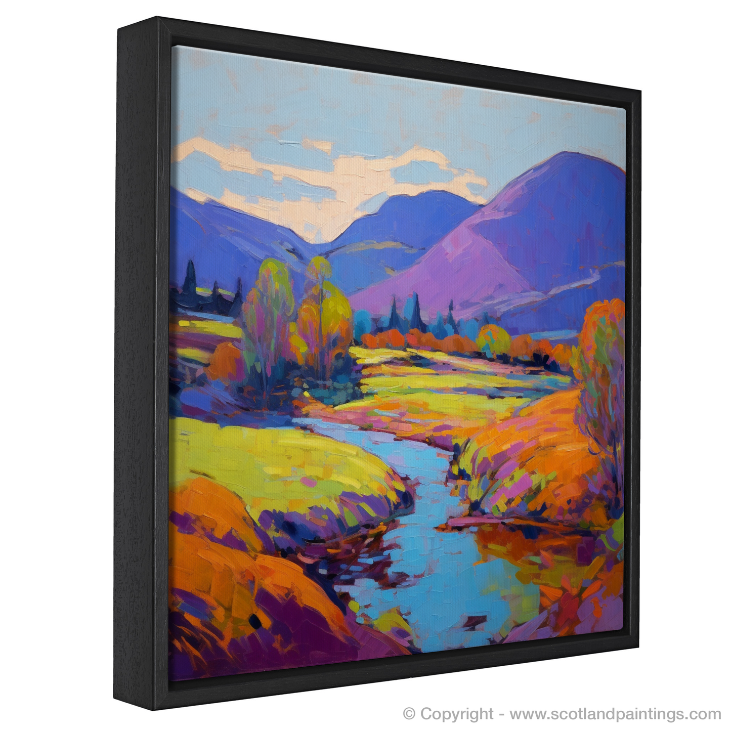 Step into the vibrant serenity of a Highland summer with this exquisite print, capturing the essence of Glen Roy in a blaze of colour and light. Bold, expressive brushstrokes convey the rolling hills in shades of purples and blues, while the foreground is alight with a tapestry of warm yellows, oranges, and greens, reminiscent of the sun-kissed foliage.