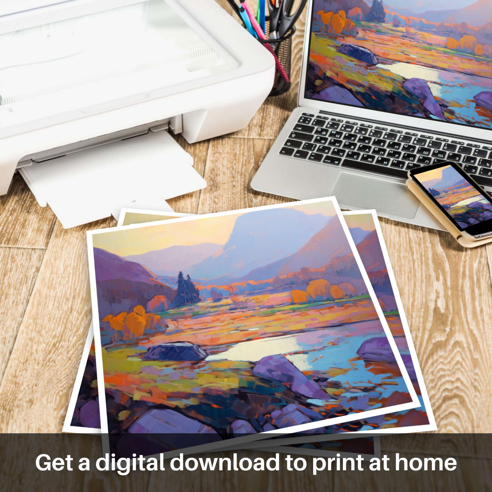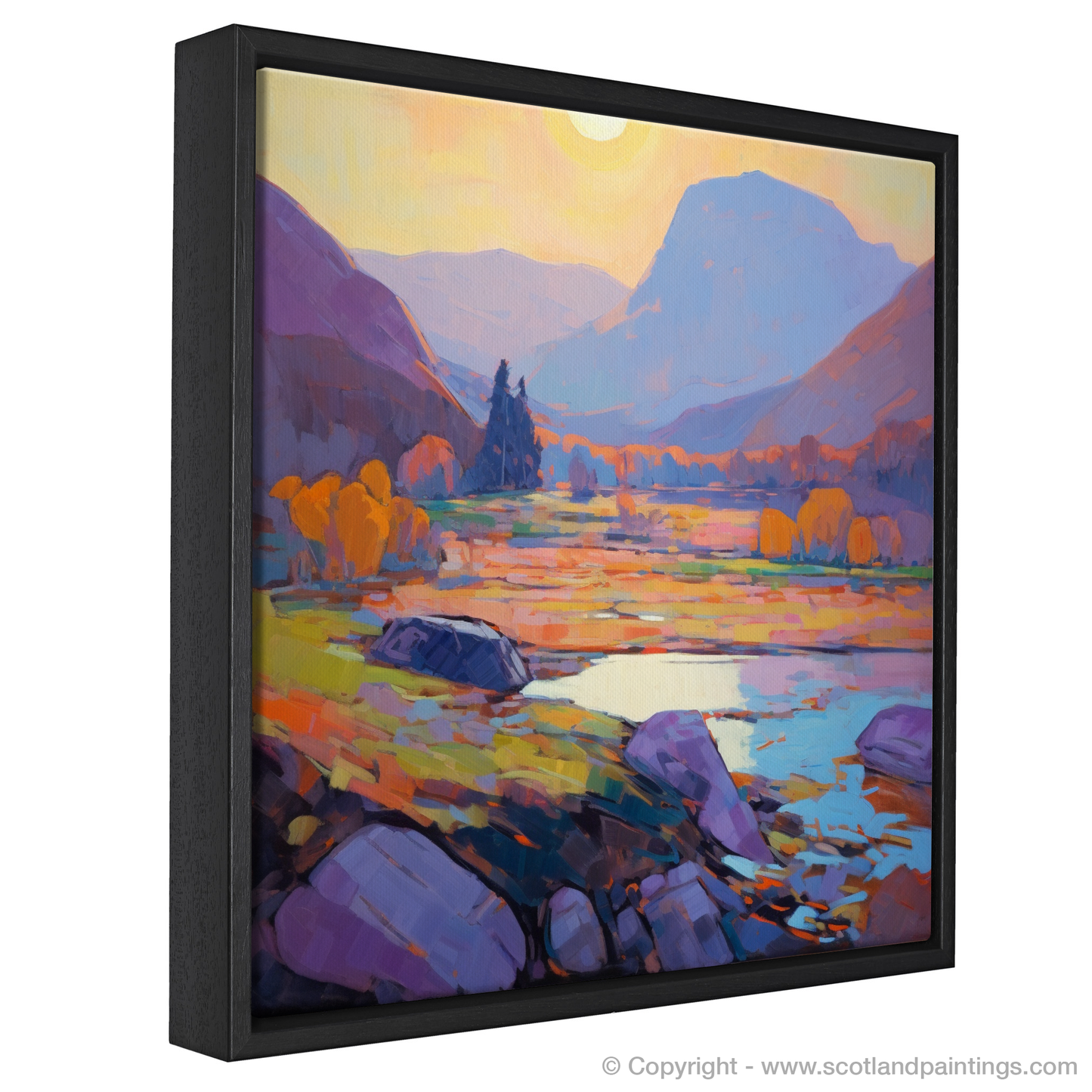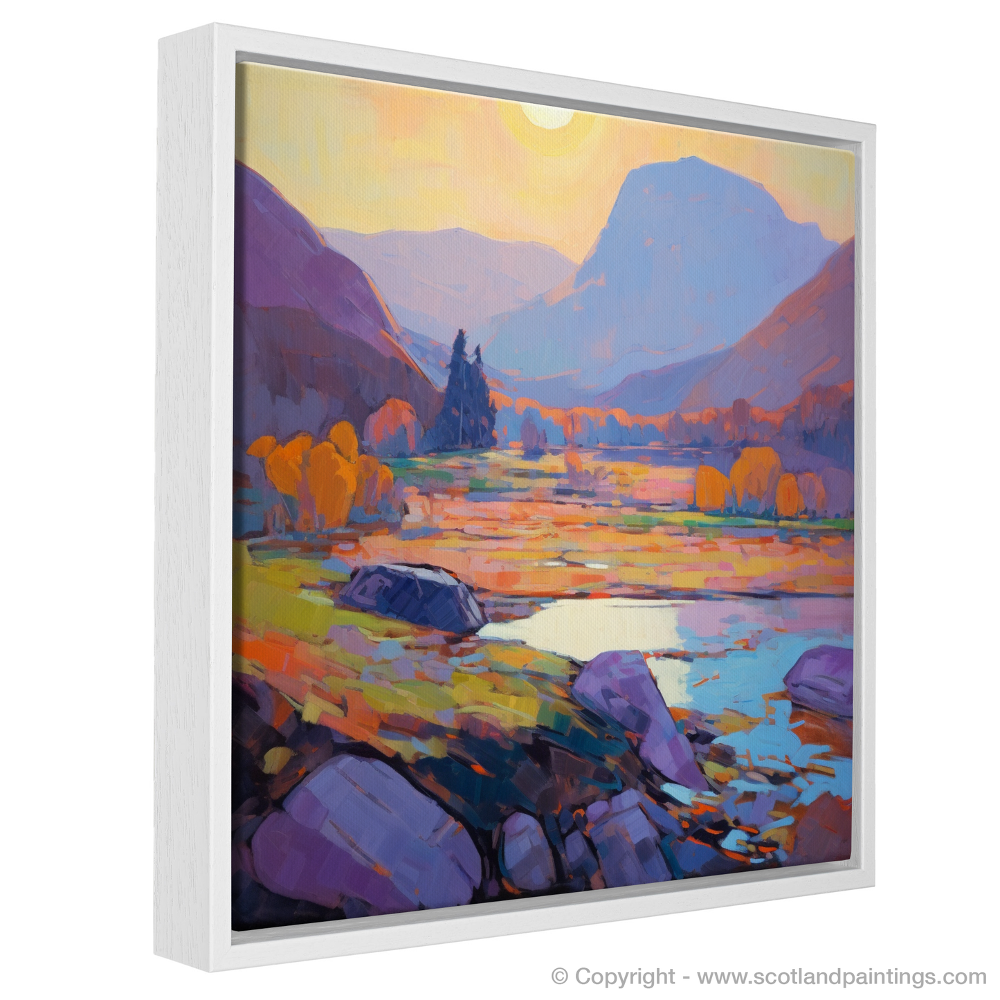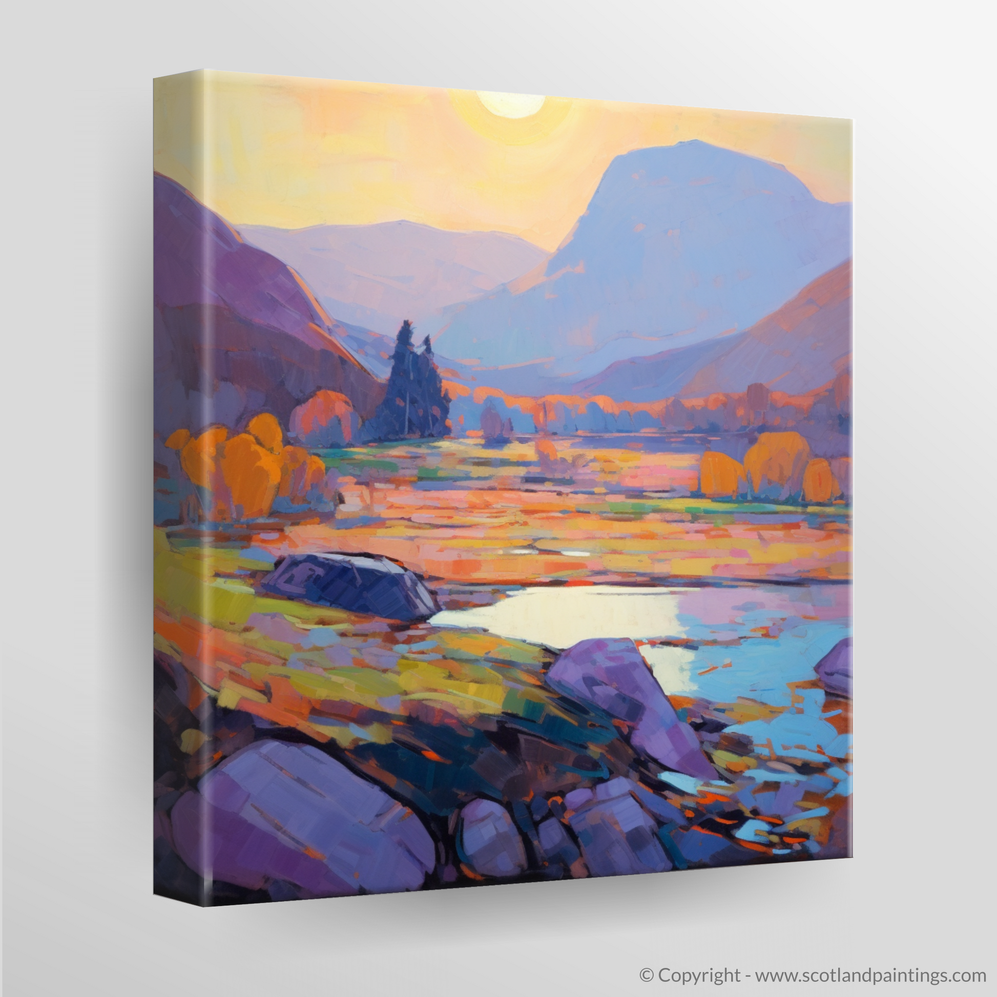 Sweeping brushstrokes in a robust palette of purples, oranges, and yellows conjure the serene atmosphere just as day yields to dusk. The grandeur of the Highlands is rendered in softened edges and a symphony of colours that echo the natural gradients found within these ancient lands.