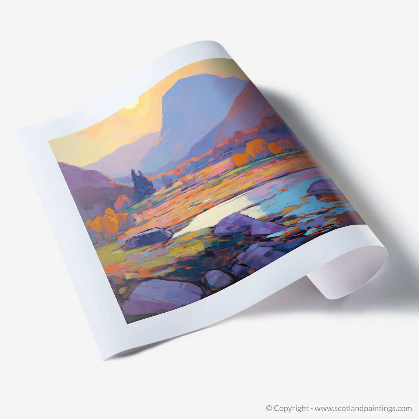 Immerse yourself in the ethereal beauty of Scotland's rugged terrain with this evocative print, inspired by the majestic glens of Glencoe. Captured in a style reminiscent of the Impressionist masters, this piece embodies the essence of nature's transient moments as the warm embrace of the sunset kisses craggy rocks and delicate heath.