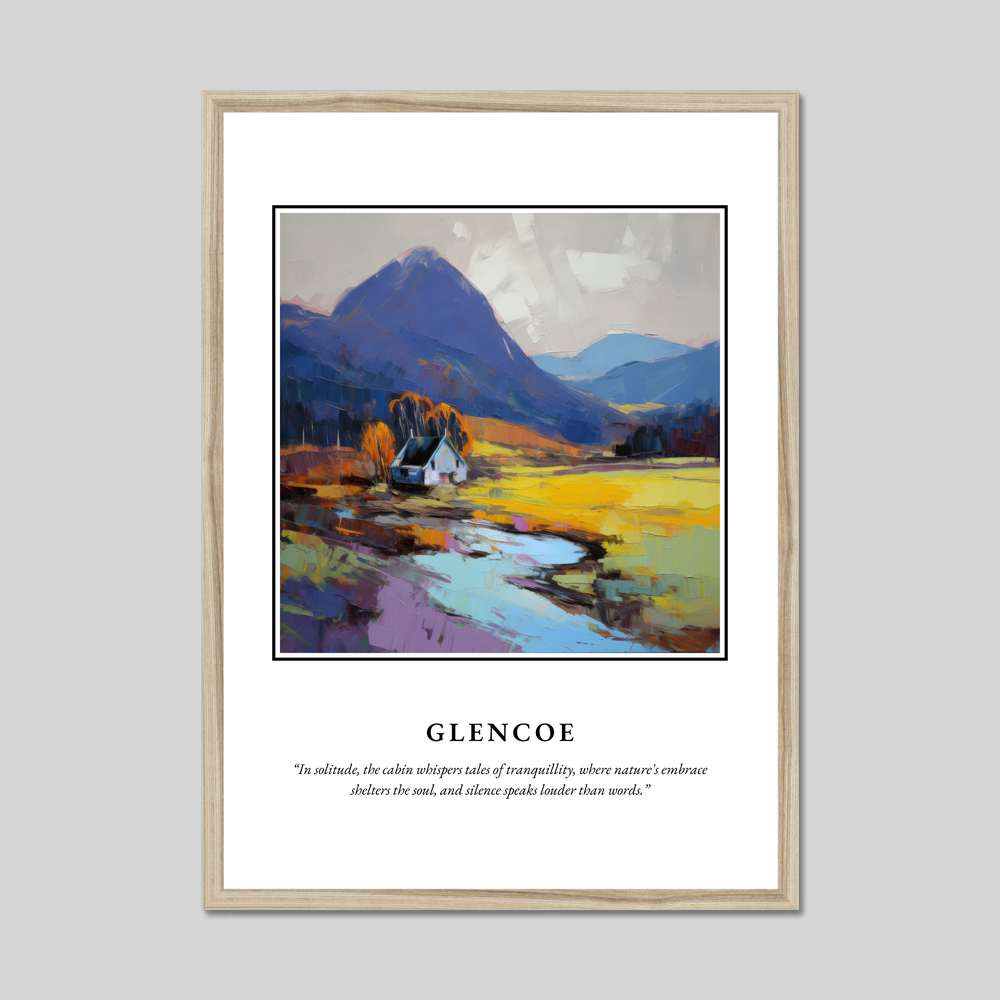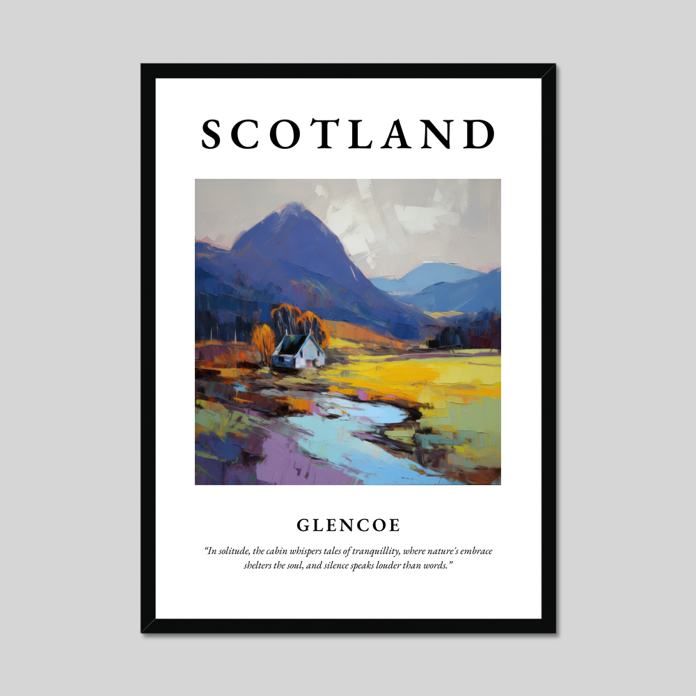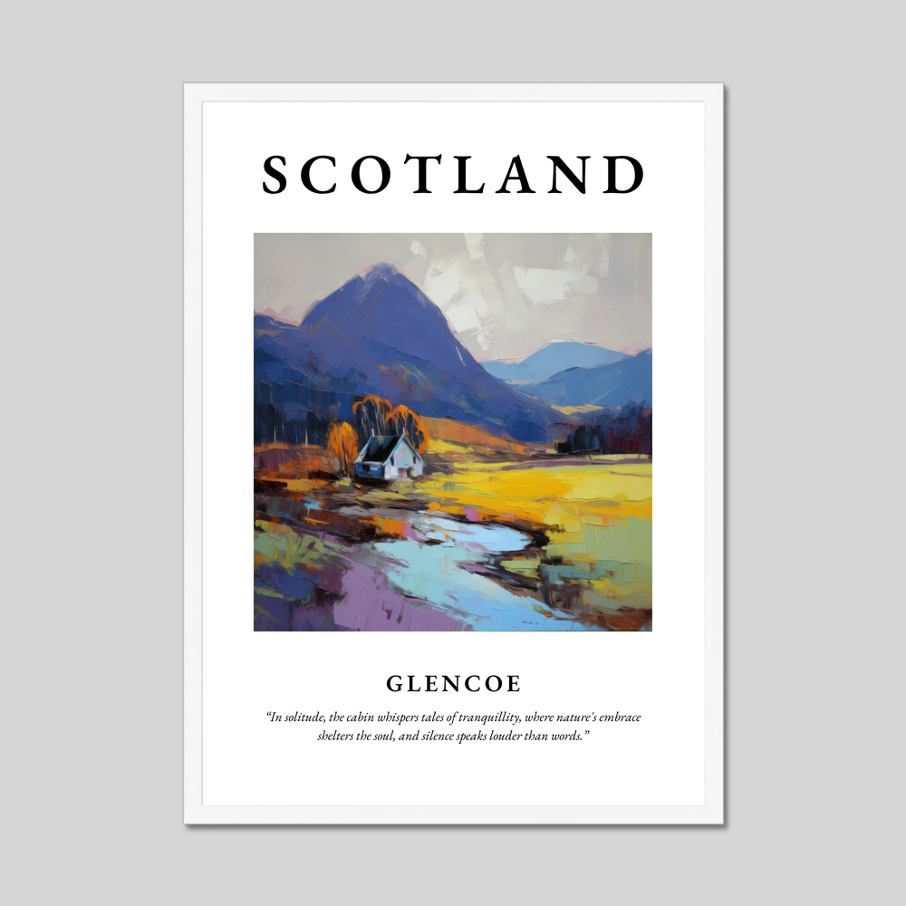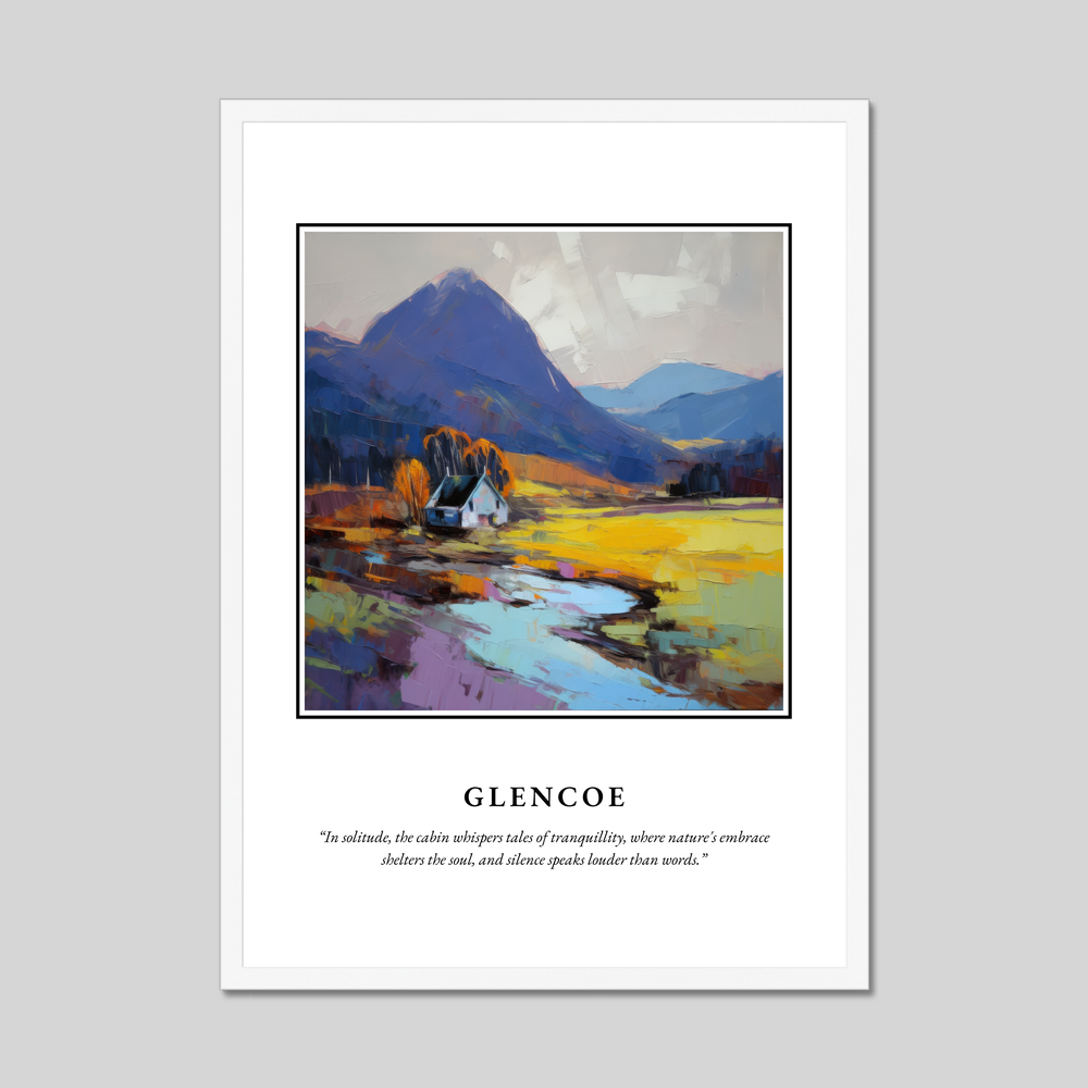 At the top, the word “SCOTLAND” commands attention with its bold presence, setting the stage for the stunning Expressionist painting below. The landscape captures the ethereal beauty of Glencoe—a place where the dramatic interplay of light and colour conjures emotion and invites introspection. The essence of the landscape is brought to life with vibrant brushstrokes, portraying a solitary cabin nestled amidst lush fields and towering mountains. This striking use of colour and form embodies the emotional intensity of Expressionism, captivating the viewer with its depth and dynamism.