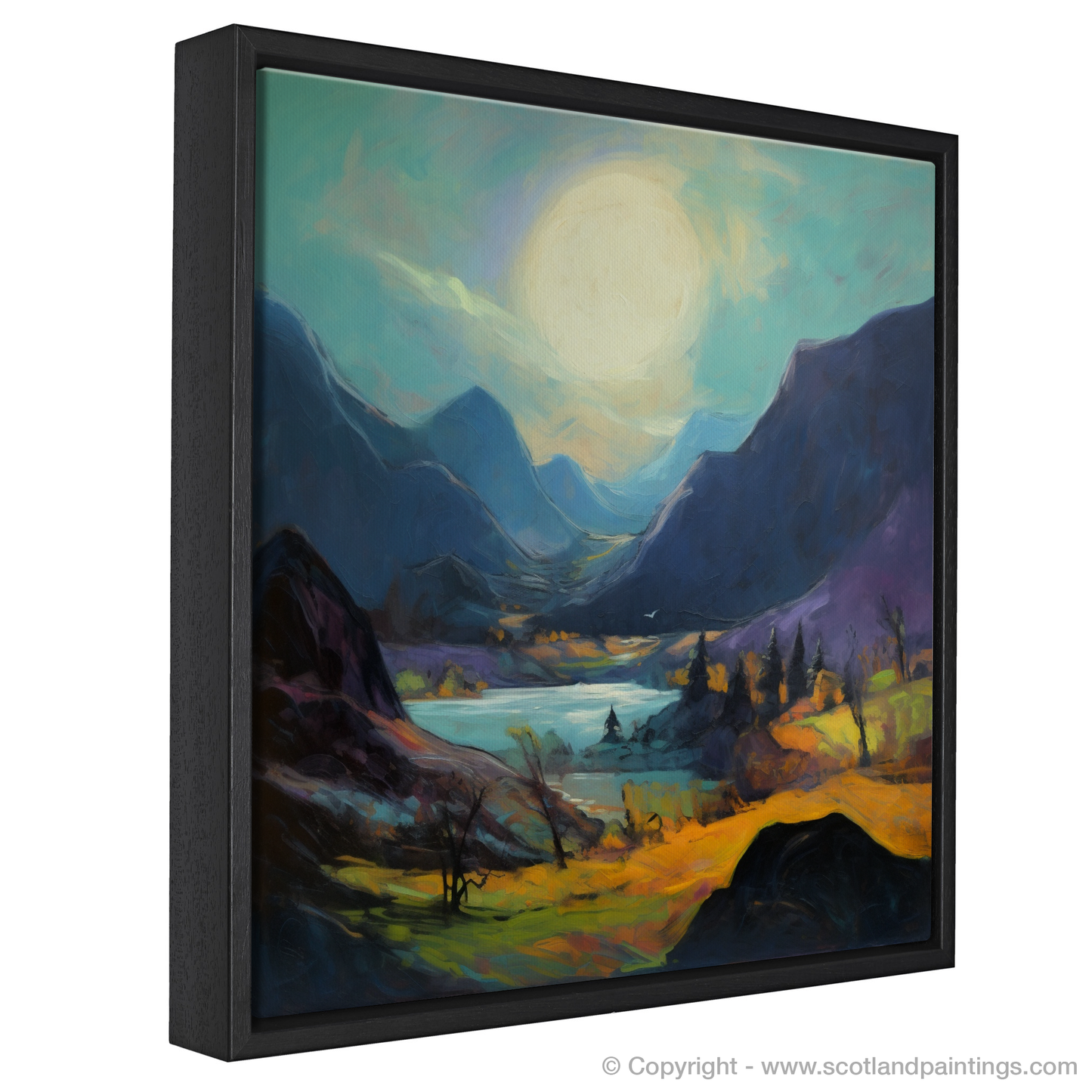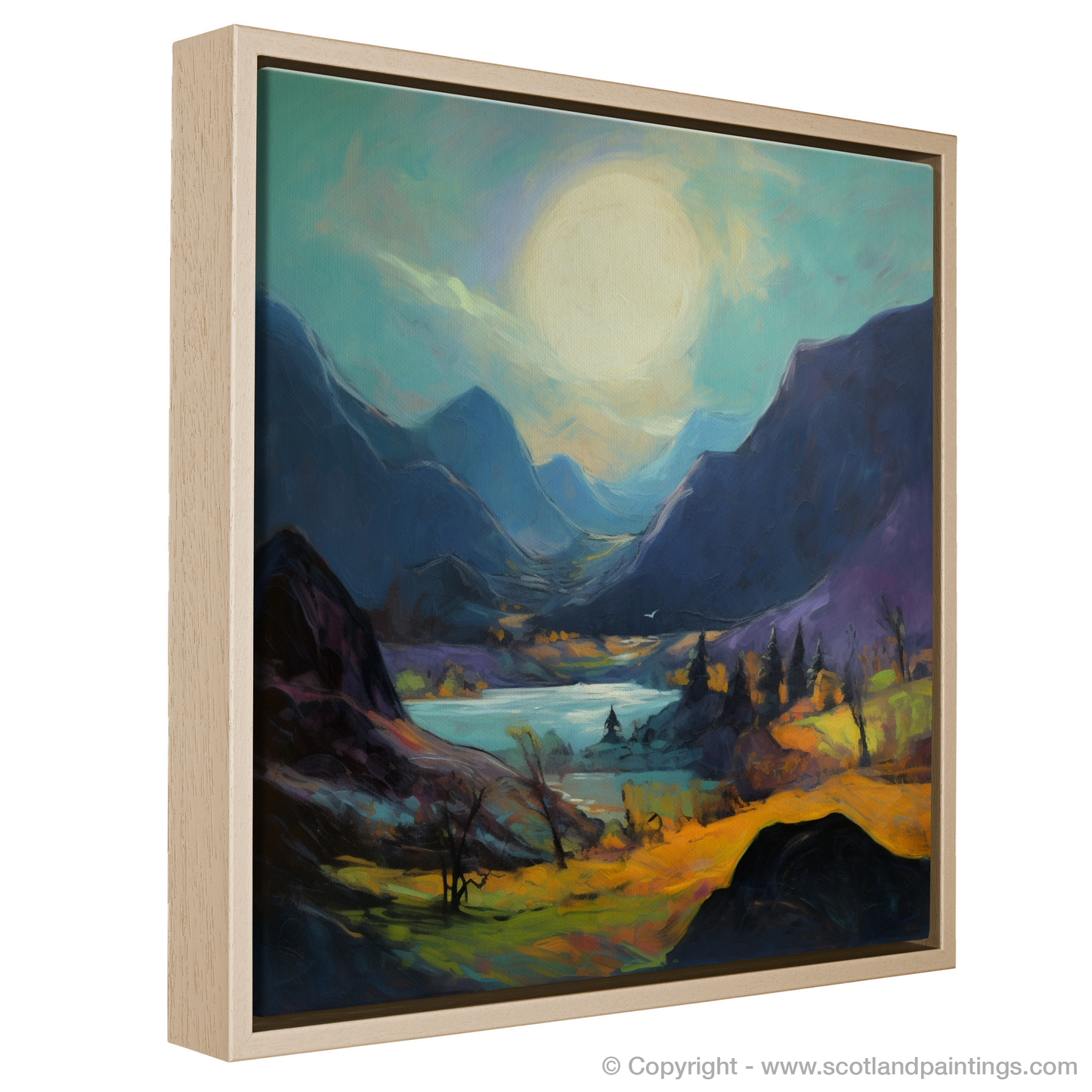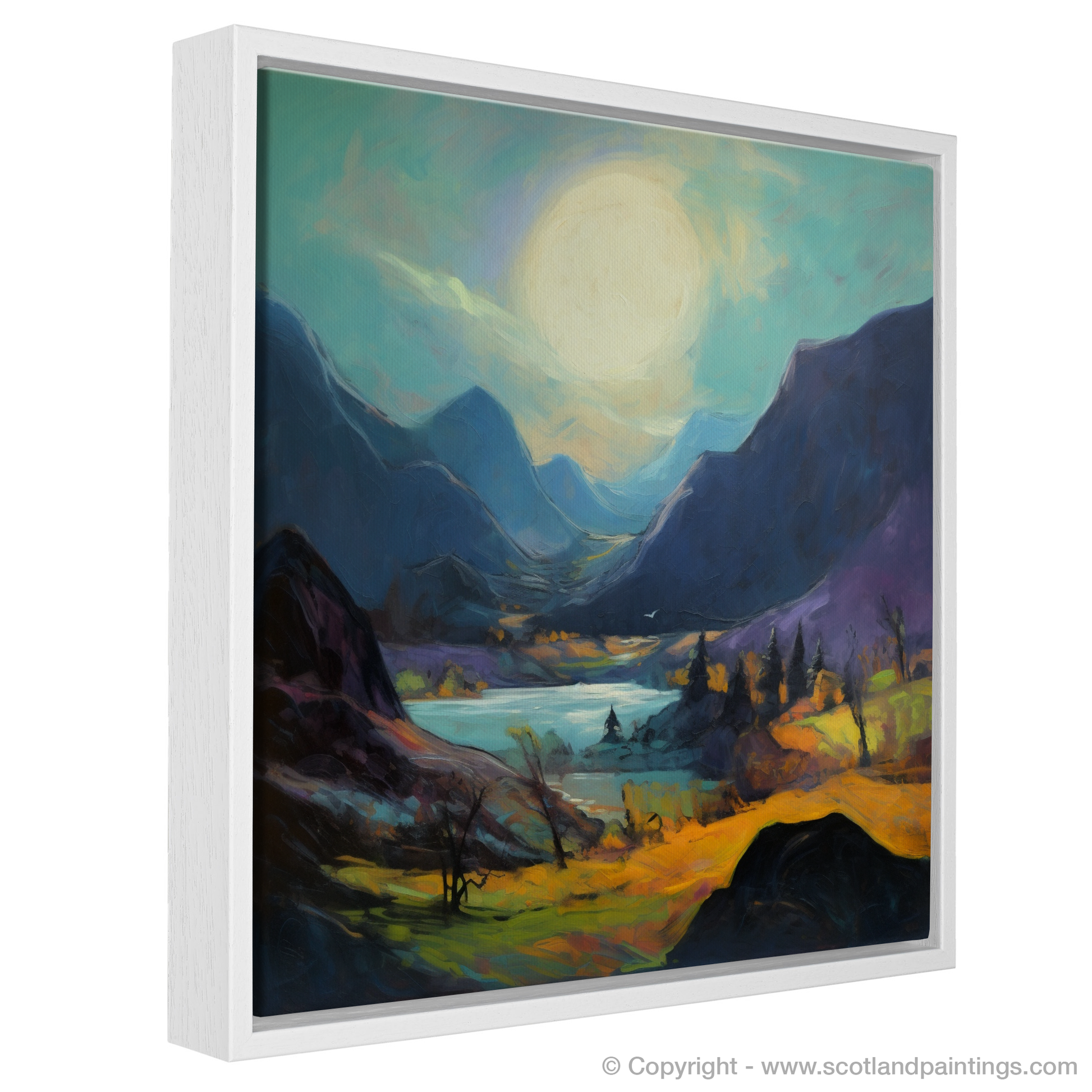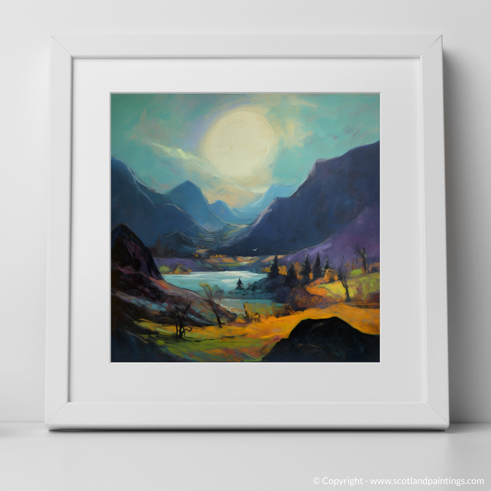 A luminous orb, reminiscent of a moon but with an unusual intensity, presides over the scurrying clouds, casting a soft glow over the moody mountains that whisper tales of ancient secrets. Below, the waters of the loch stretch out like a pathway to the sublime, their stillness juxtaposed against the motion hinted at in the swirling heavens above.