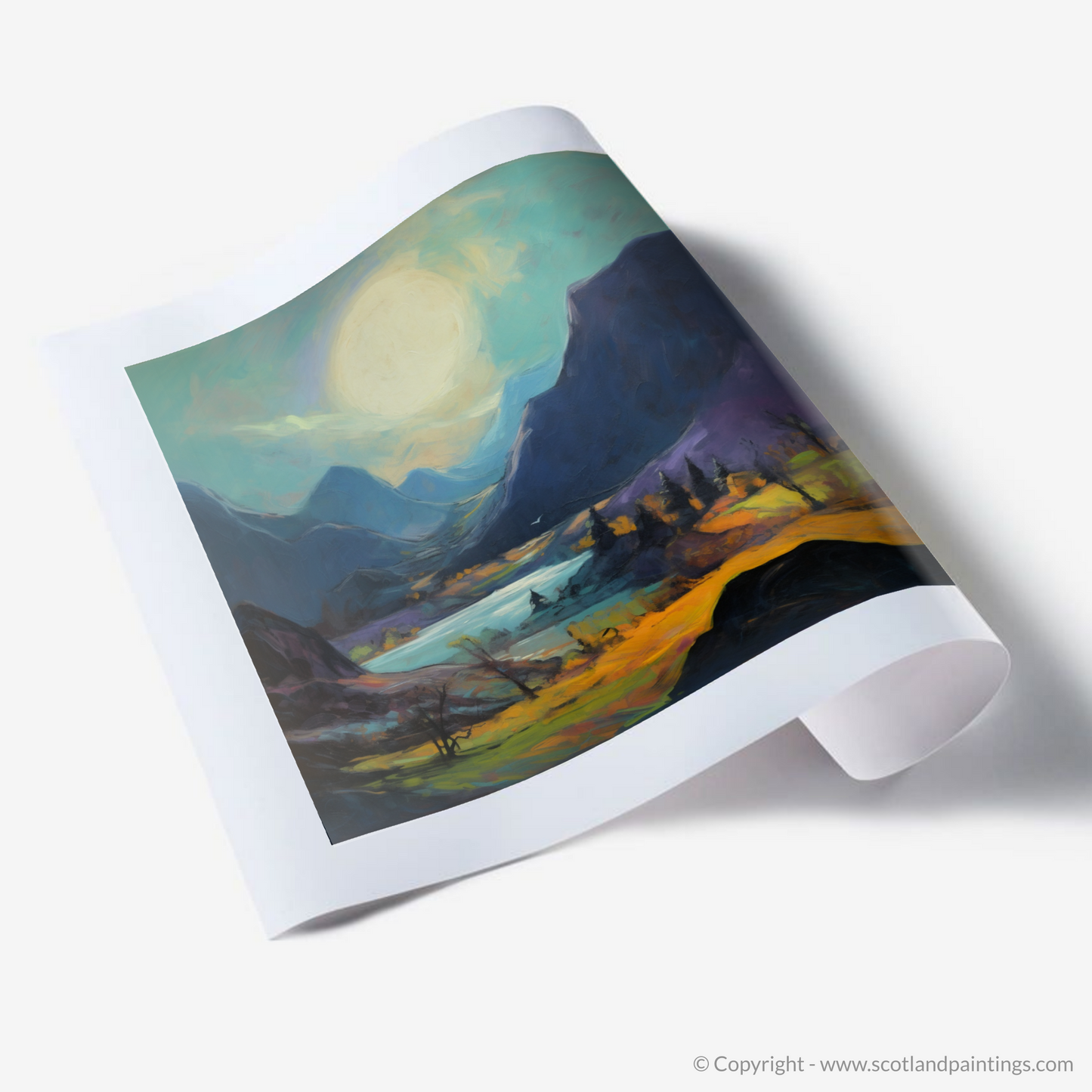 Amidst the wild, untamed beauty of the Scottish Coves, this captivating print invites the beholder into a world where the familiar rugged landscape of Loch Coruisk unfurls under the watch of a tempestuous and otherworldly sky. Enveloped in an eclectic palette that defies conventional depictions, the scenery merges the ethereal with the real, the tranquillity with the dramatic.