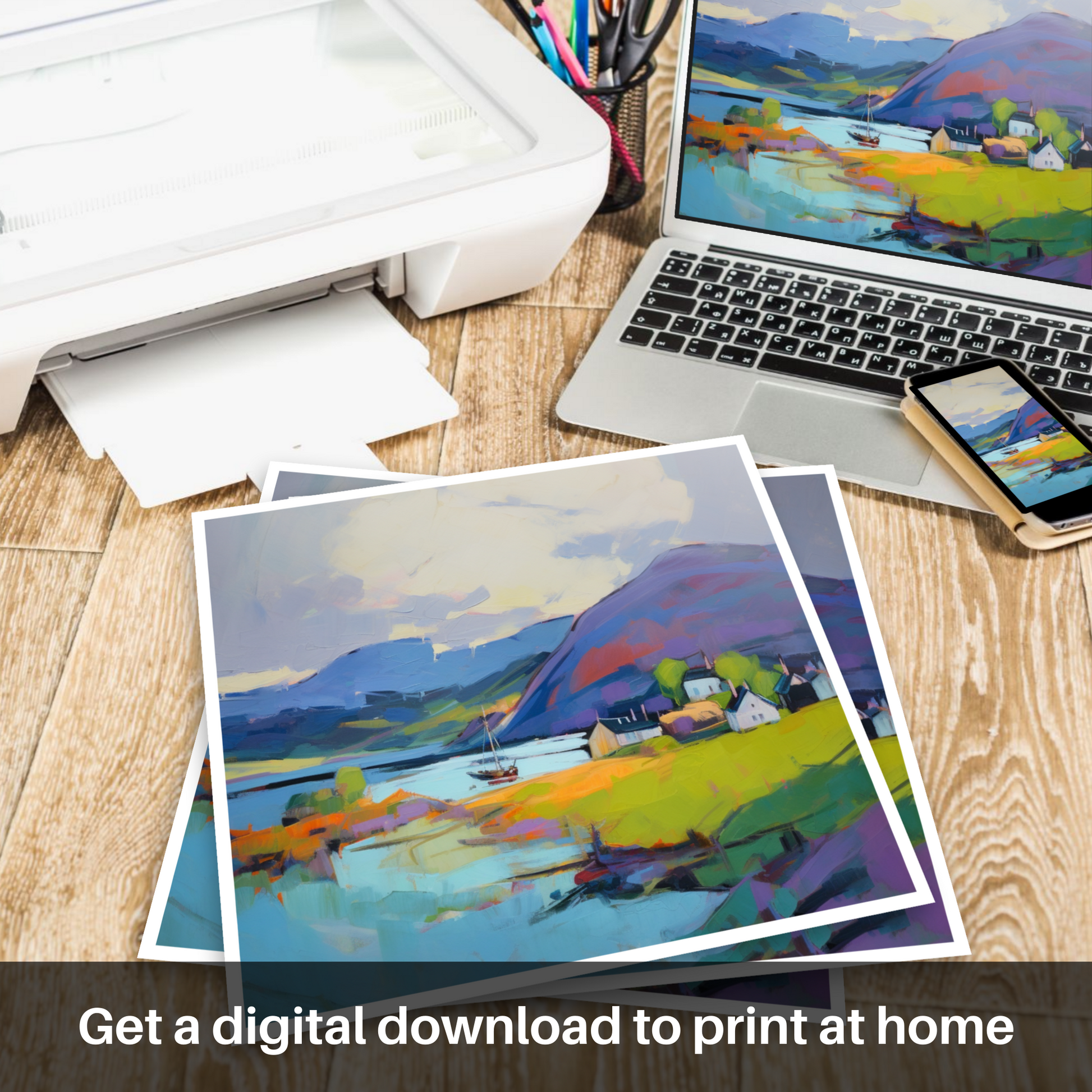 As if capturing a fleeting moment when light battles with impending darkness, this invigorating print showcases Gairloch Harbour enveloped by a dramatic, stormy sky. Embracing a modern style, the piece exudes vibrant energy through its bold use of colour and dynamic brushstrokes, which convey the untamed beauty of the Scottish Highlands.