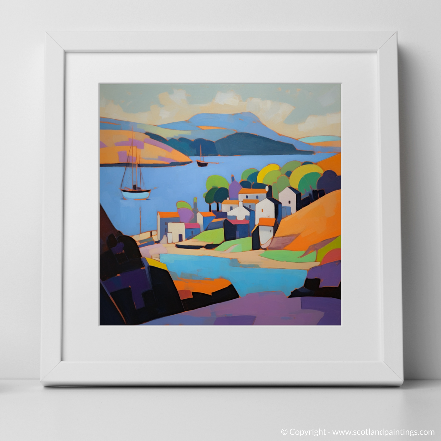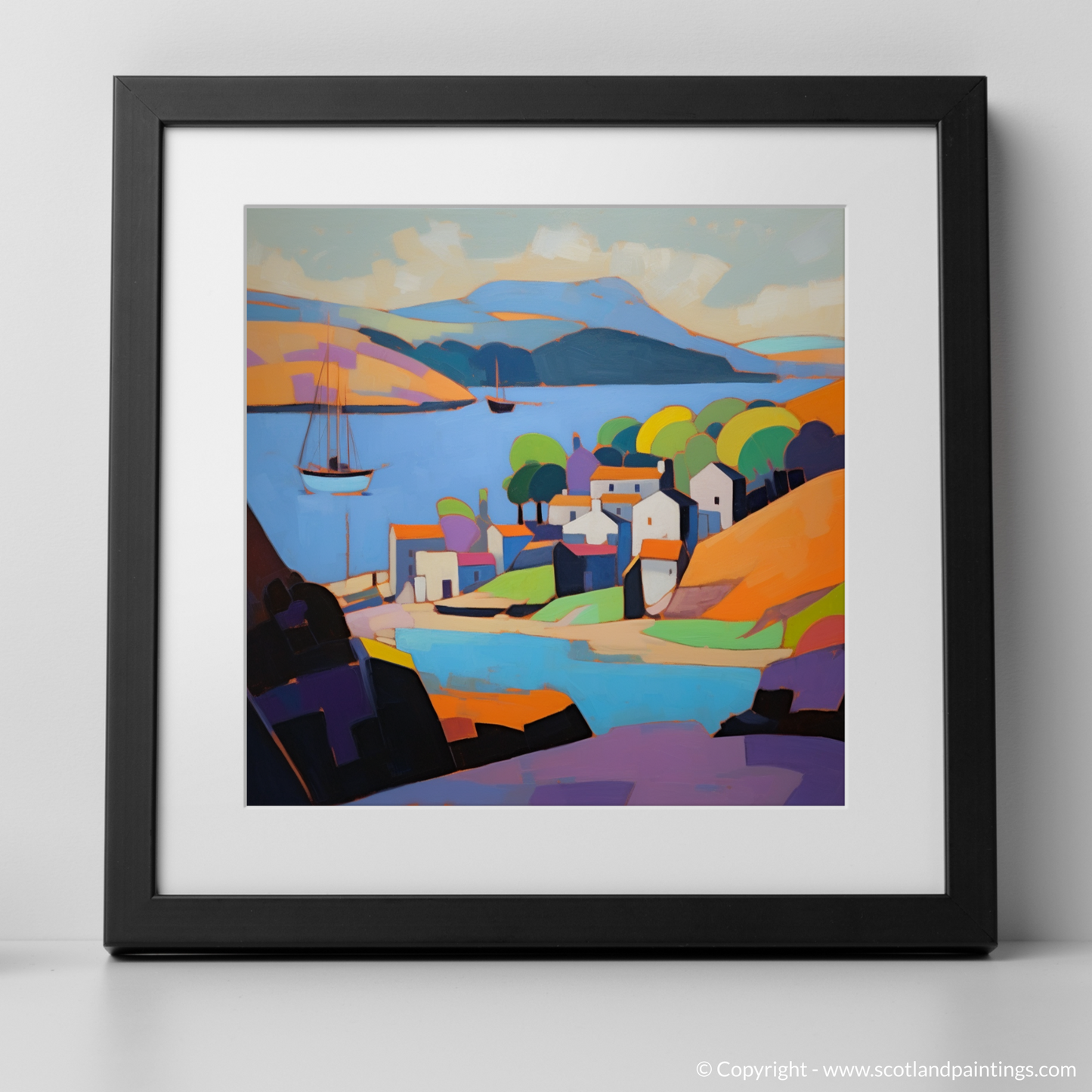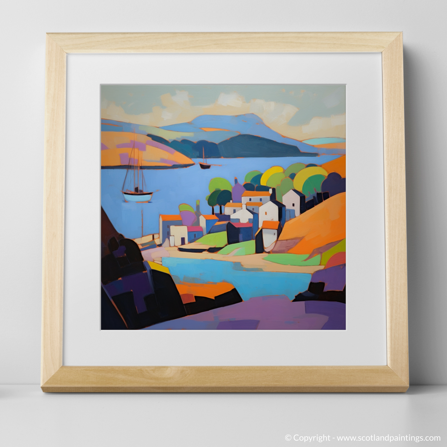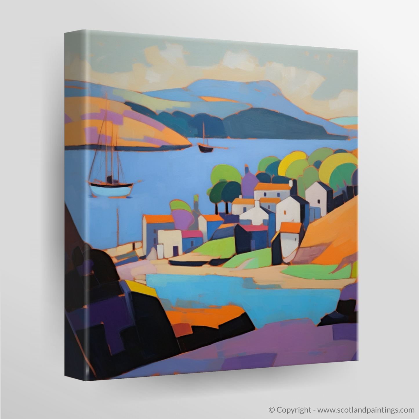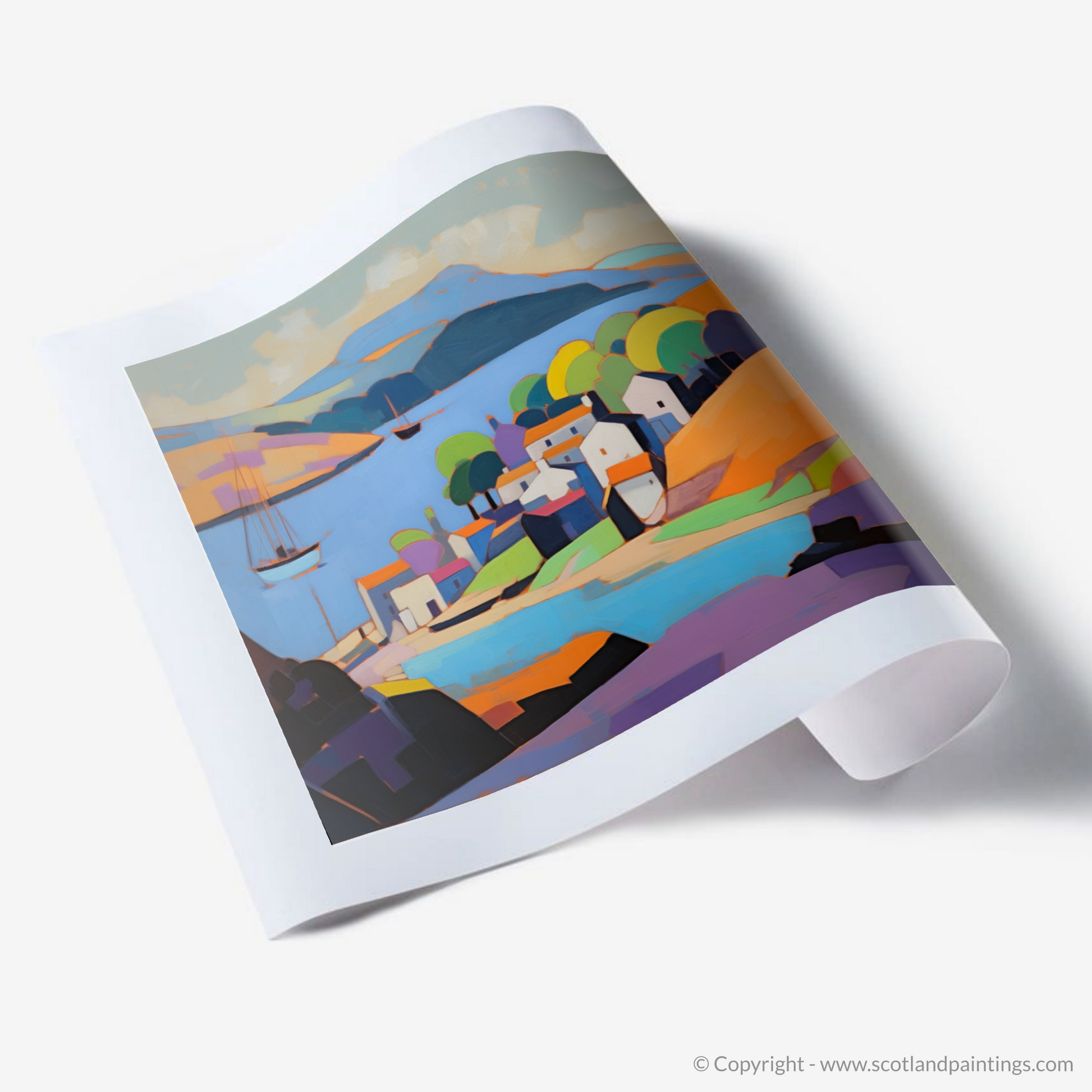 Ideal for those who appreciate the beauty of Scottish landscapes and the innovative artistry of Cubism, this illustration stands as a testament to the timeless allure of Scotland's harbours, reimagined through a modern, artistic gaze.