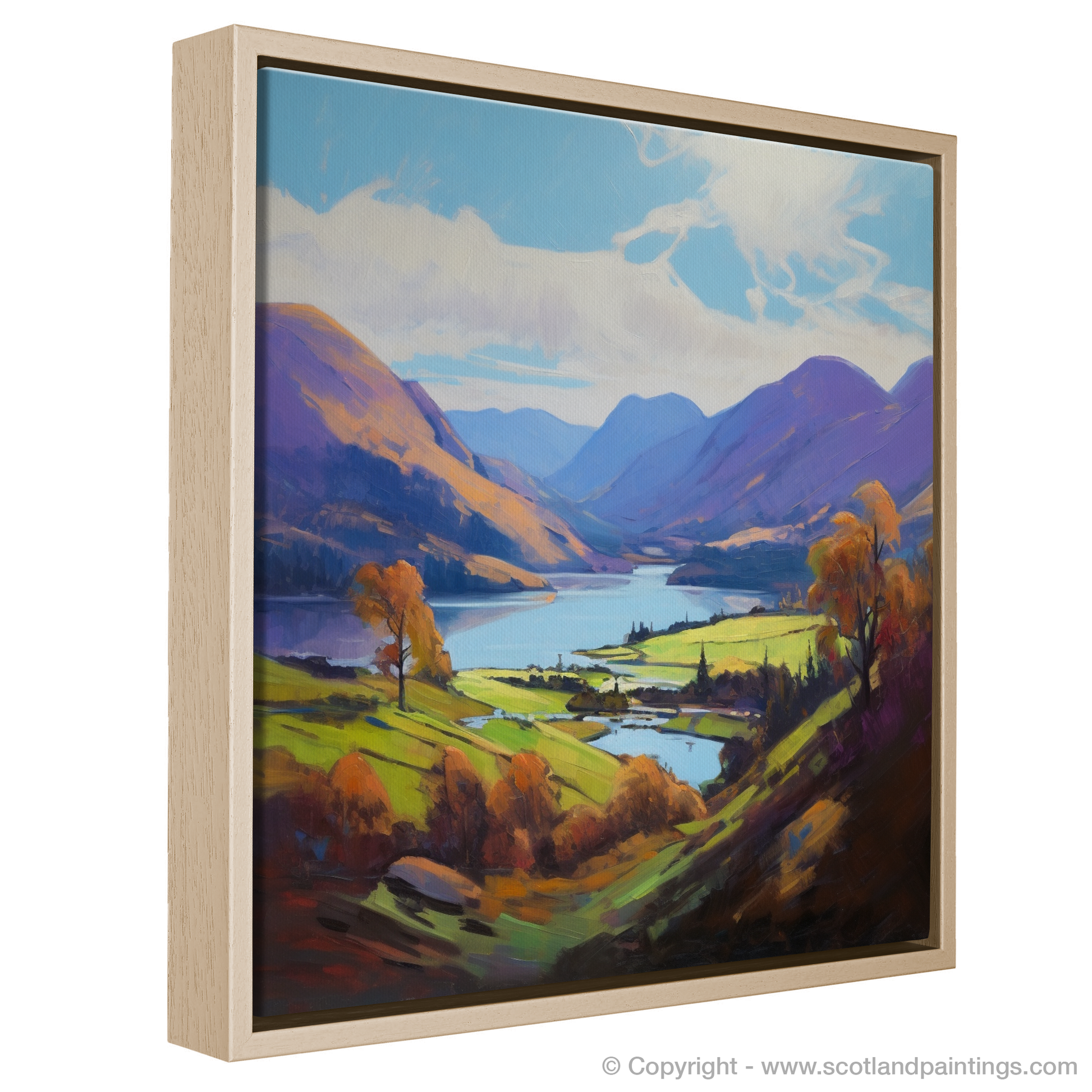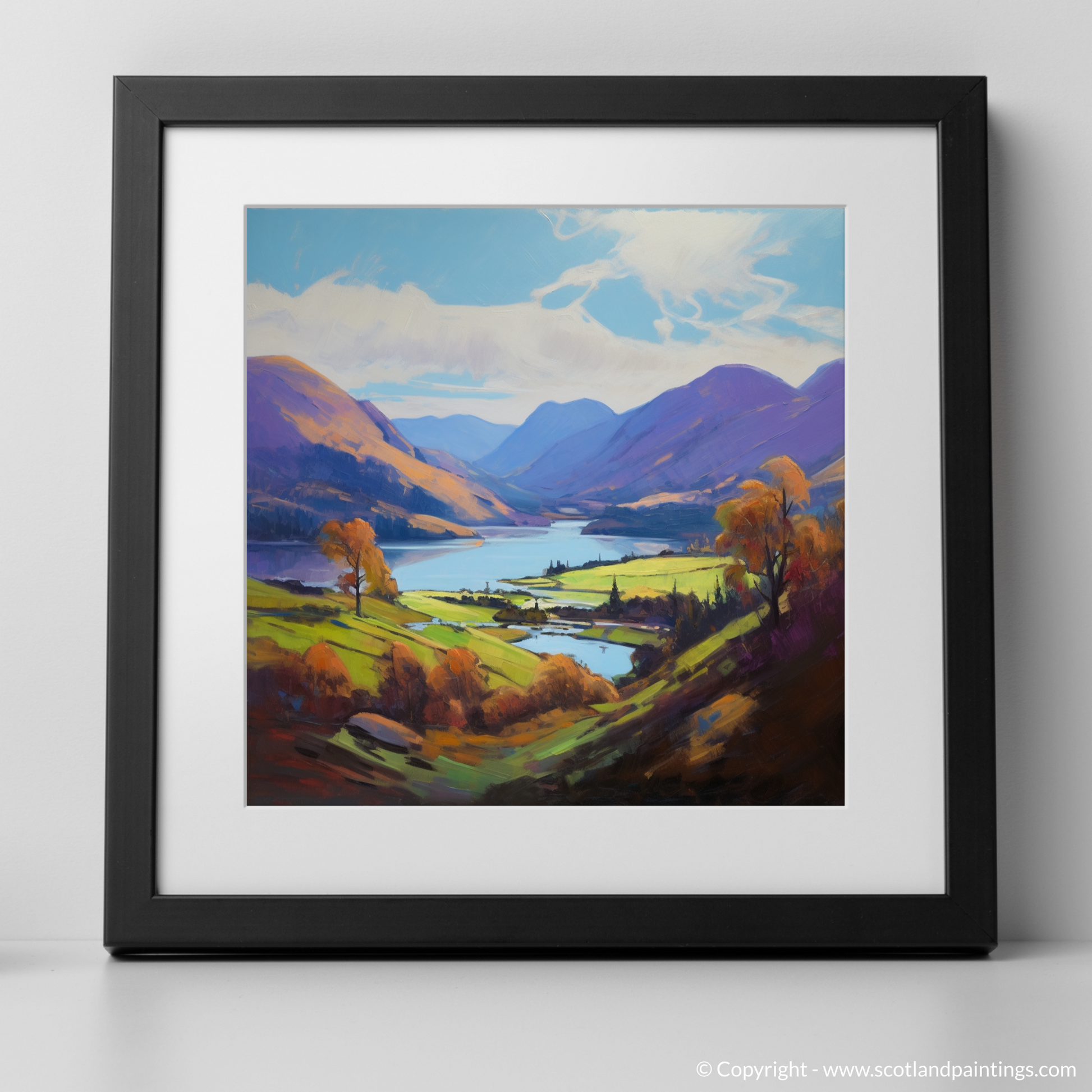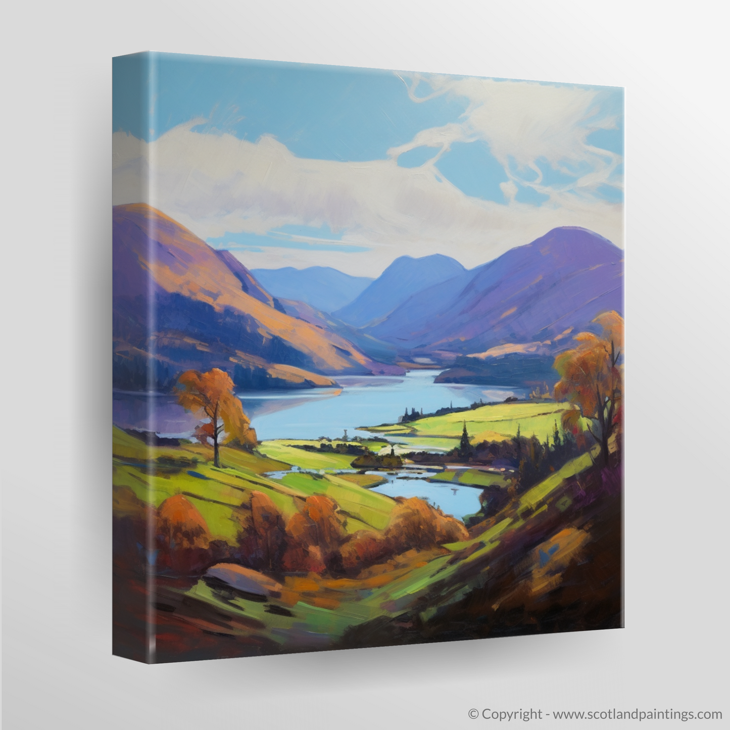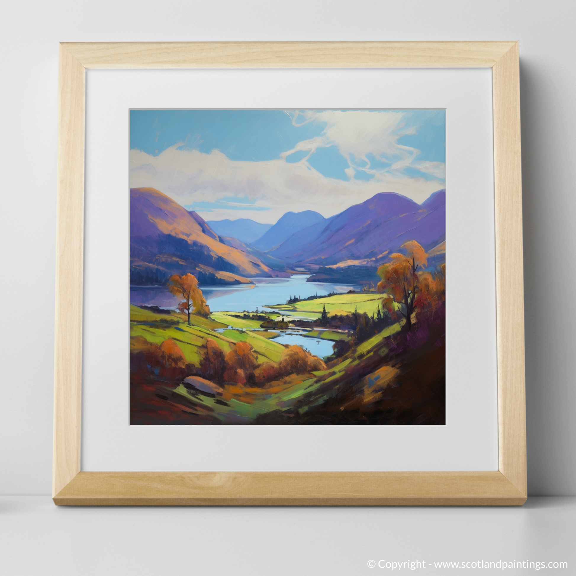 This piece is a vibrant tapestry of hues and shades, boasting a palette rich in purples, greens, and blues that reflect the varied tapestry of the Highlands. The loch itself is rendered in serene blues and purples, teasing the eye with reflections that dance across its tranquil surface, while the surrounding hills and mountains are cloaked in a patchwork of heather and bracken tones.