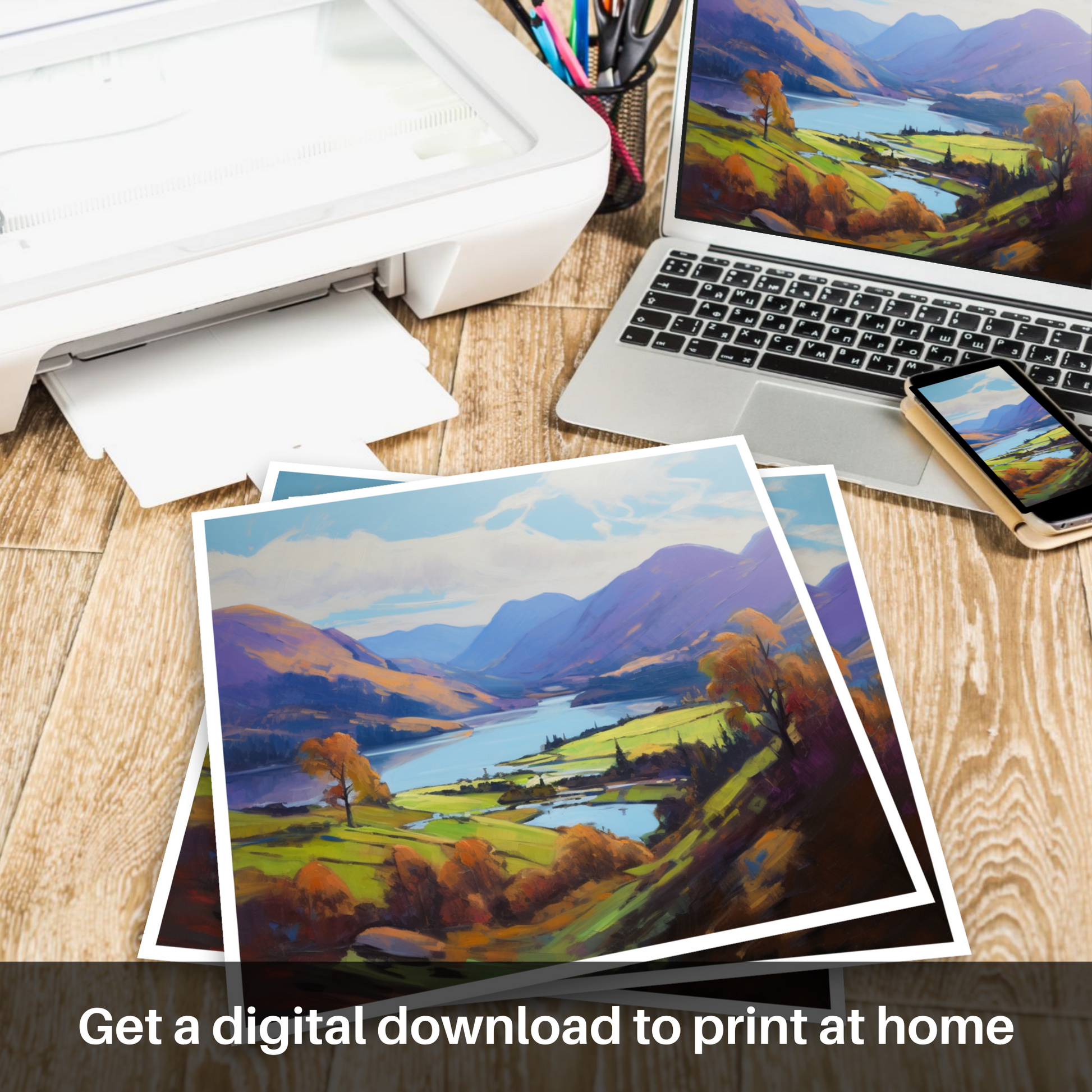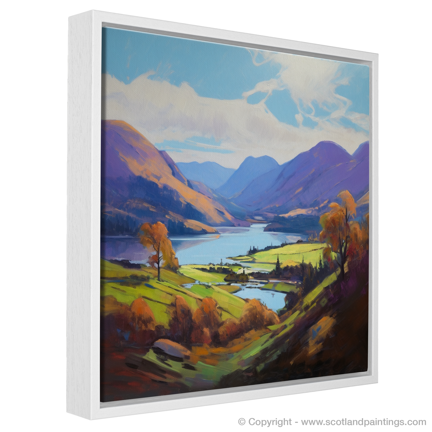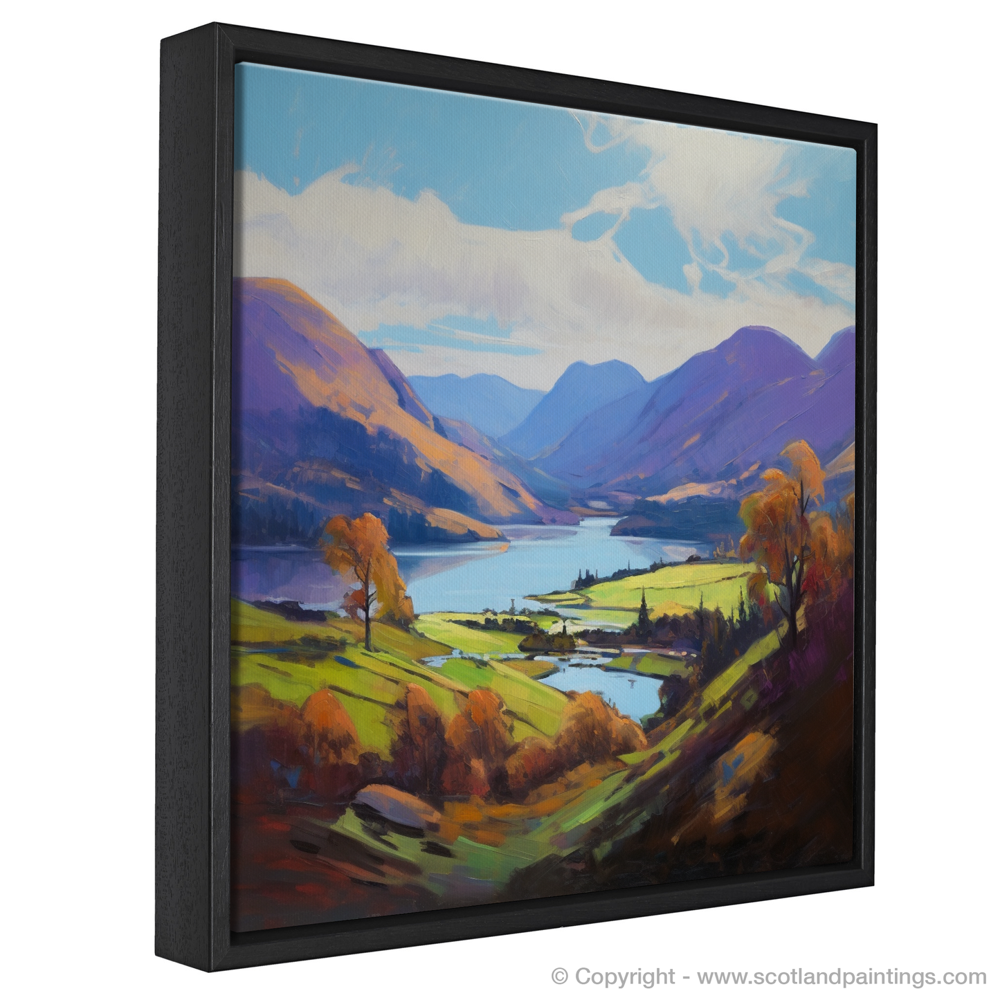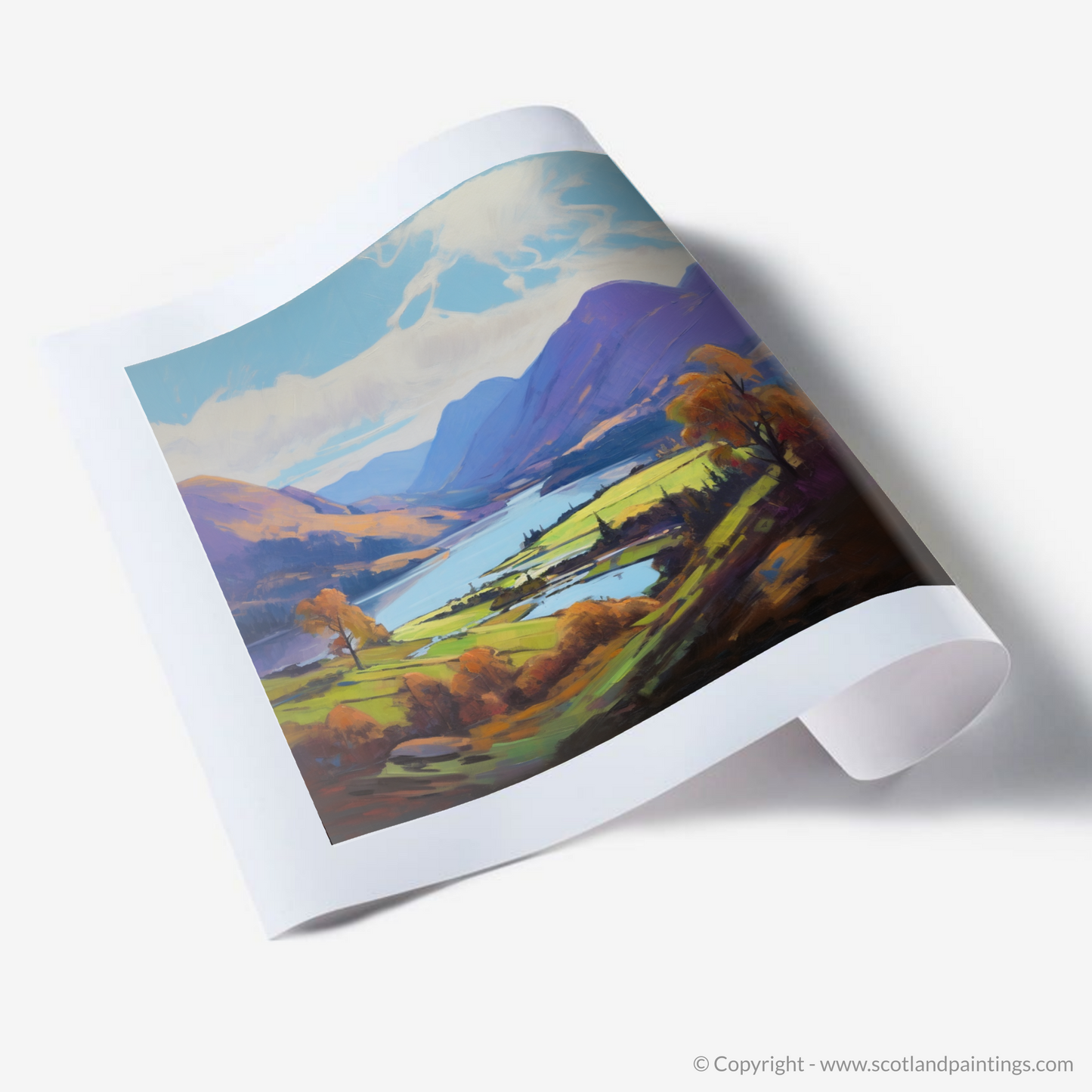 This piece is a vibrant tapestry of hues and shades, boasting a palette rich in purples, greens, and blues that reflect the varied tapestry of the Highlands. The loch itself is rendered in serene blues and purples, teasing the eye with reflections that dance across its tranquil surface, while the surrounding hills and mountains are cloaked in a patchwork of heather and bracken tones.