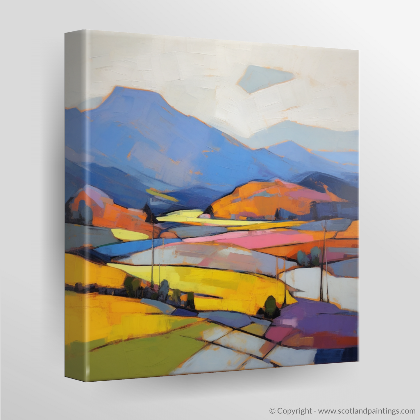 At the heart of the composition lies a rich tapestry of warm oranges and vivid yellows, suggesting the golden glow of the sun as it kisses the rolling hills. Accents of cool blues and serene purples dance across the canvas, reminiscent of the majestic mountains and their shadowy crevices. Interspersed with strokes of gentle pinks and spirited greens, the land comes alive, a patchwork quilt of abstract shapes that harmoniously embody the essence of Meall na Aighean.