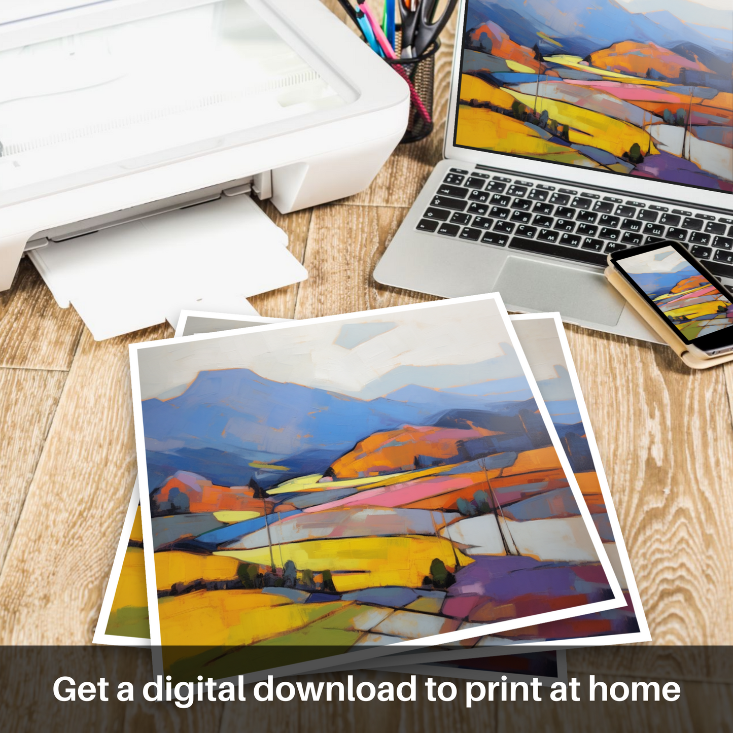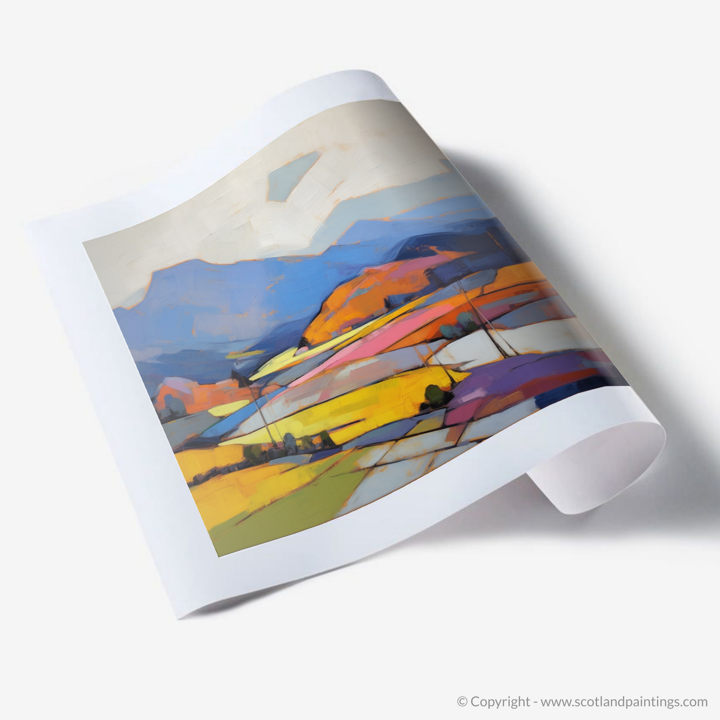 Embark on a visual journey through the Scottish Highlands with this captivating abstract piece inspired by the awe-inspiring Creag Mhòr, a part of the Munros mountain range. This print features a dynamic and vibrant interpretation of the natural landscape, where bold hues and sweeping colour blocks converge to form a mesmerising tapestry of the terrain.