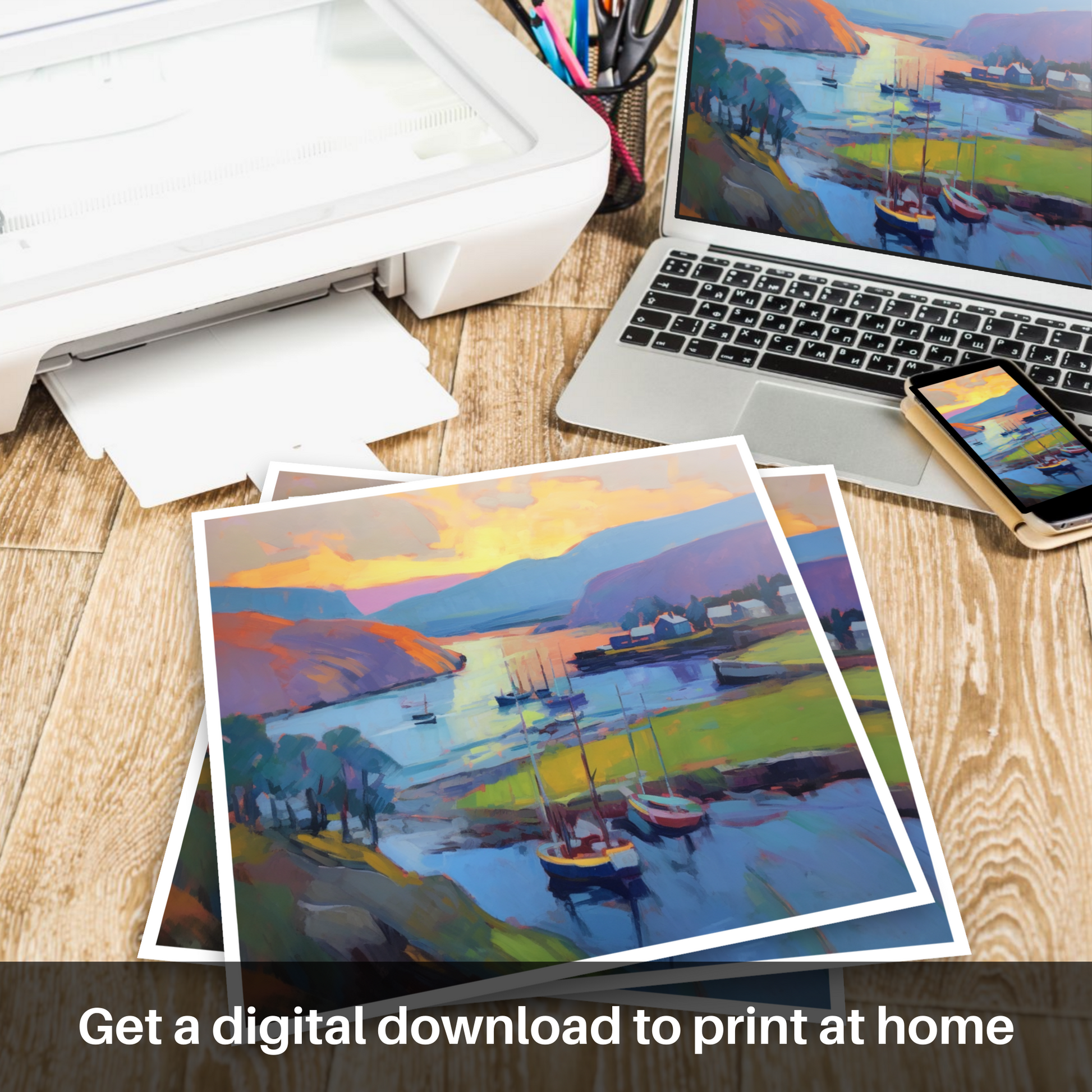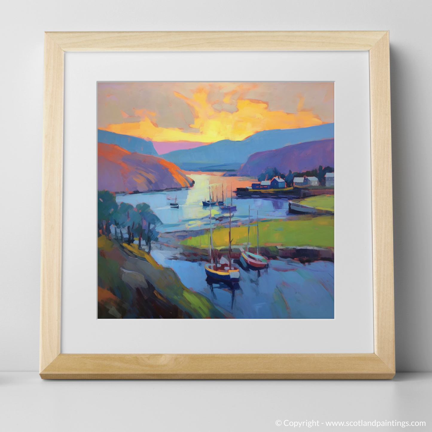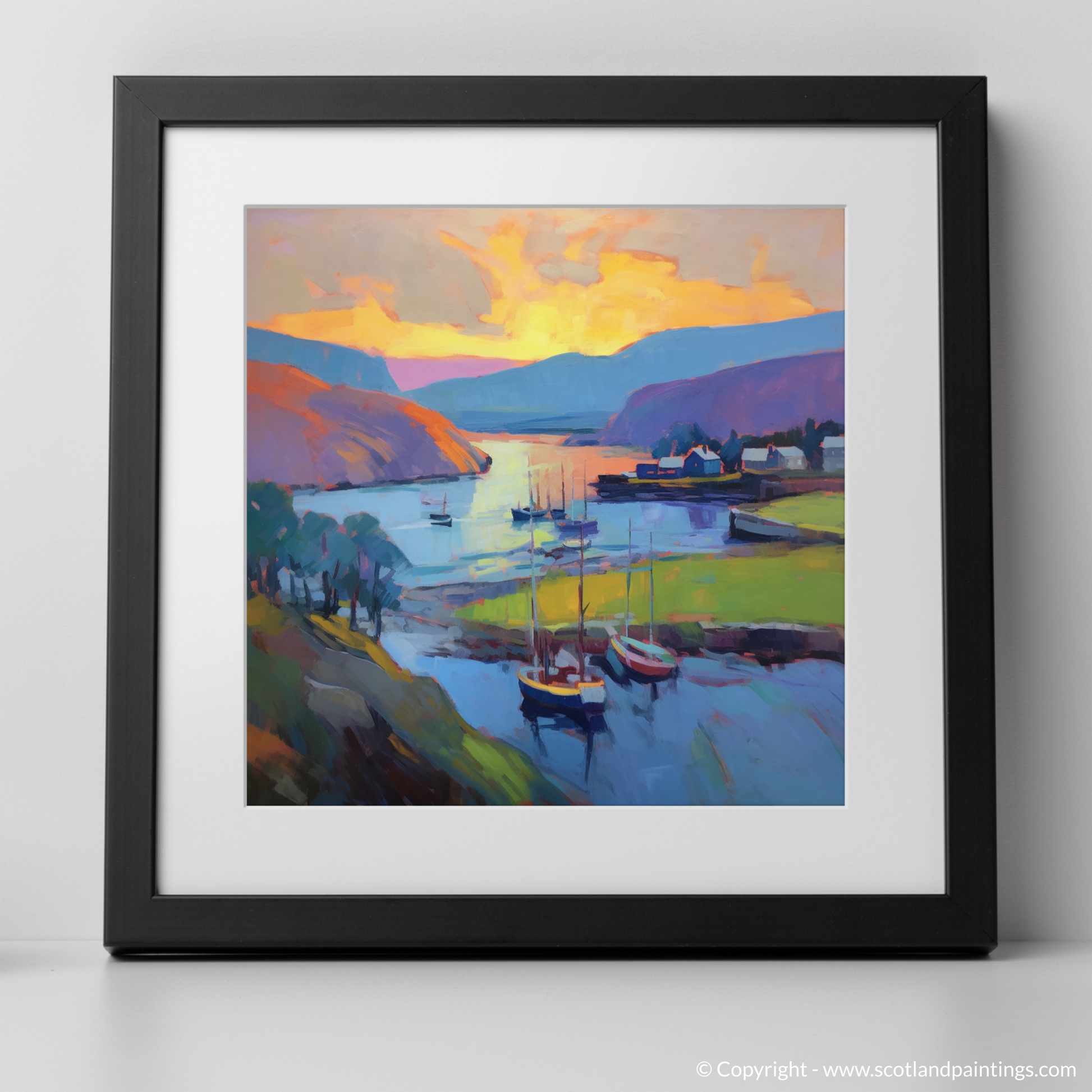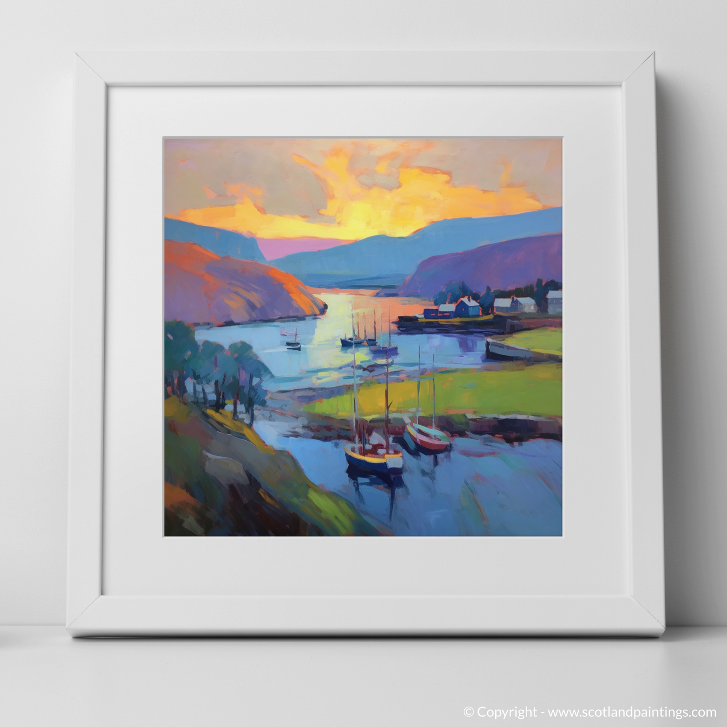 Capturing the ephemeral beauty of twilight, this exquisite print presents a serene depiction of Portnahaven Harbour enveloped in the soft embrace of dusk. This timeless piece evokes the essence of Impressionism with its loose brushwork and vibrant interplay of light and shadow.