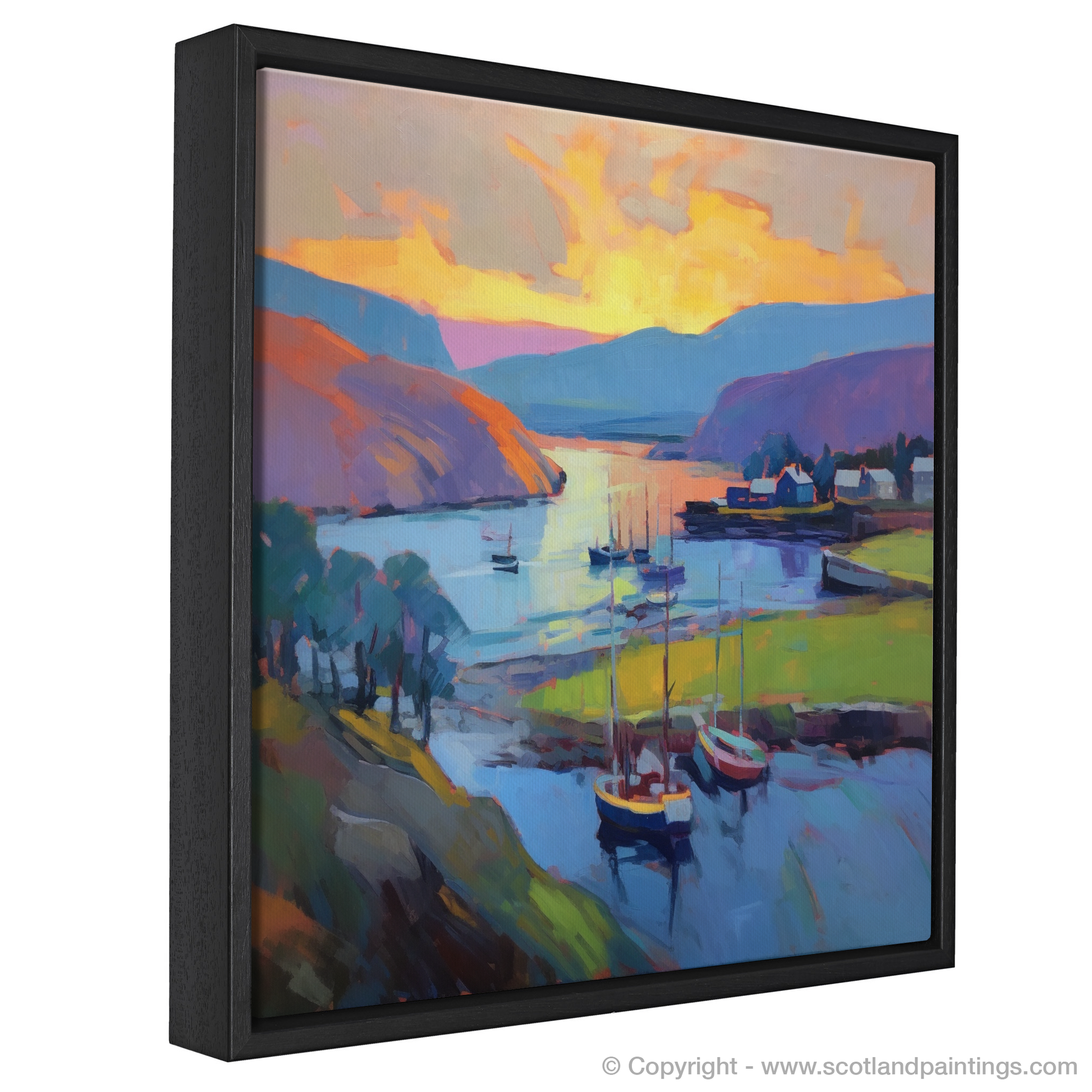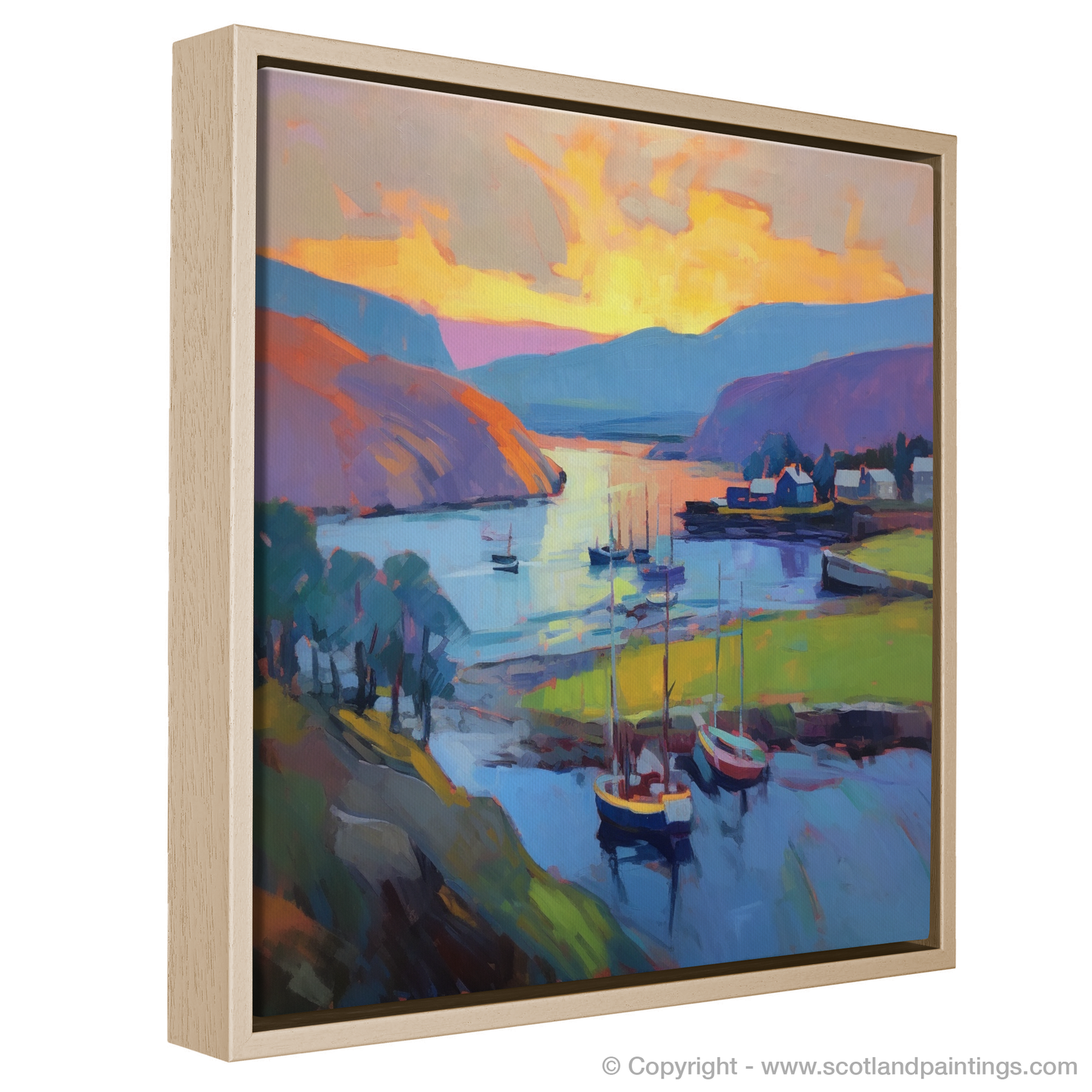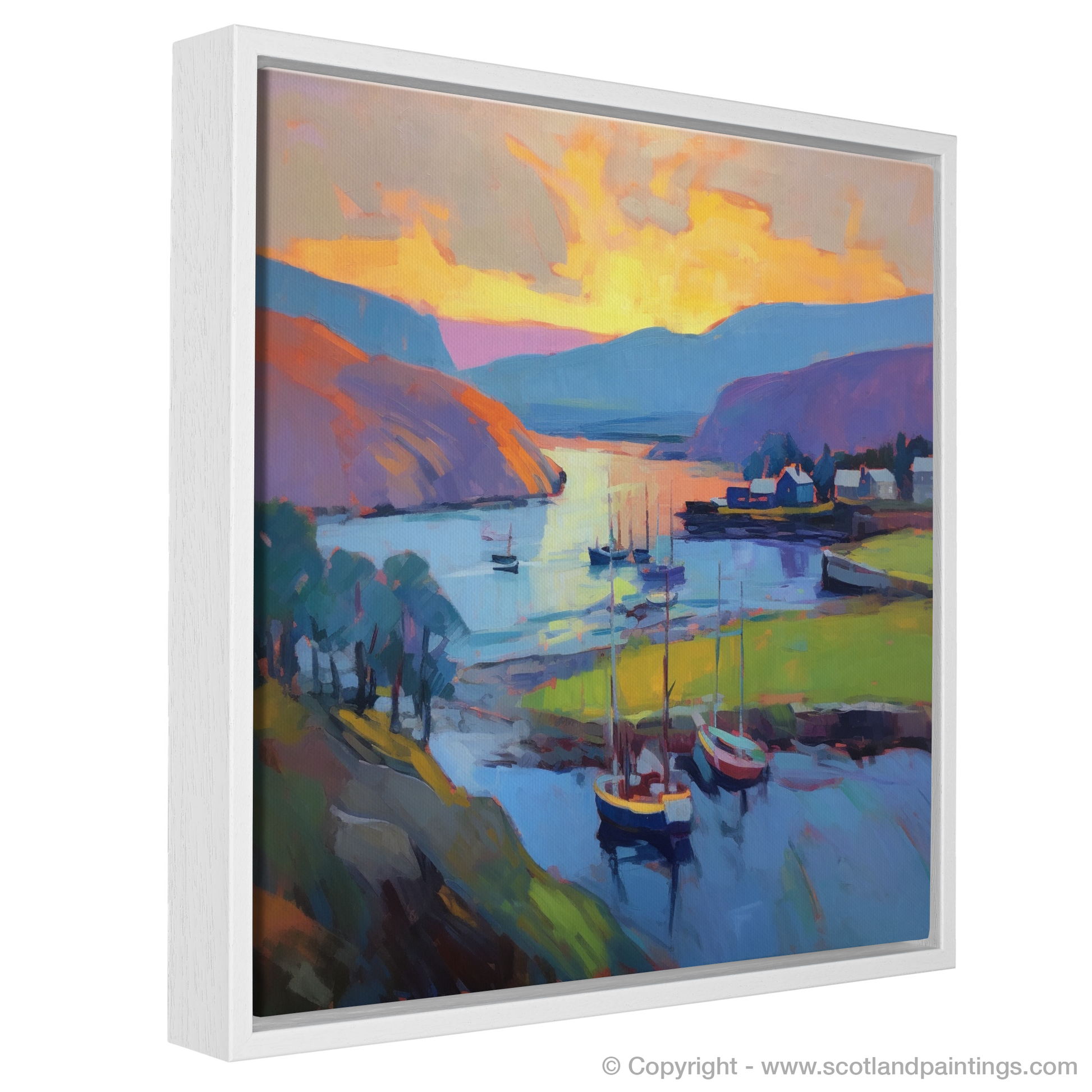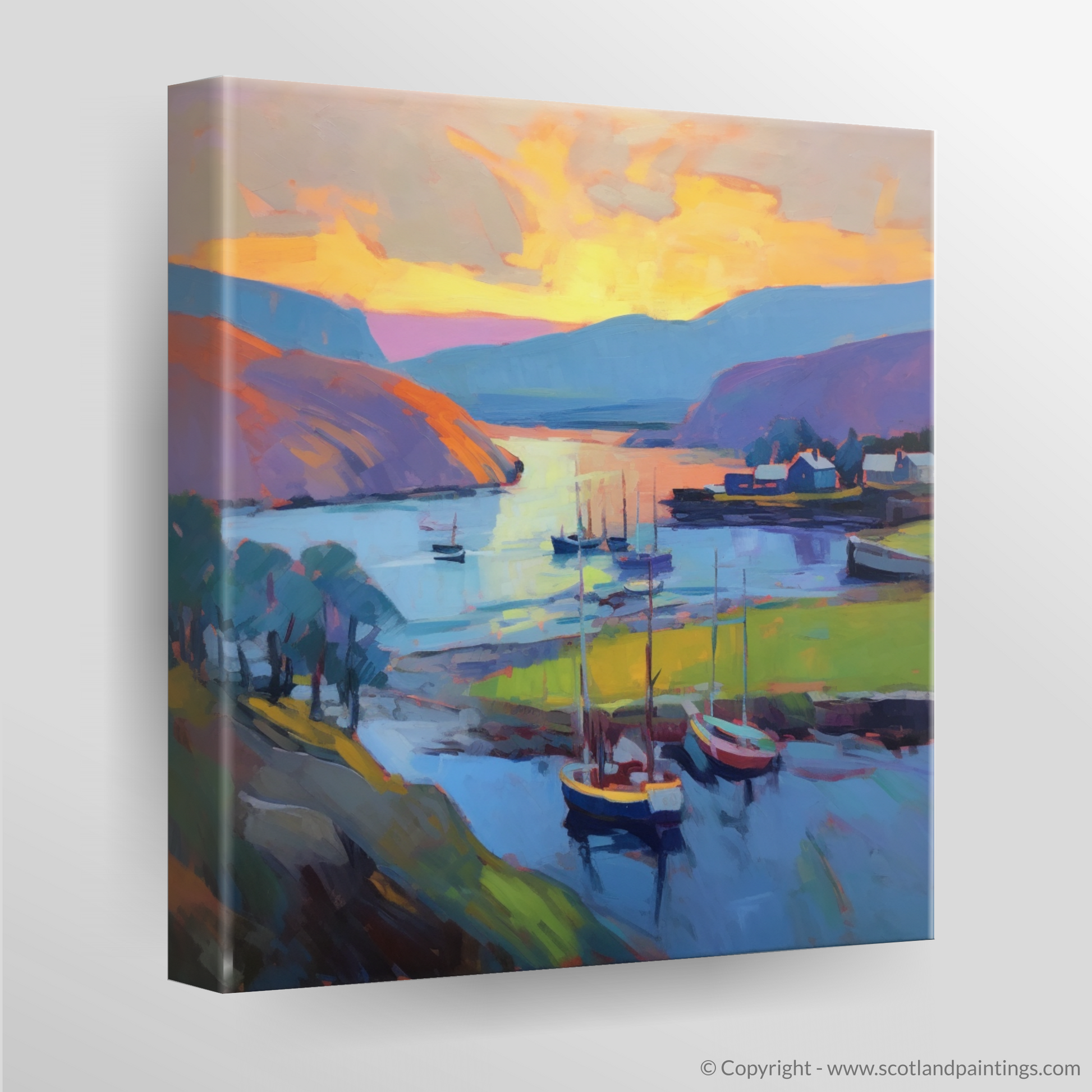 Capturing the ephemeral beauty of twilight, this exquisite print presents a serene depiction of Portnahaven Harbour enveloped in the soft embrace of dusk. This timeless piece evokes the essence of Impressionism with its loose brushwork and vibrant interplay of light and shadow.
