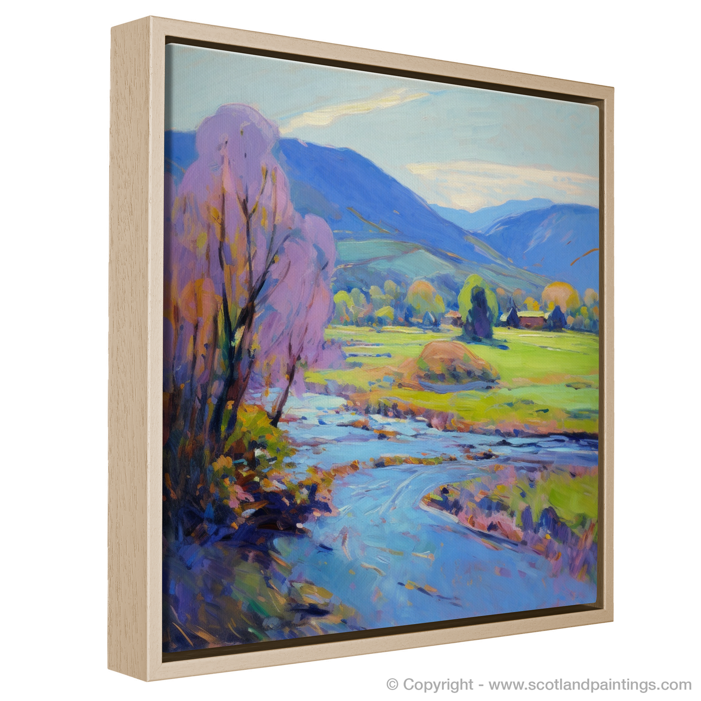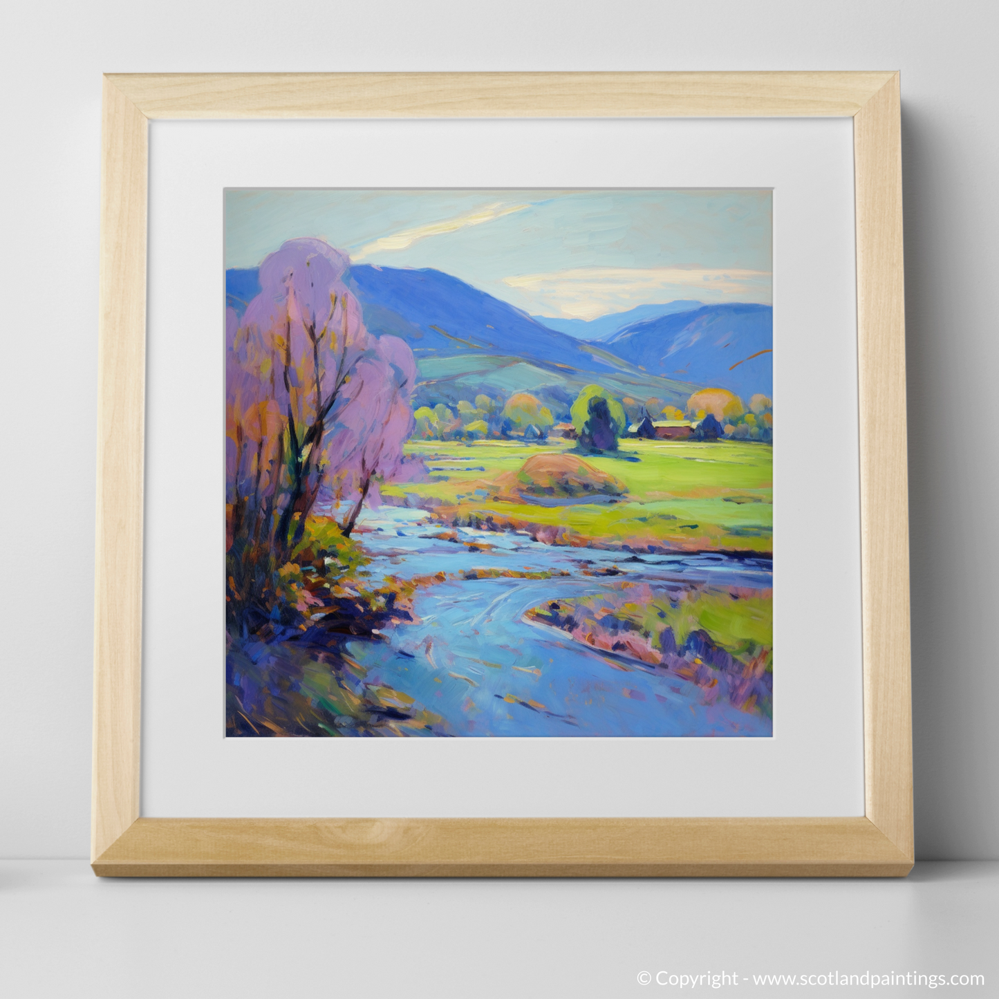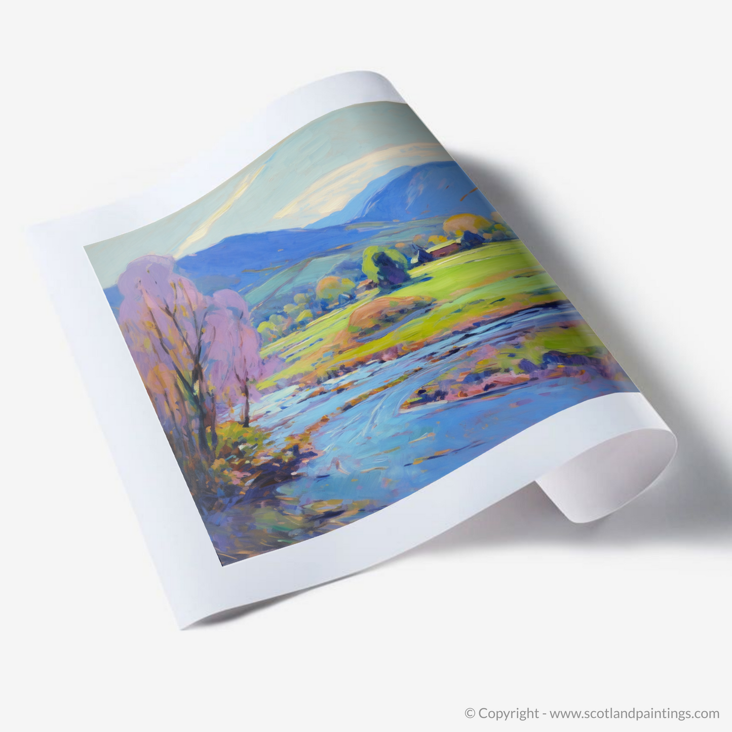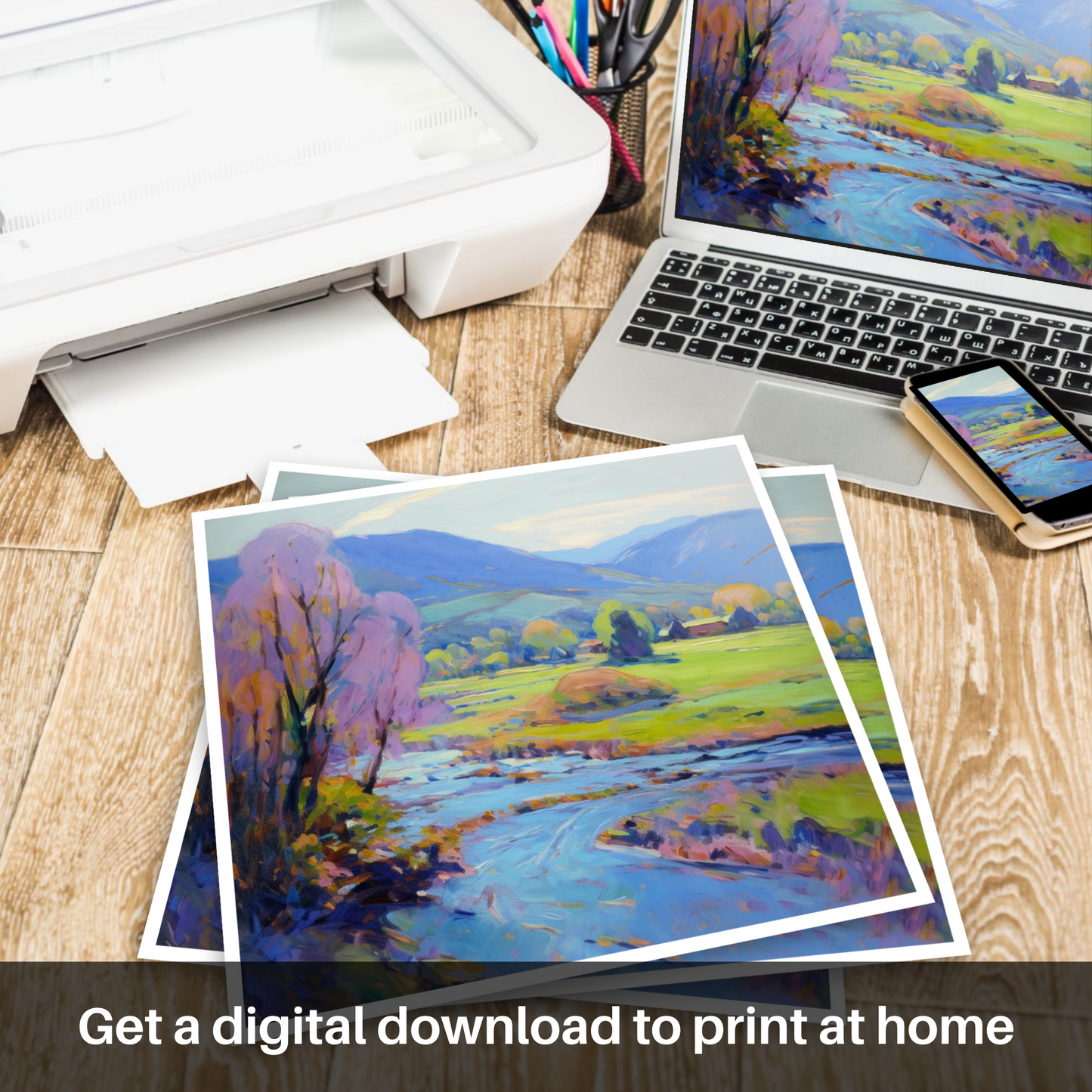 Capture the tranquil essence of River Lyon as it meanders through Perthshire with this exquisite Impressionist-inspired print. Loose, expressive brushstrokes convey the flowing water, its surface a tapestry of shimmering blues and purples reflecting the sky above. The riverside is adorned with a palette of lush greens and autumnal golds, suggesting the gentle transition of seasons in the Scottish highlands.