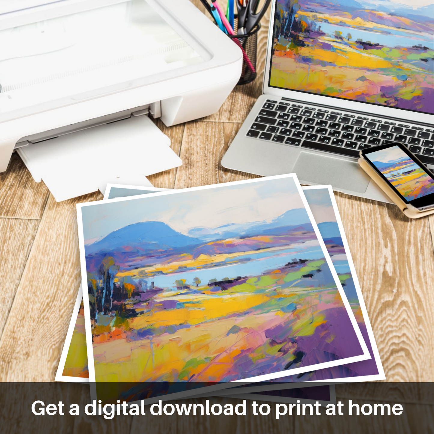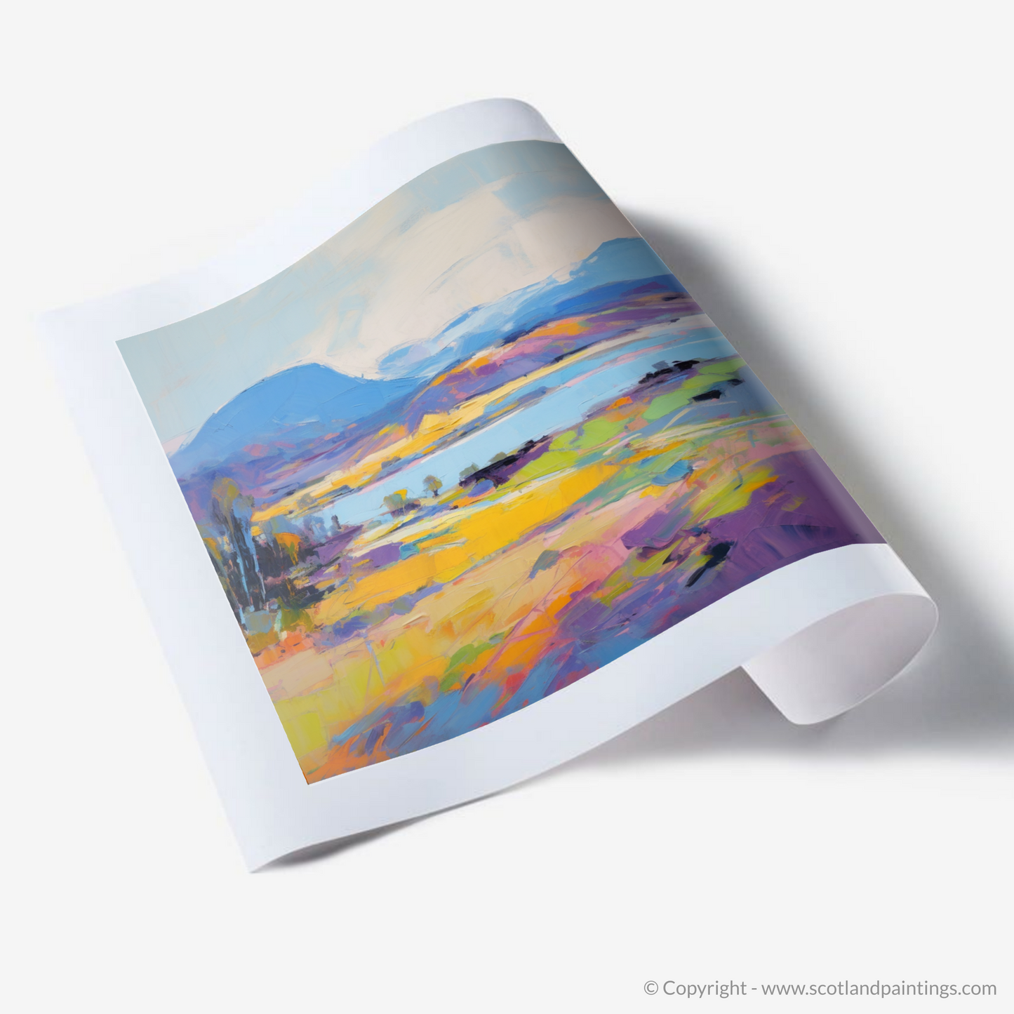 Immerse yourself in the vivid tapestry of colour and motion that is our latest offering, a print inspired by the enchanting Ardalanish Bay on the Isle of Mull. Rich, thick strokes sweep across the canvas, capturing the dynamic interplay of light and landscape that embodies the wild Scottish coast. Splashes of vibrant yellows and soft violets meld with the cerulean hues of water, lending the piece an almost ethereal quality.
