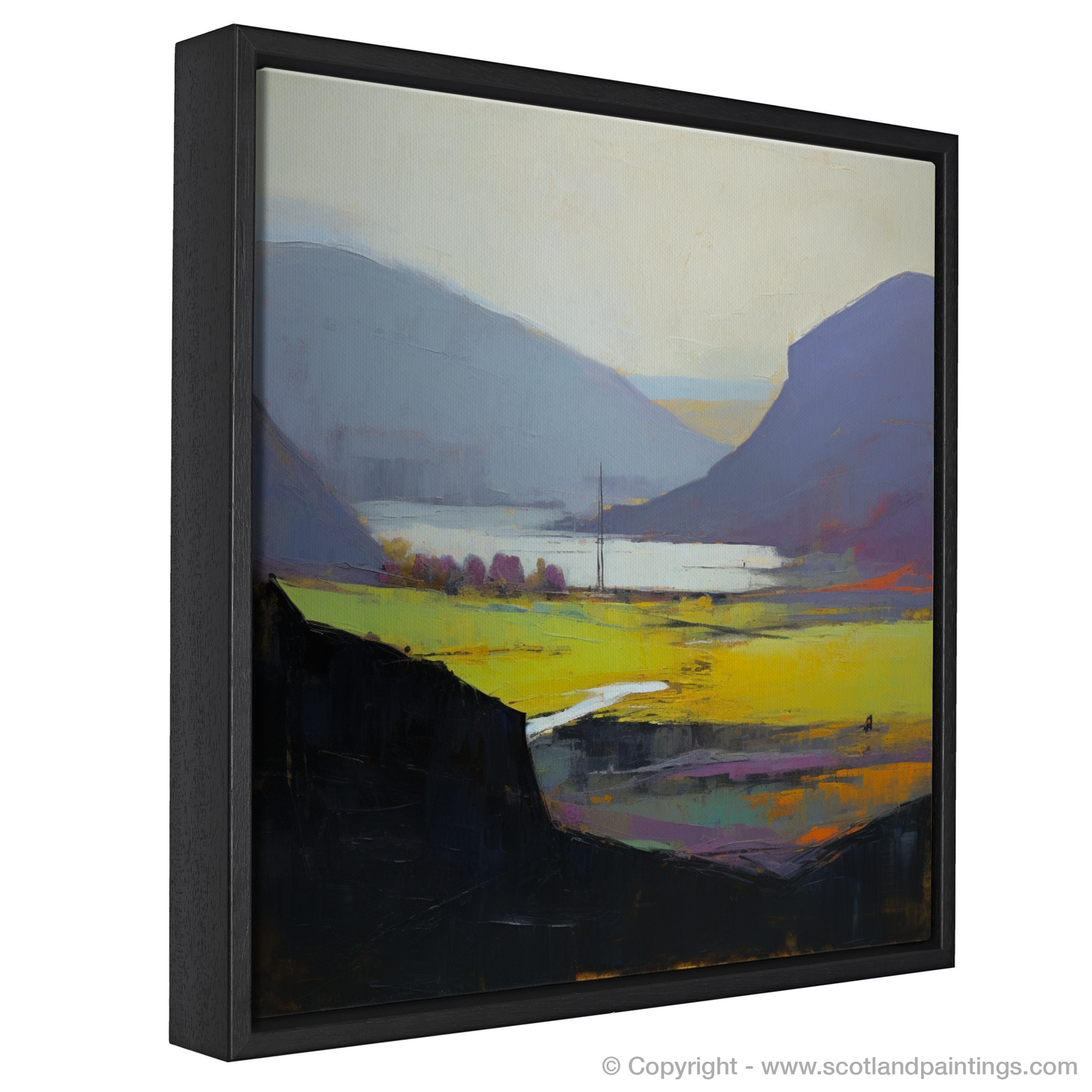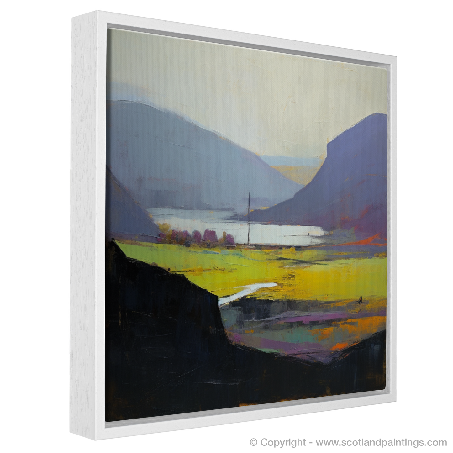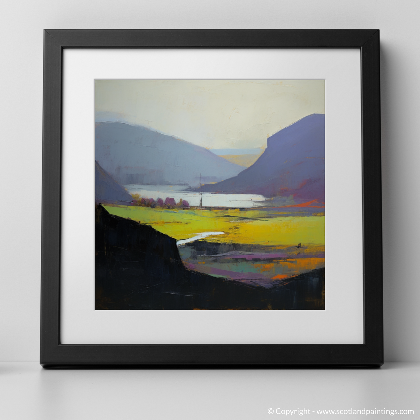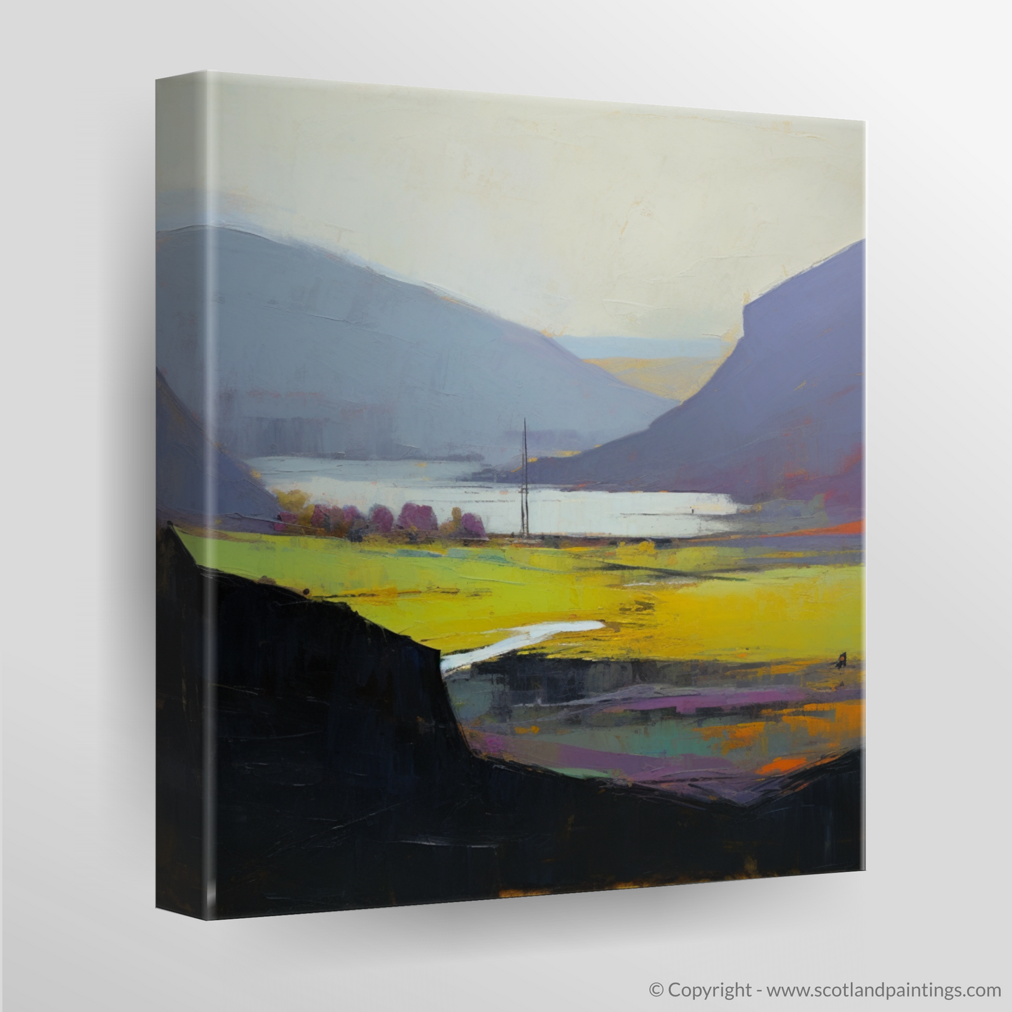 Gazing further into the scene, the shimmering blues and whites of the calm waters depict the loch's tranquil surface, mirroring the hushed sky and conveying a sense of limitless space. The spectral mountains arise in the distance, their cool, dusky silhouettes creating a mysterious depth, encouraging the viewer's eye to wander and ponder.