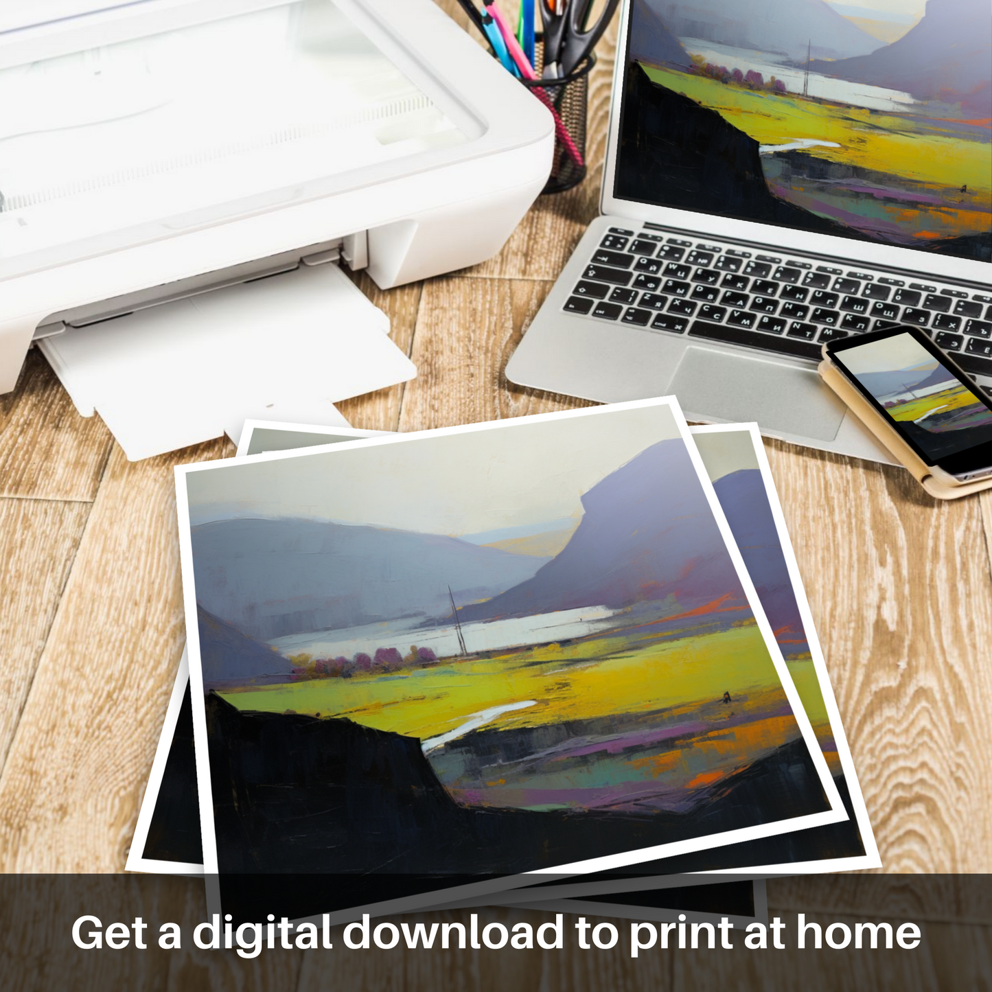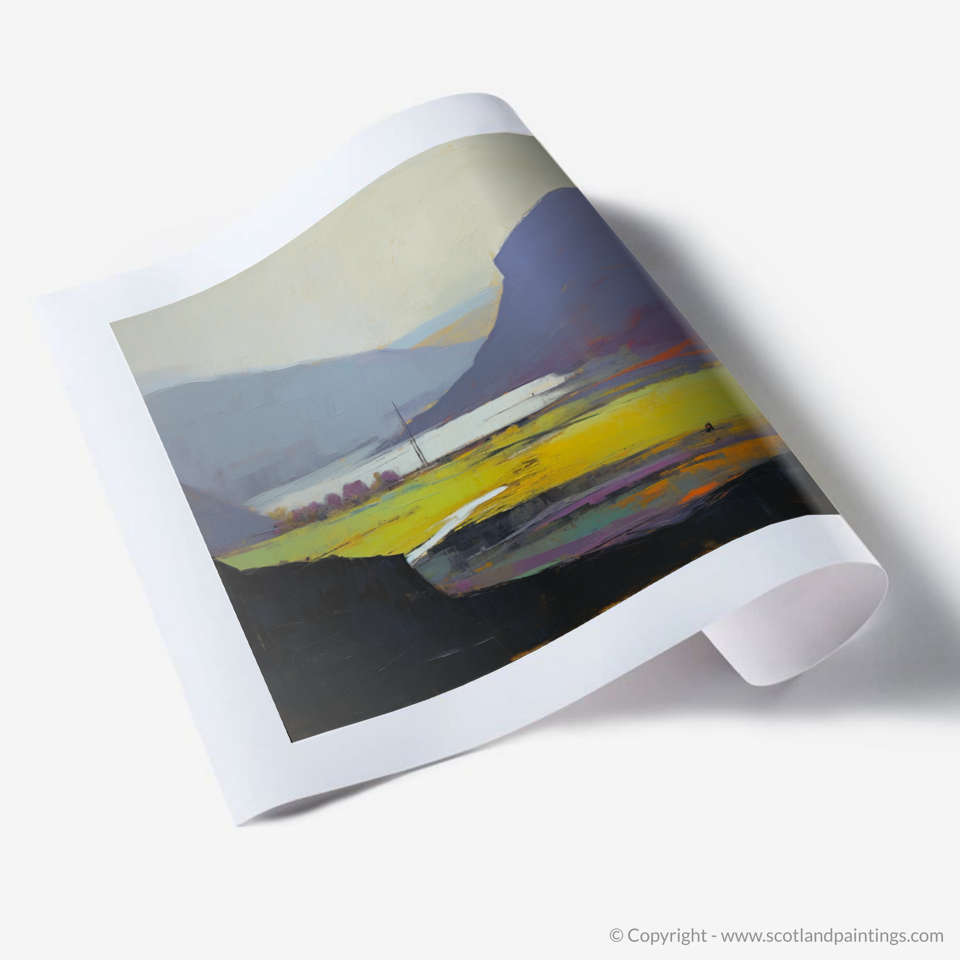 The foreground presents an expansive view of the undulating terrain, with dark bluffs refined to their most basic forms casting a stark contrast against the luminously coloured meadows beneath a sweeping skyline. A tapestry of atmospheric tones unfolds across the print, where the golden and green hues of the fields meld effortlessly into the soft lavenders and pinks that allude to the presence of heather and wildflowers abundant in Scottish isles.