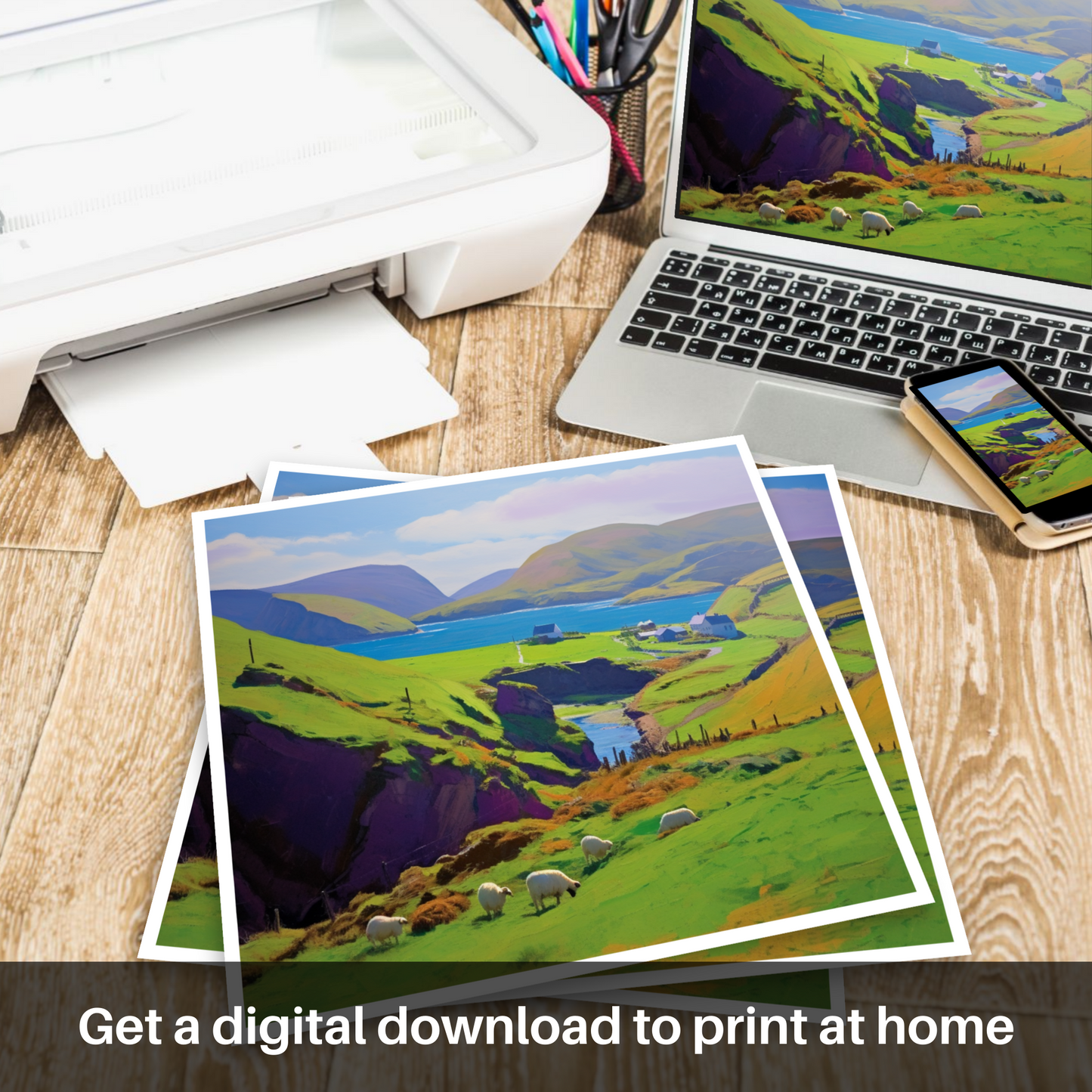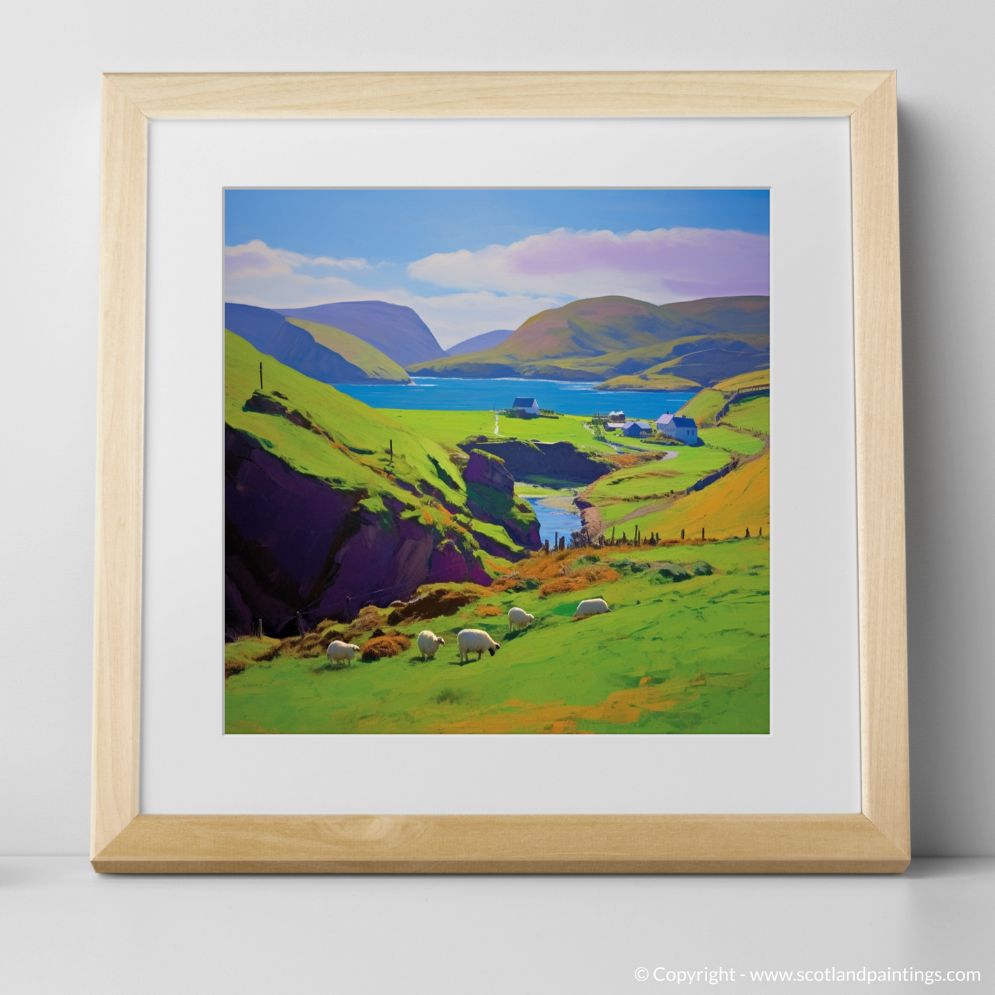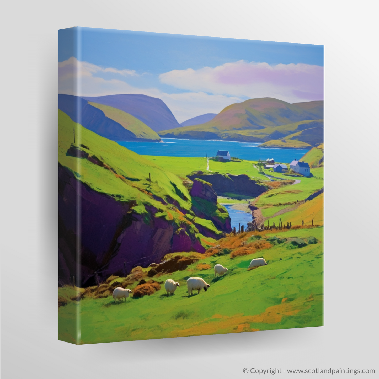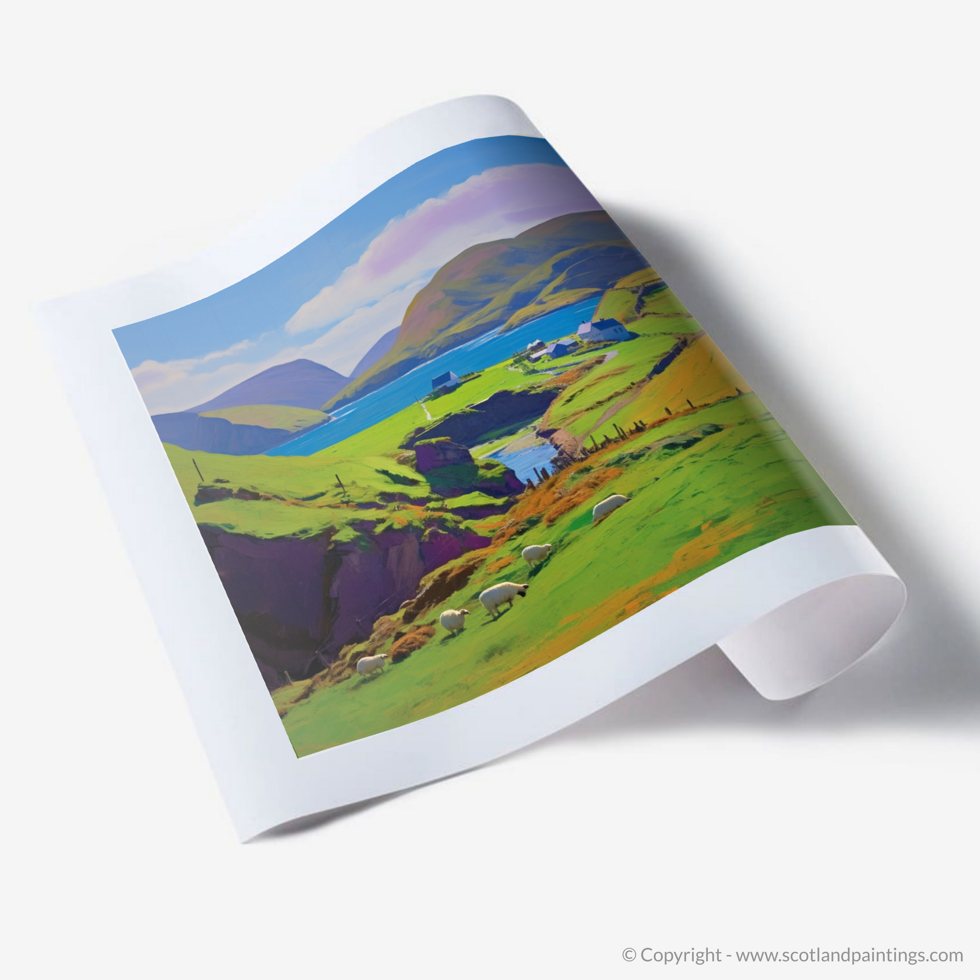Foremost in the scene, vibrant grassy knolls take centre stage, demonstrating an inventive use of colour to highlight the topography. The shadows are rendered in rich purples and blues, establishing a visual contrast that is a hallmark of Pop Art aesthetics. These elements converge into a picturesque tapestry that pays homage to Shetland's natural splendour.