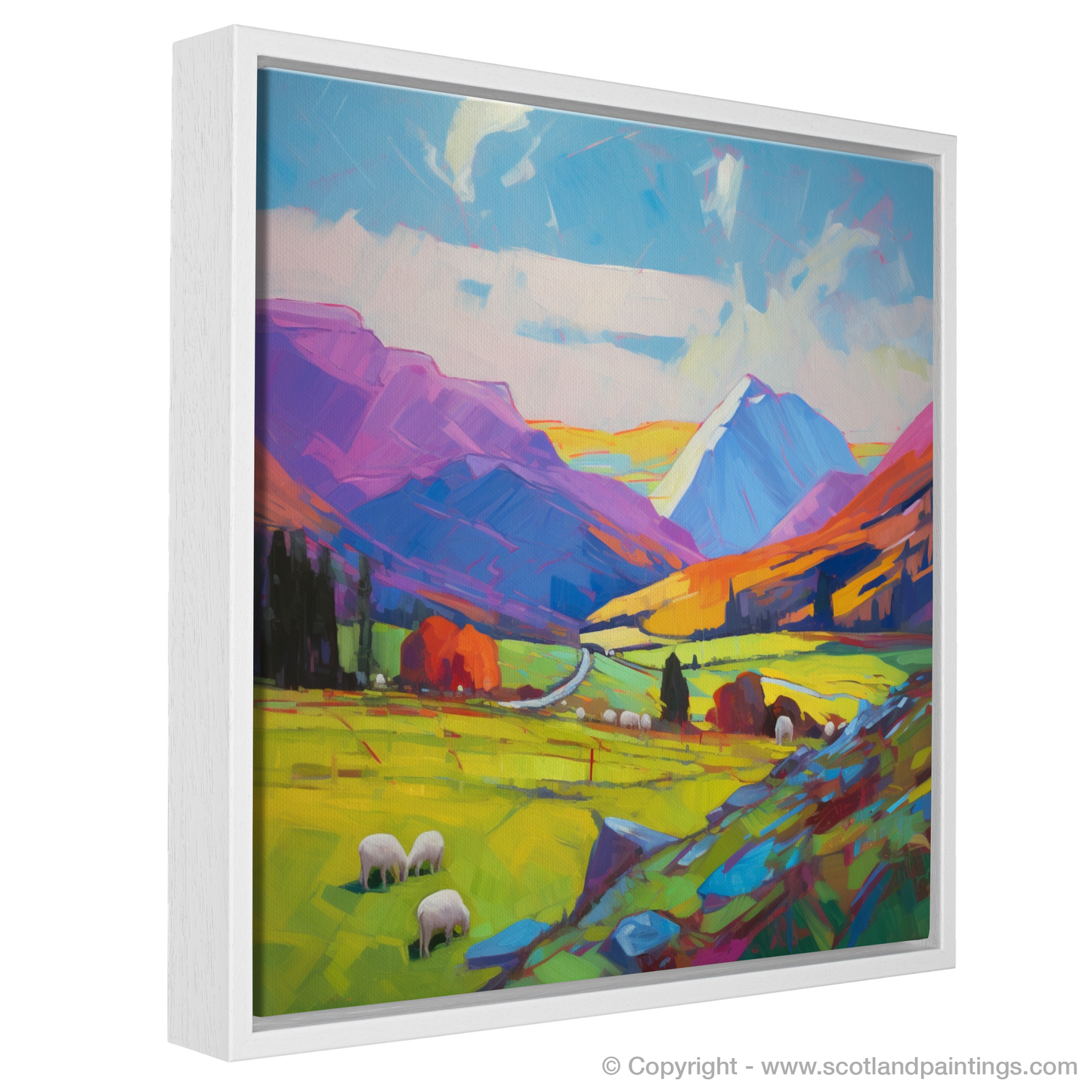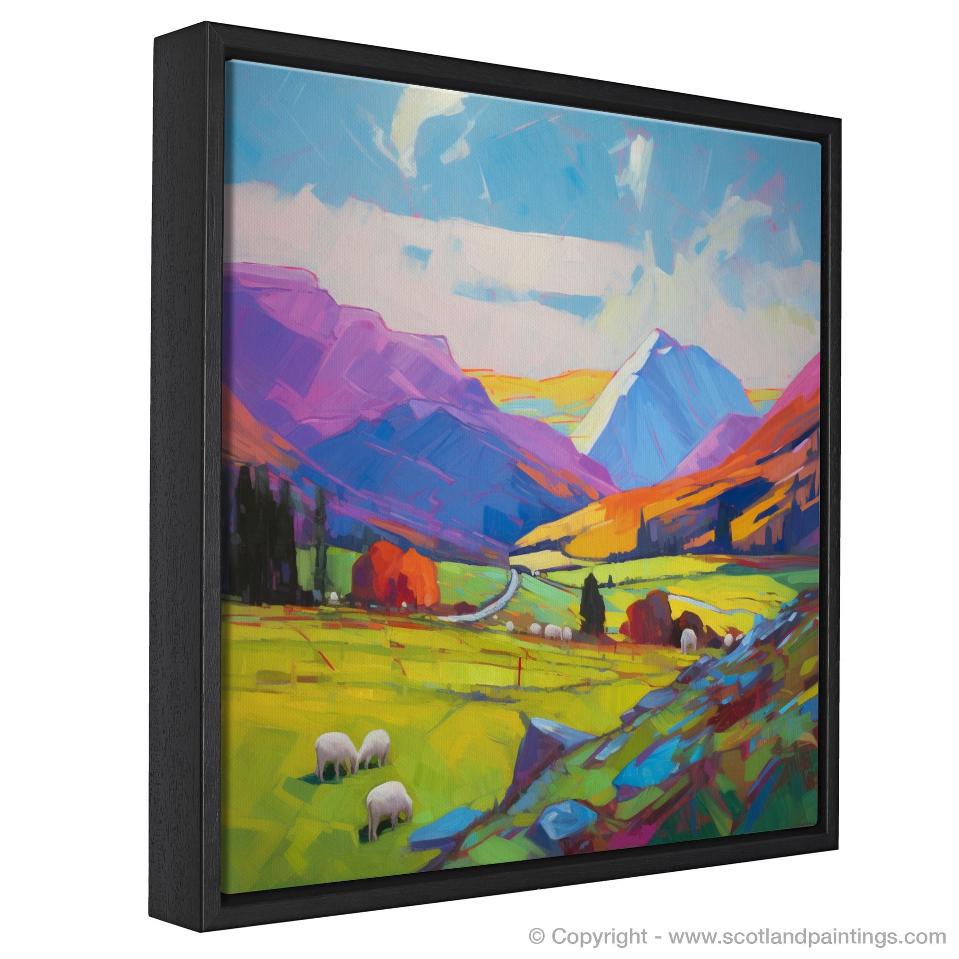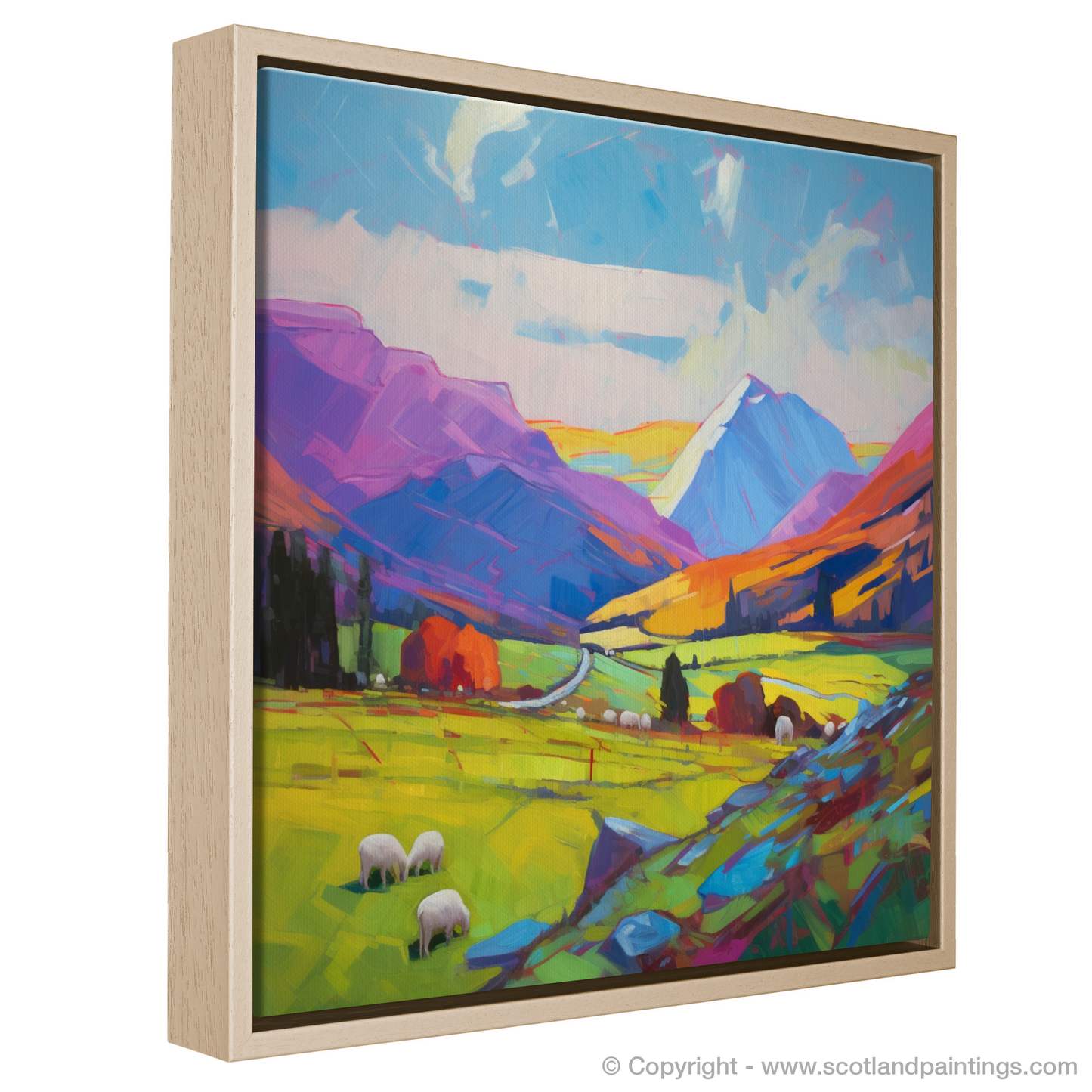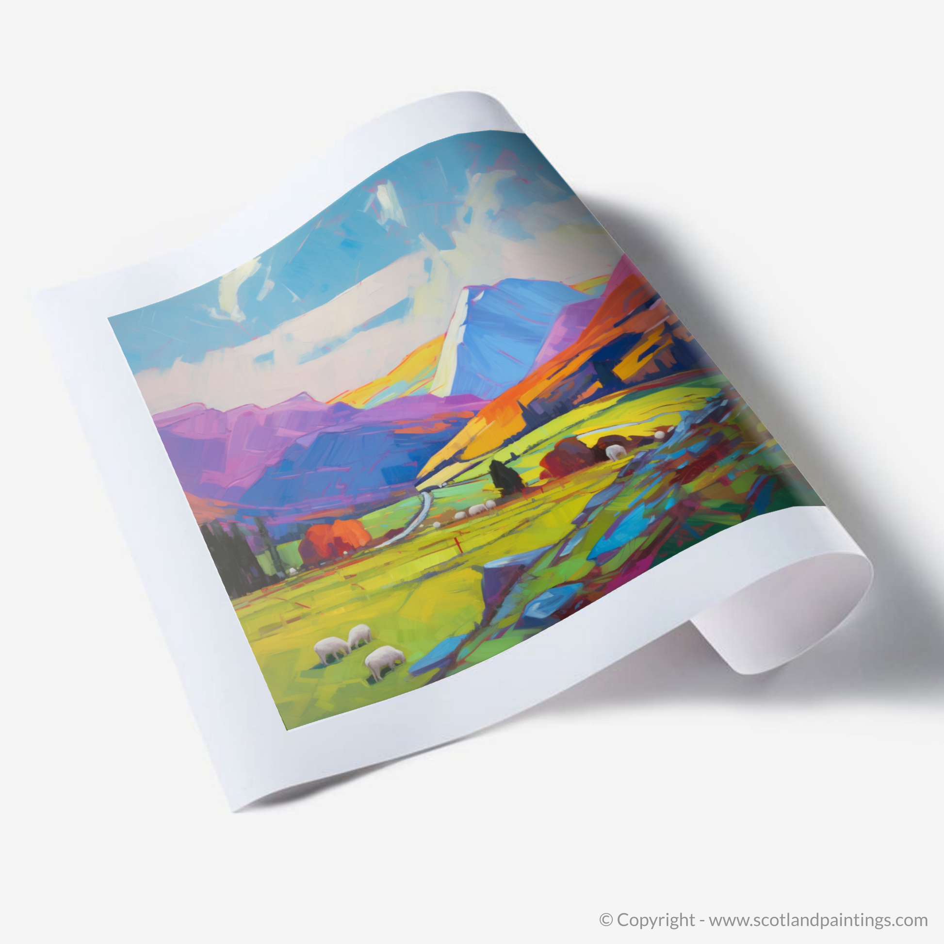 Bathed in a spectrum of vibrant hues, this captivating print immortalises the bucolic charm of Glencoe with an unexpected twist of Pop Art exuberance. The scene unfolds across a rolling pasture vibrant with lemon-yellow grasses, where sheep graze in peaceful oblivion. The atmosphere suggests the quiet moments of twilight when shadows grow long and colours deepen.
