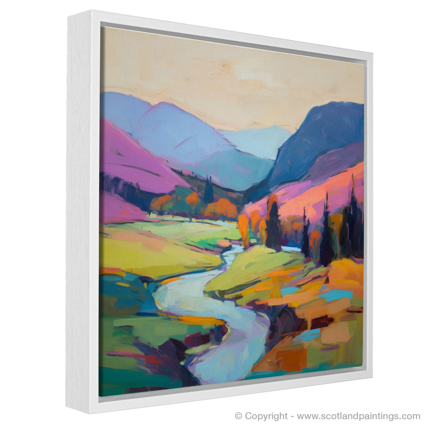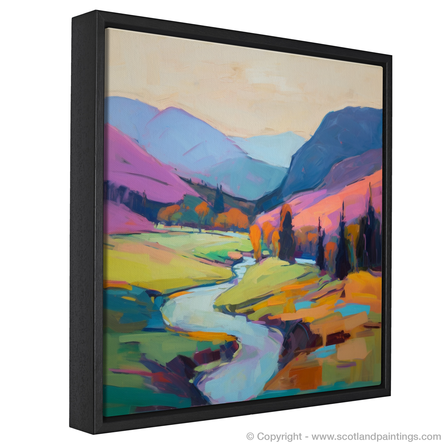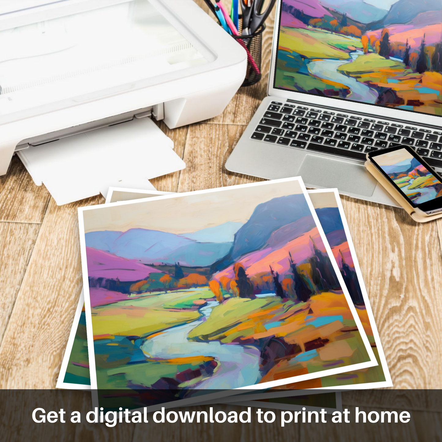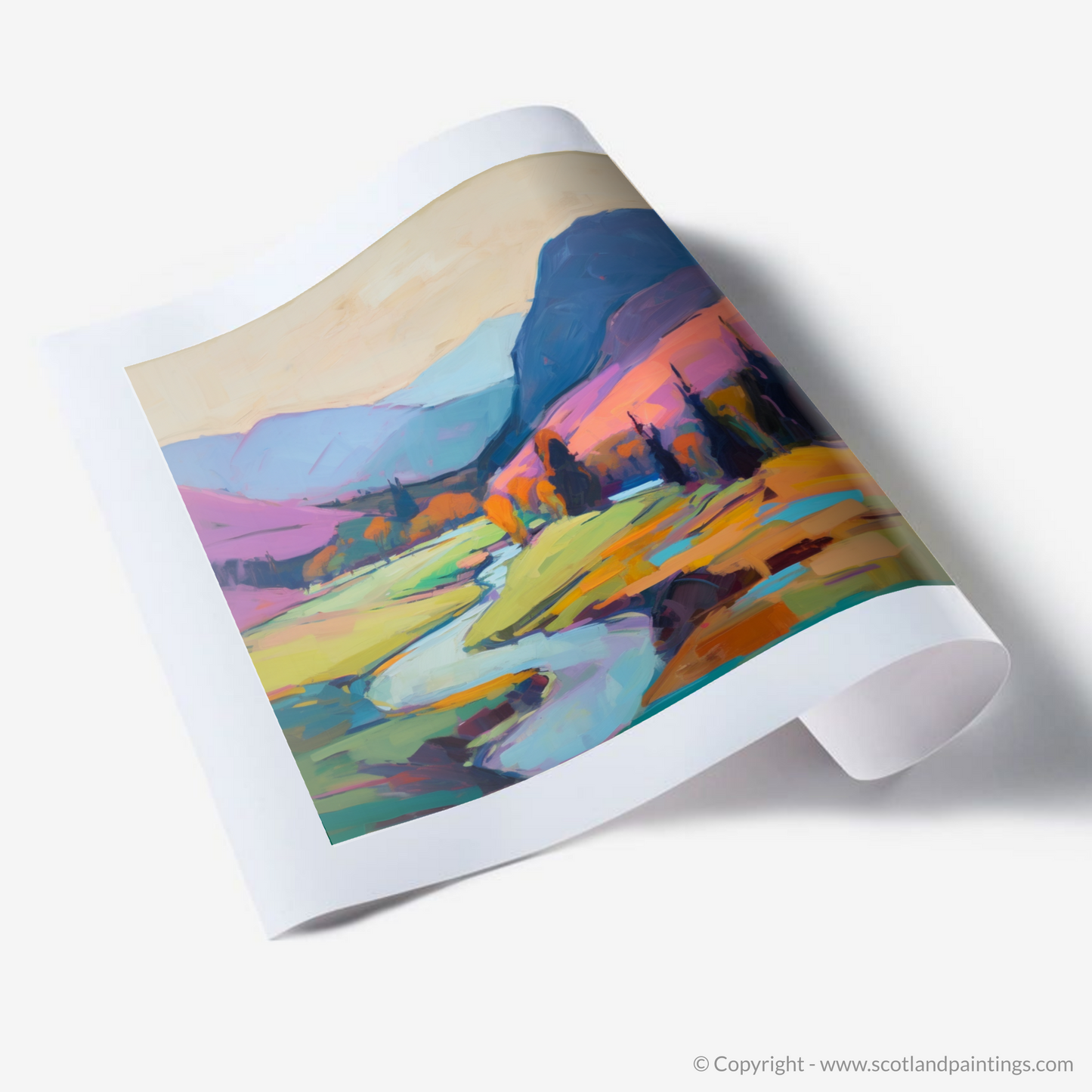 Step into the vibrant serenity of Glen Lyon with this exquisite print, a flowing tapestry of modern artistry that captures the essence of one of Scotland's most picturesque glens. This piece transports admirers to the heart of Perthshire, reimagining the traditional landscape through a kaleidoscope of bold, contemporary colours and expressive brushstrokes that dance across the canvas.