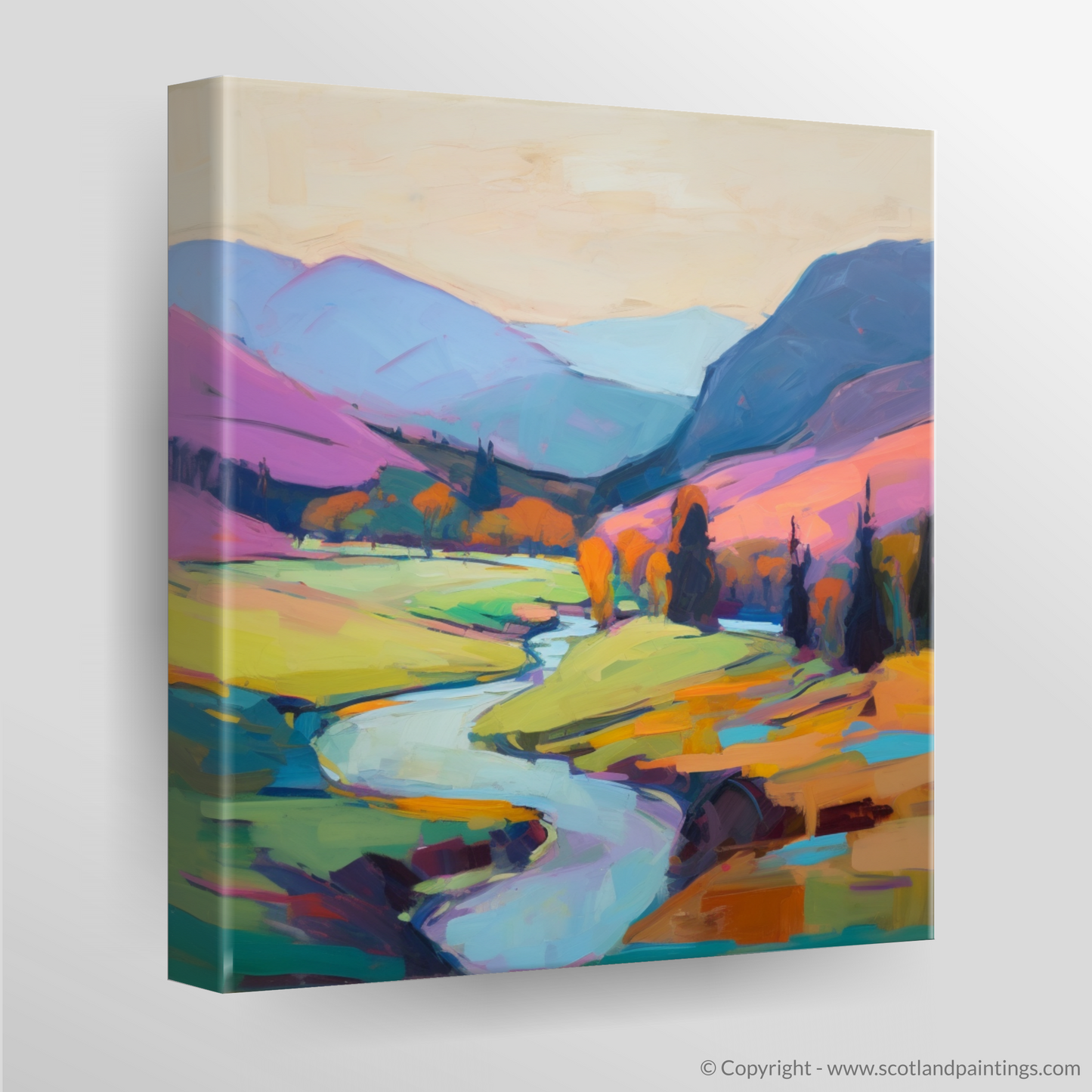 As your gaze moves through the scene, you'll find yourself meandering along the river's gentle curves, reflecting a sky awash with soft pastel hues that transition into the dynamic warmth of a setting sun. Further exploration reveals rolling hills and valleys rendered in purples and blues, suggesting the majestic tranquility of the Scottish highlands, while shocks of orange and yellow infuse the land with an otherworldly glow, echoing the glen's natural majesty through a vibrant, modern lens.
