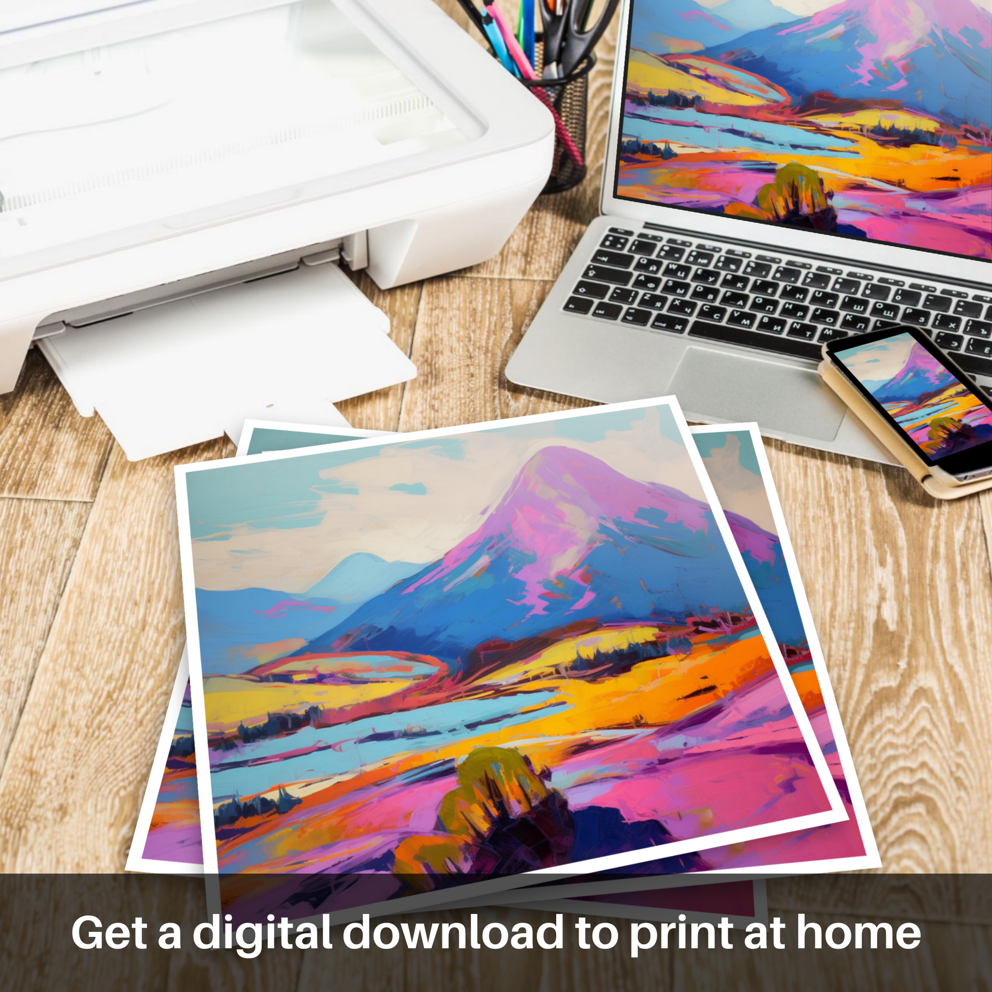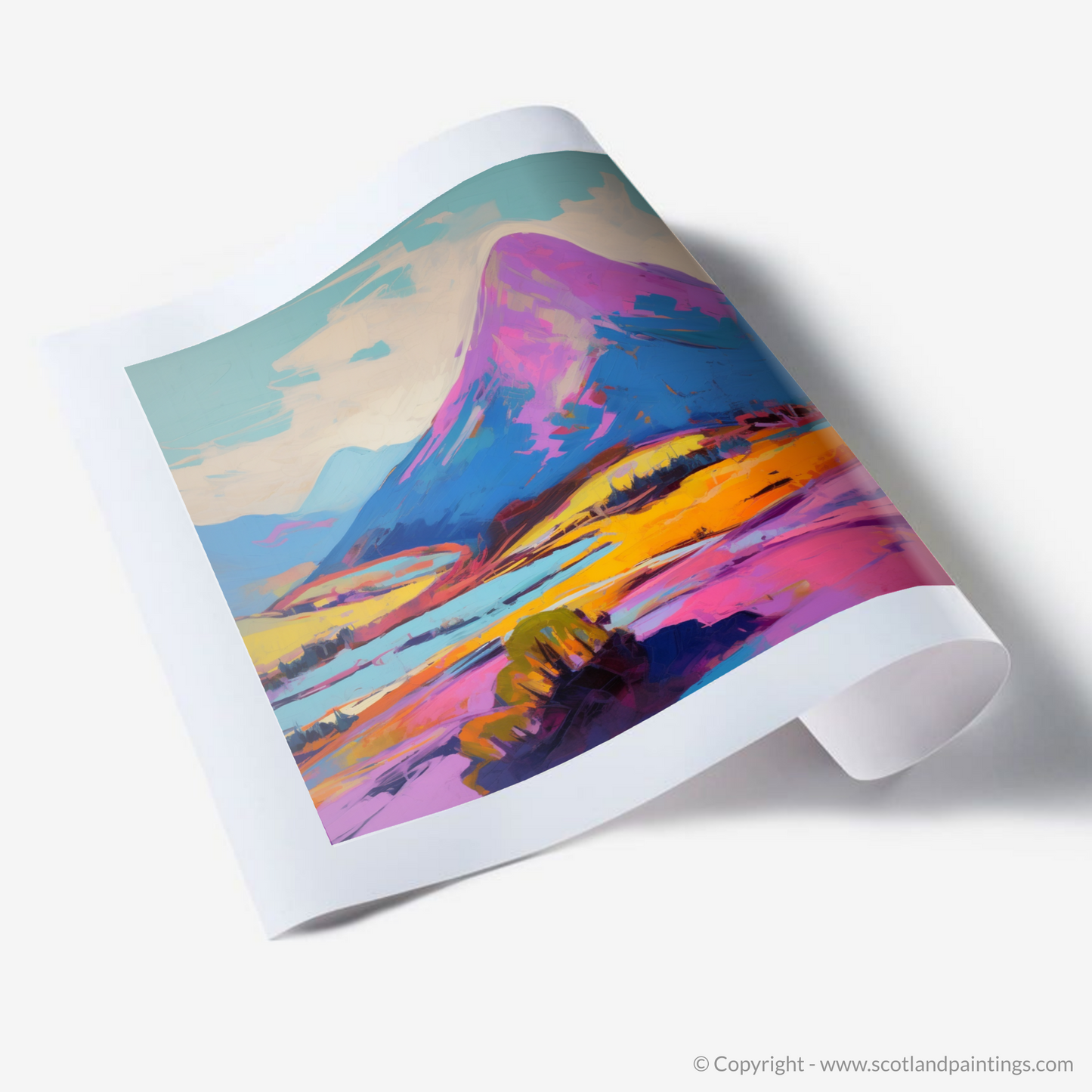 This print is more than just a portrayal of one of Scotland's storied peaks; it's an interpretation that bridges the gap between nature and artistry, transporting the viewer to a domain where horizons are limitless, and the natural world is awash with unexpected colour. It's a piece for the collector who seeks to combine their love for the Scottish wilderness with a penchant for bold, contemporary art that dares to redefine the landscape genre.