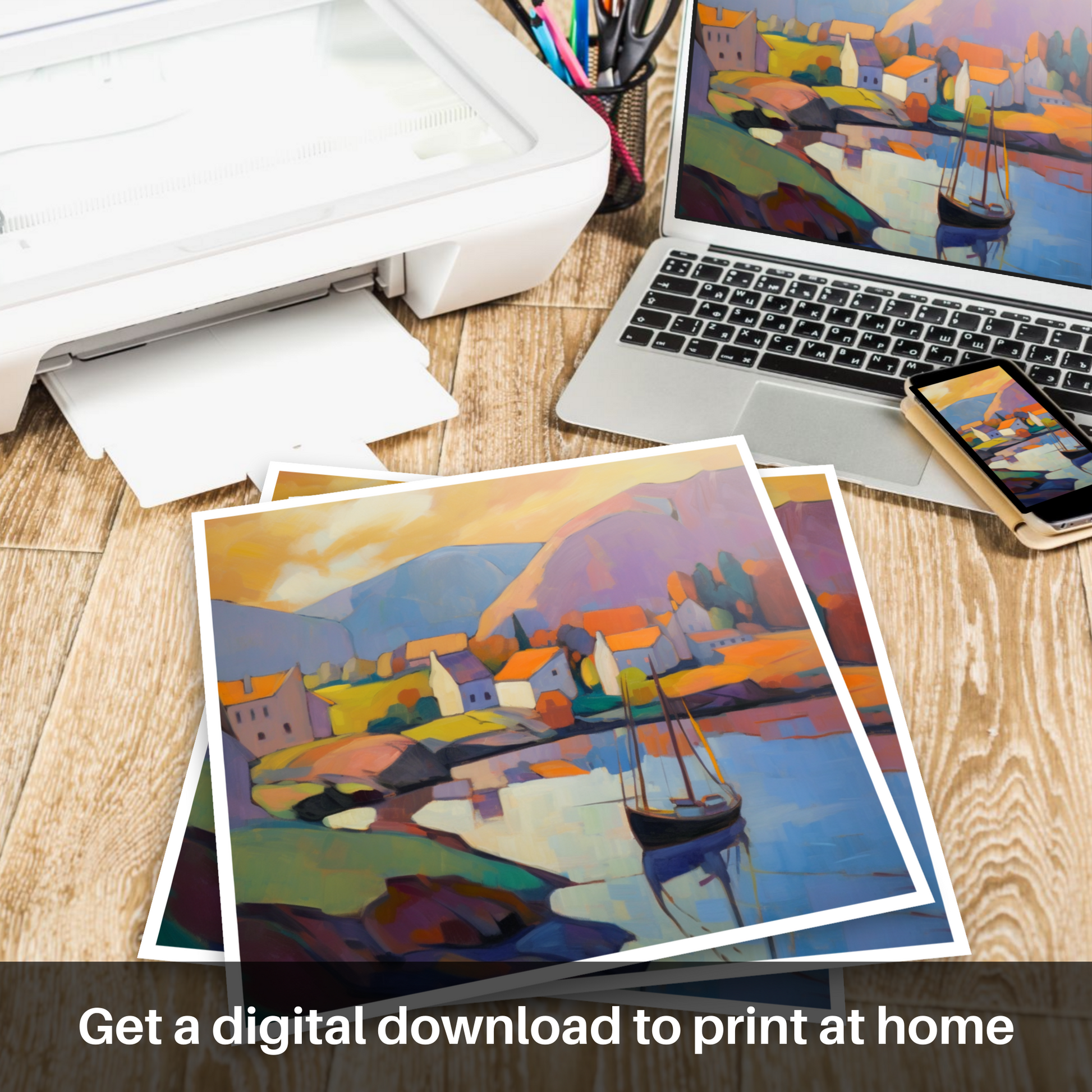 The distillation of the scene into a dance of colour and shape reflects not just the physical beauty of Port Ellen, but the timeless appeal of Scottish harbours—a fleeting moment eternalised, inviting contemplation and providing an endless source of introspective pleasure for the observer. Add this print to your space, and let the cubist interpretation of the day's final rays be a beacon of artistry and imagination.