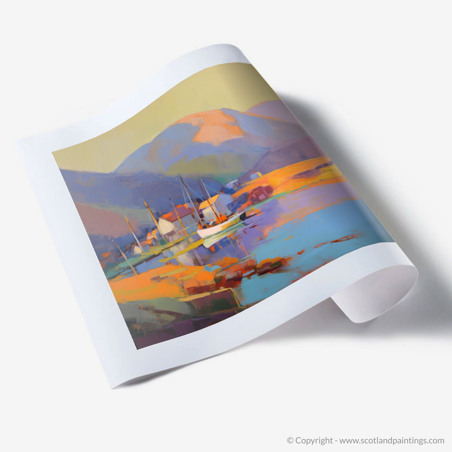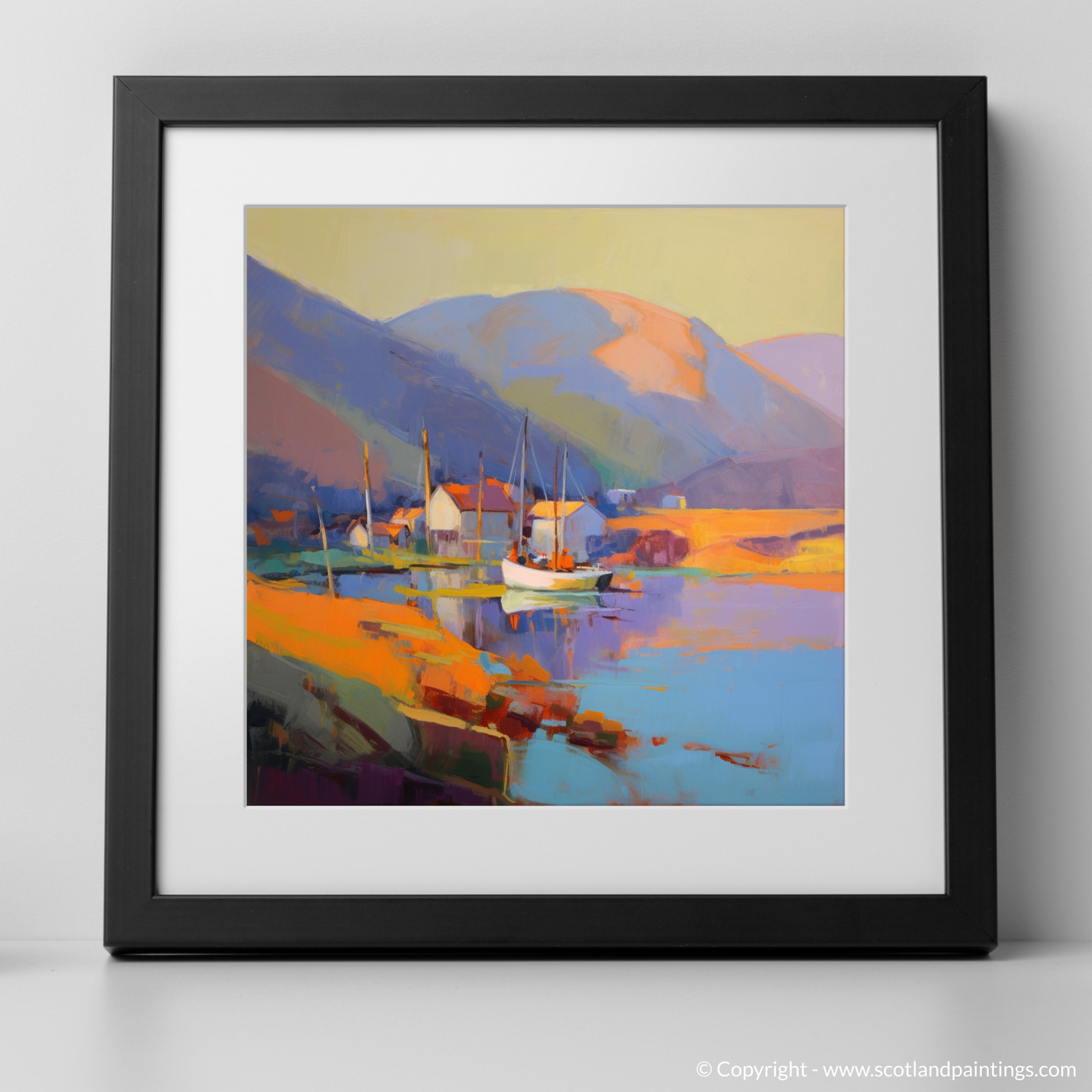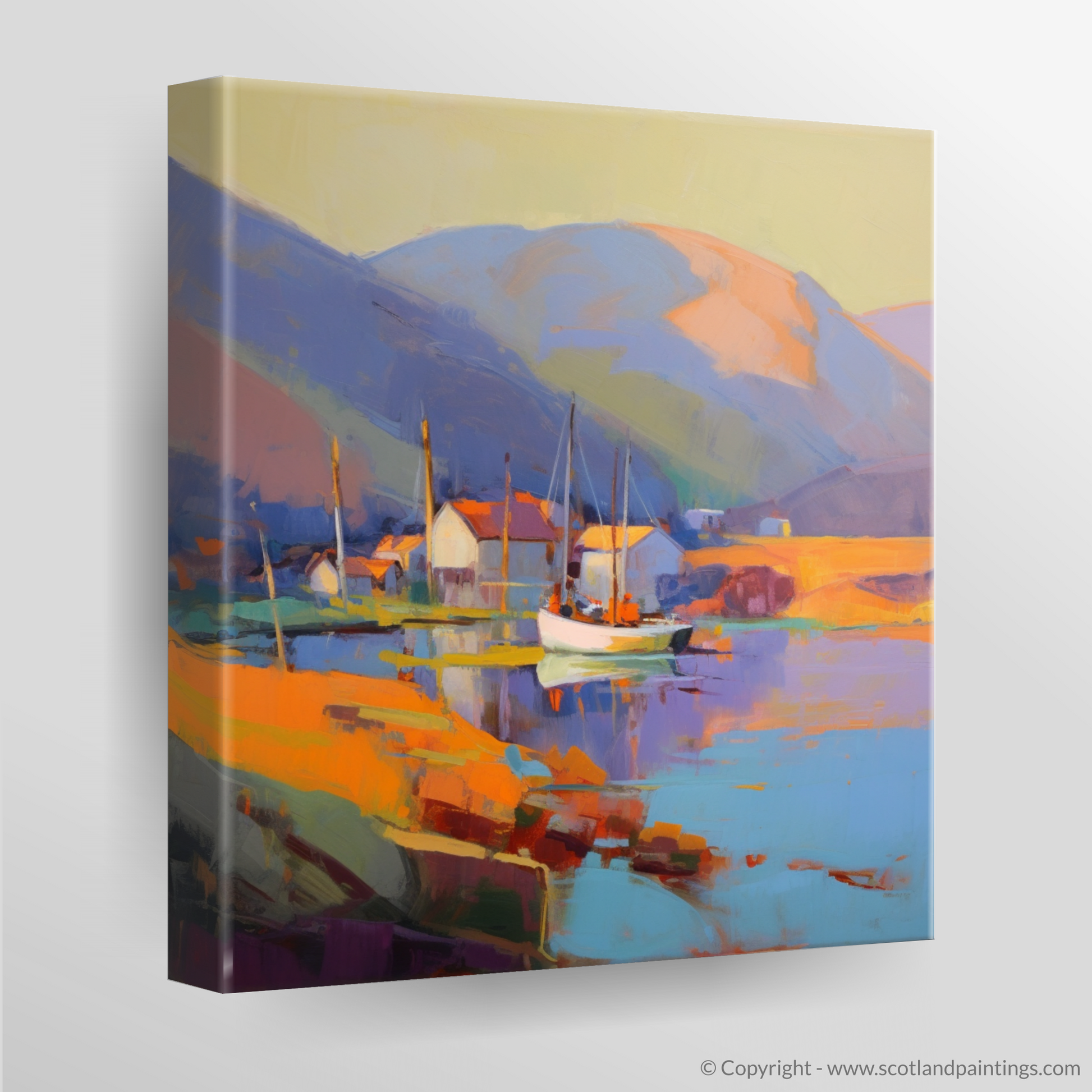 Hints of vibrant reds and purples offset the ochre tones of the harbourside buildings, creating a striking contrast that invigorates the senses. The artist's skillful use of brushstrokes and colour blocking affords the piece a contemporary edge while retaining the essence of Ullapool's picturesque charm.