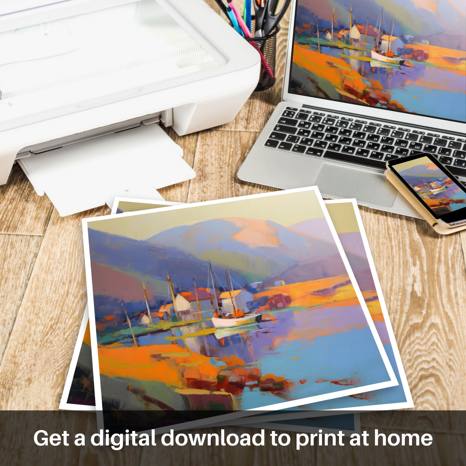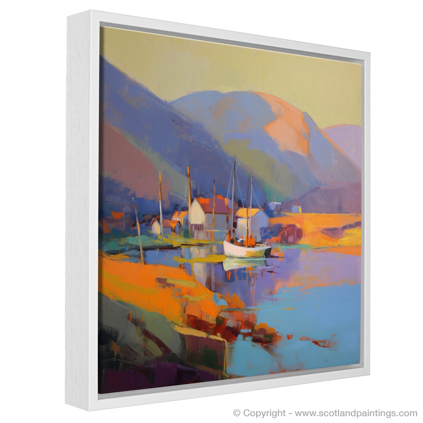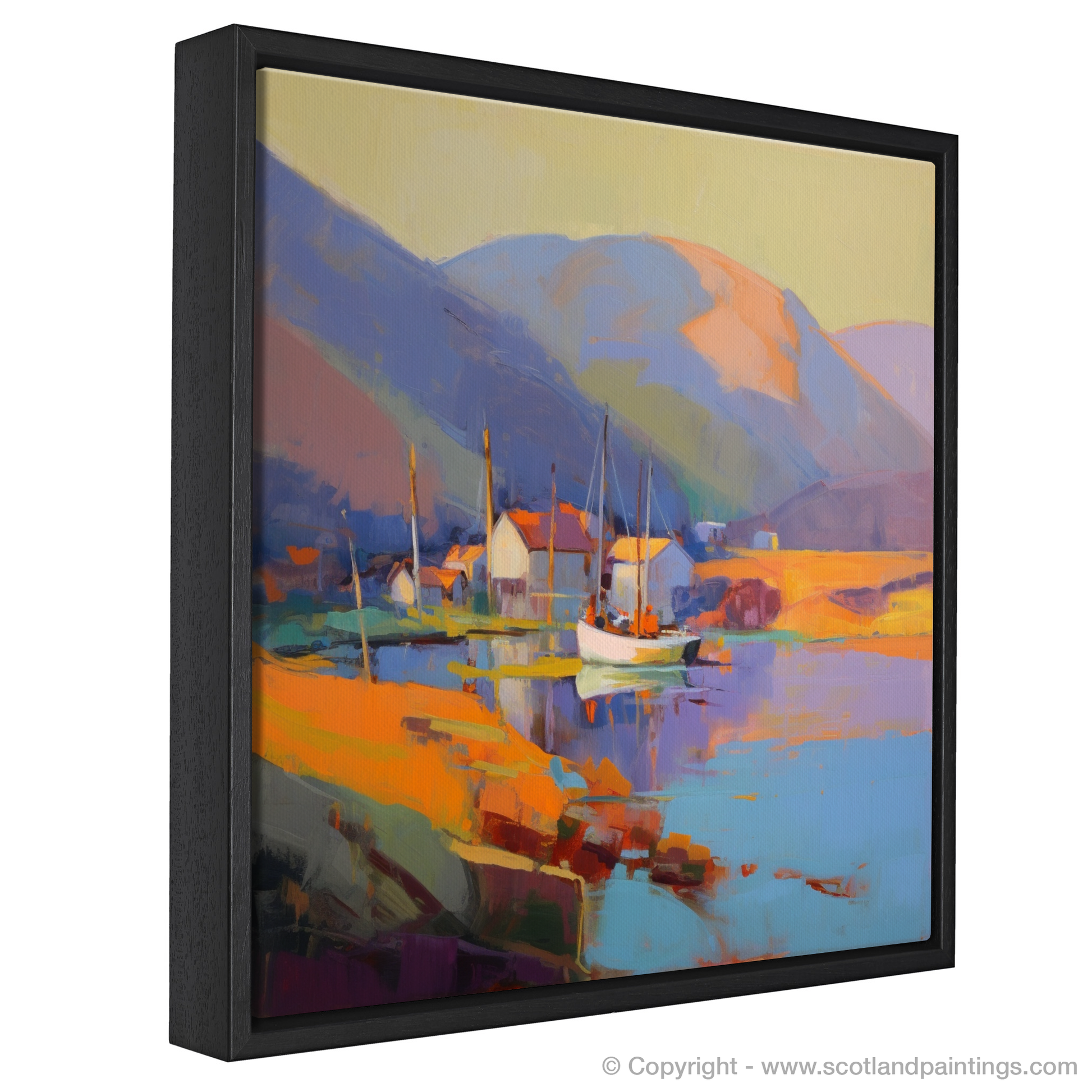 Hints of vibrant reds and purples offset the ochre tones of the harbourside buildings, creating a striking contrast that invigorates the senses. The artist's skillful use of brushstrokes and colour blocking affords the piece a contemporary edge while retaining the essence of Ullapool's picturesque charm.
