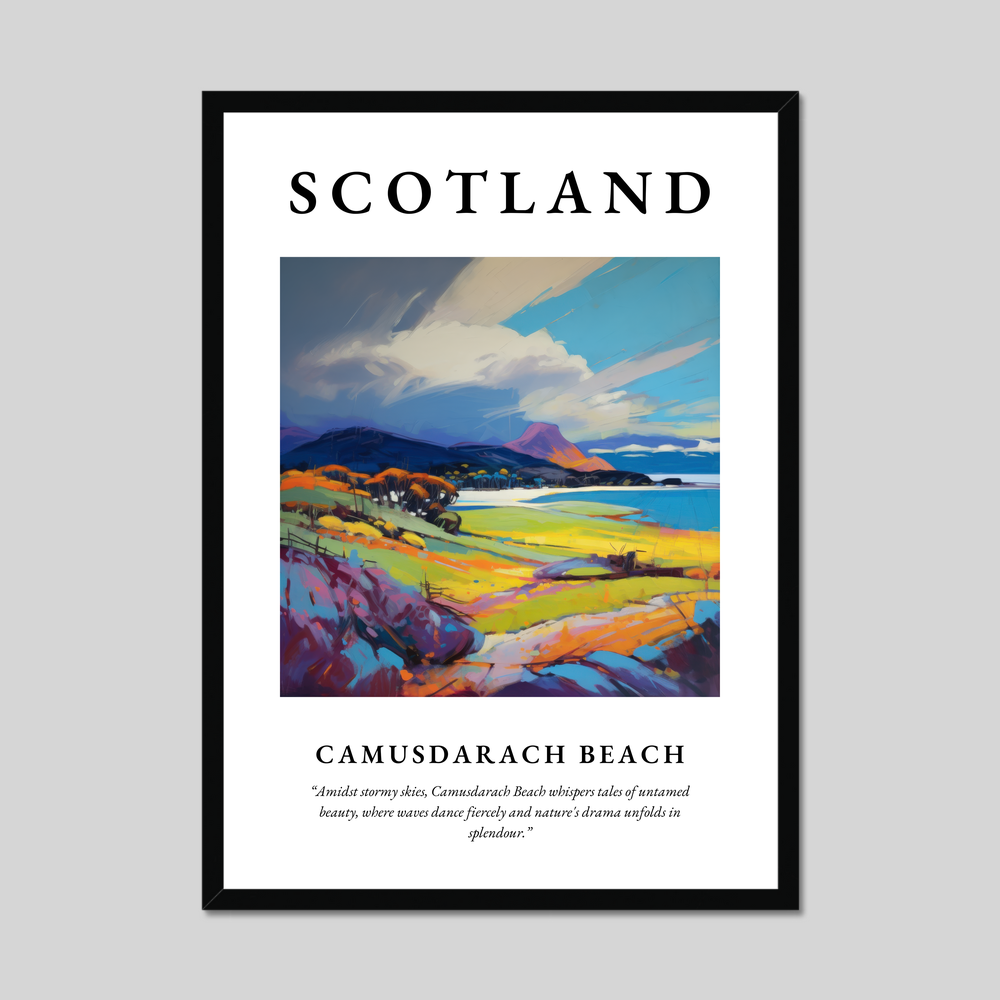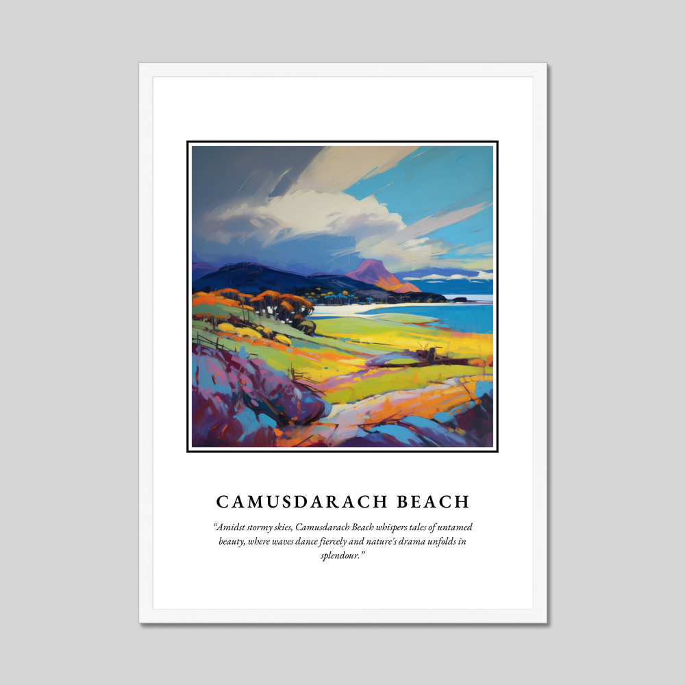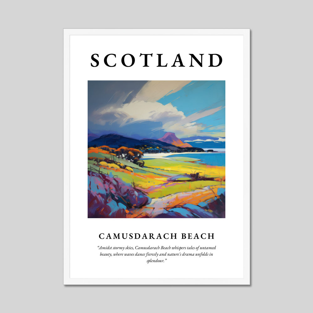 Camusdarach Beach, nestled on the stunning west coast of Scotland, is famed for its dramatic landscapes and azure waters. It's a place where the restless sea meets rugged cliffs, a backdrop that inspires artists and adventurers alike. The painting encapsulates this enchanting vista, bringing to life the unpredictable weather and untamed nature that makes the beach so memorable. Whether you've wandered these shores yourself or dream of doing so, this poster offers a tangible slice of Scotland's captivating wilderness.