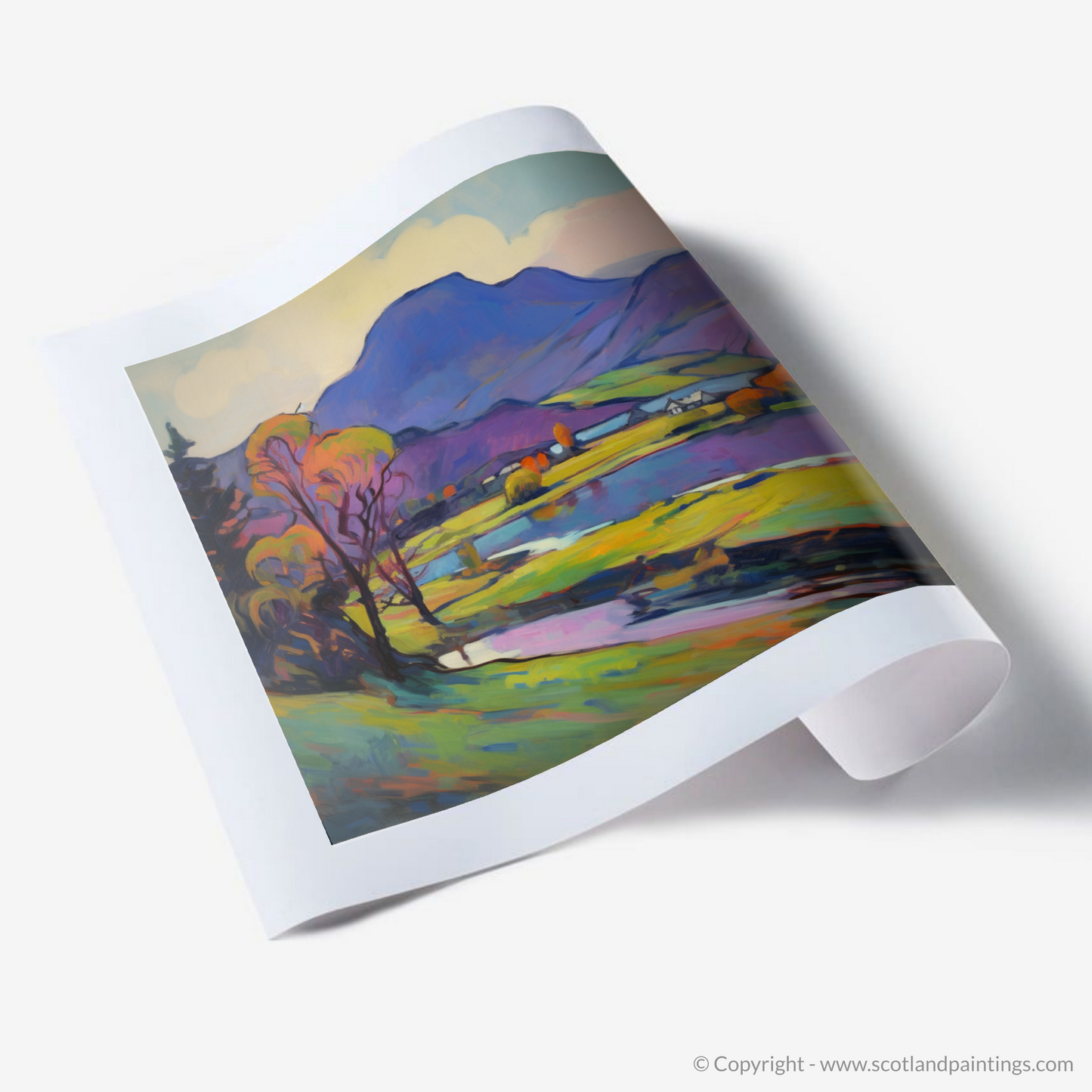 Immerse yourself in the vibrant and raw beauty of the Scottish Highlands with our stunning print, capturing Loch Awe's serene majesty through a Fauvist lens. This striking portrayal is an eruption of colour, bringing a contemporary verve to the time-honoured landscape. The artwork showcases a bold palette – with vivid purples, pinks, and blues that command attention and convey emotion, characteristic of the Fauvist style's departure from realistic colouration.