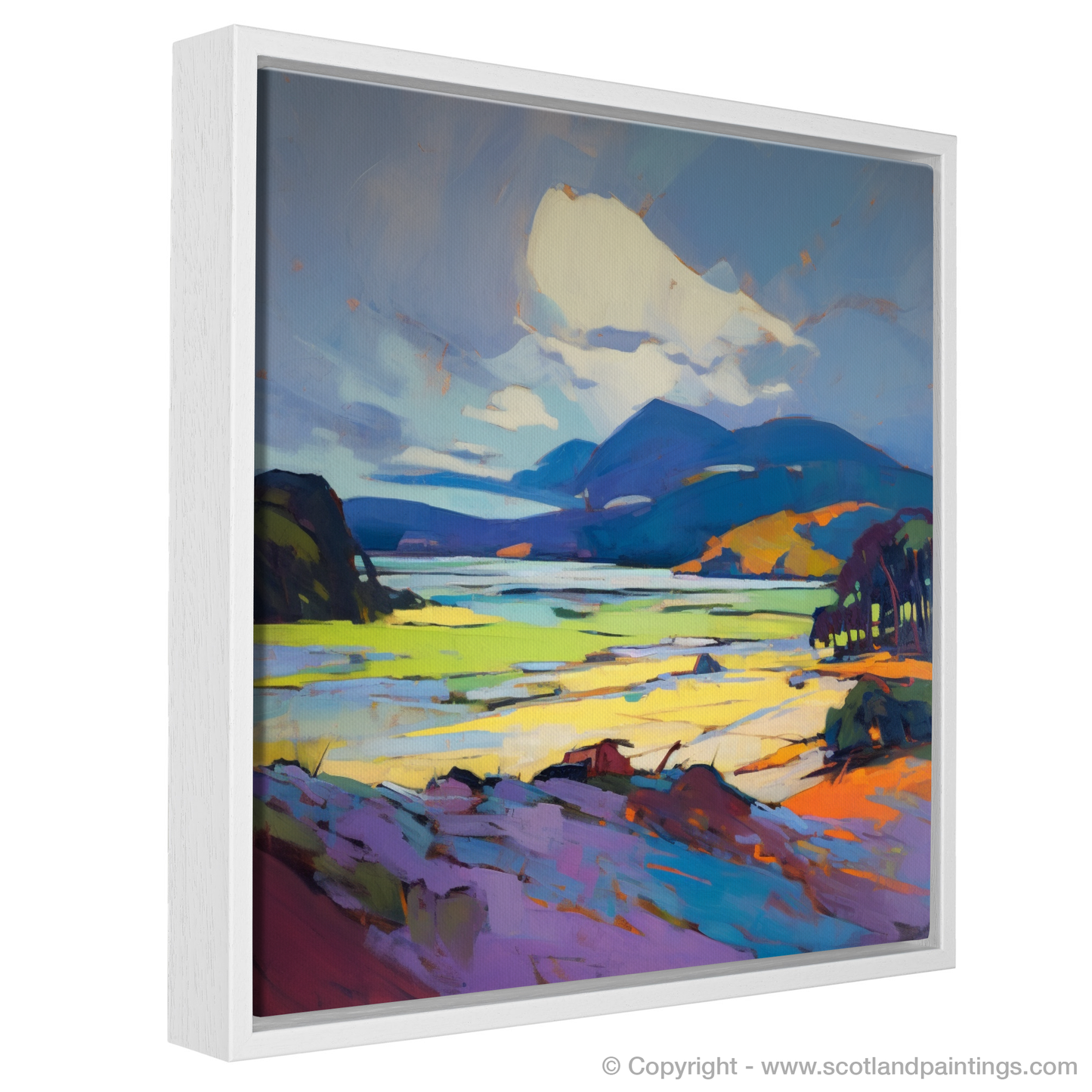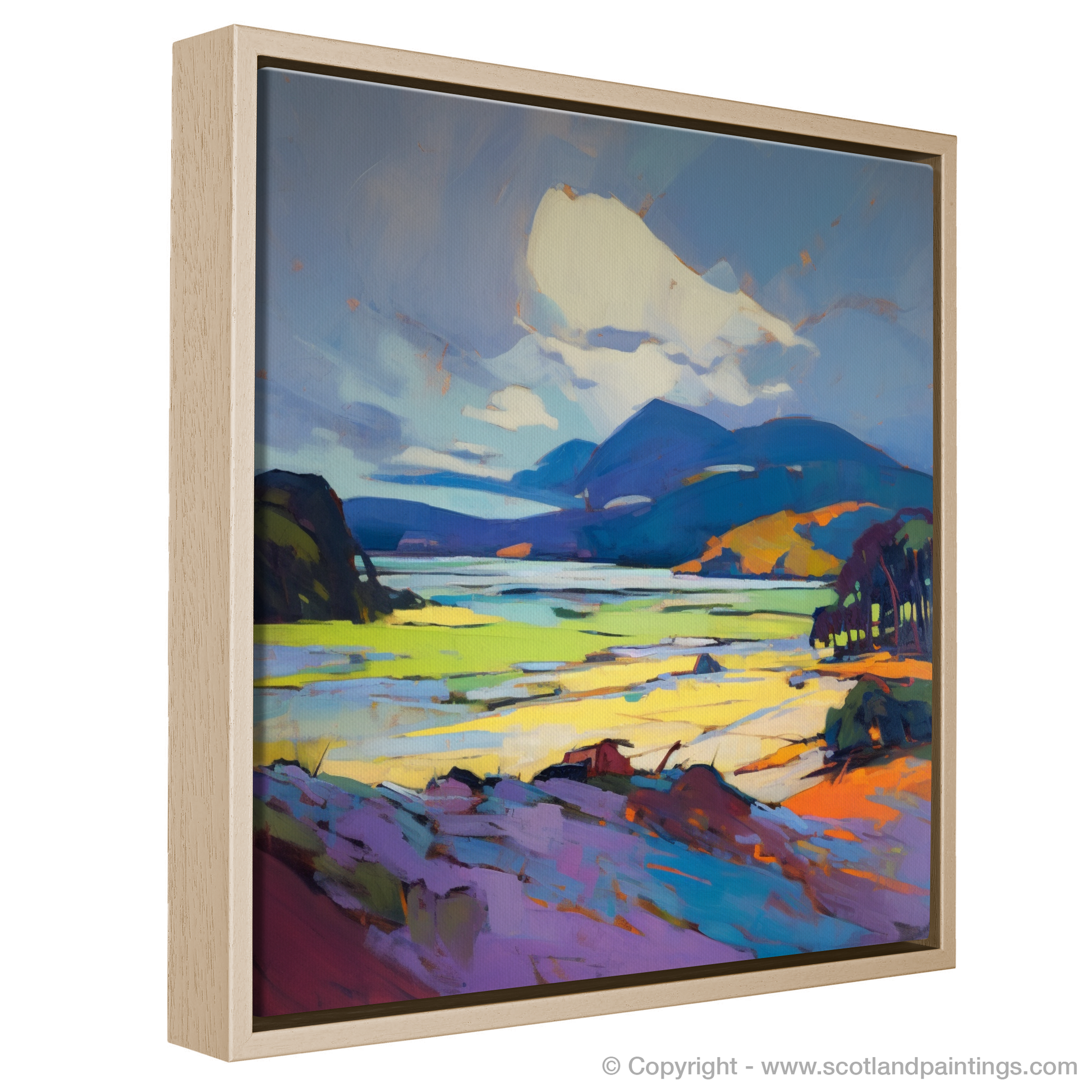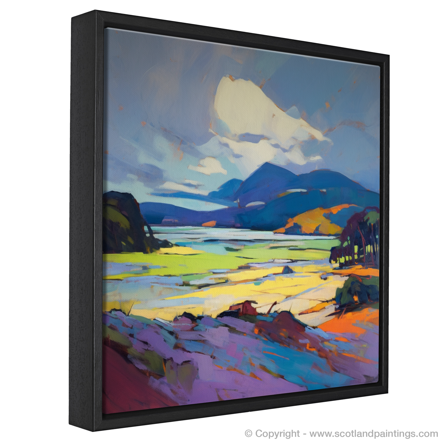 Capturing the tempestuous mood of Scotland's natural landscapes, this abstract print takes inspiration from the rugged beauty of Camusdarach Beach, masterfully reimagined in an array of expressive colours and bold textures. The artwork evokes the untamed energy of a stormy sky, with dynamic shades of cobalt and slate forming tumultuous clouds that dominate the upper canvas, suggesting a profound drama unfolding overhead.