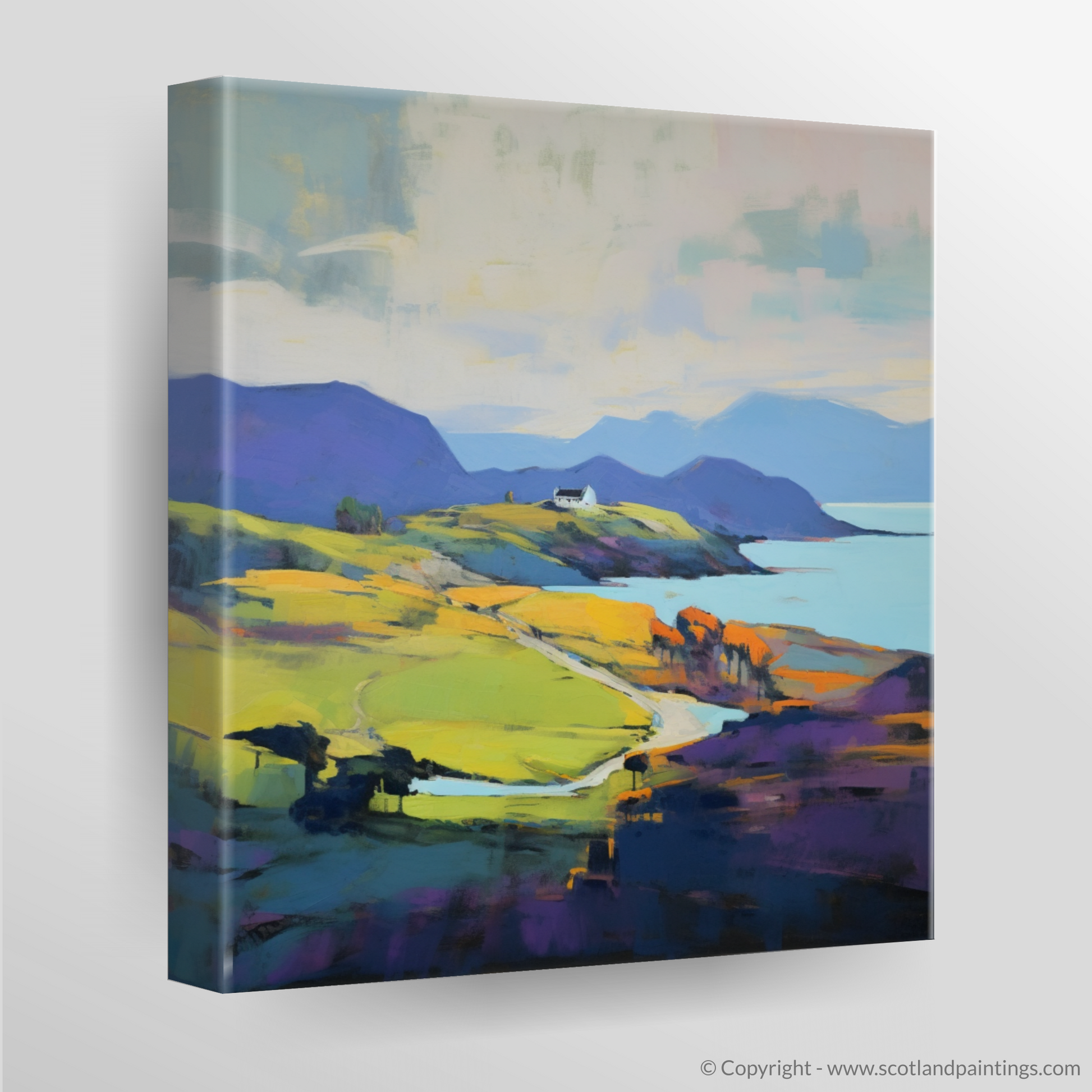 The eye is immediately drawn to the striking contrast of the deep purples and blues of the rolling hills that ebb into softer shades, suggesting the distant mountains shrouded in mist. These cool tones play against the warming splashes of yellow and orange, bringing to life the wildflower-speckled fields and heather-blanketed moorlands that typify Islay's diverse terrain.