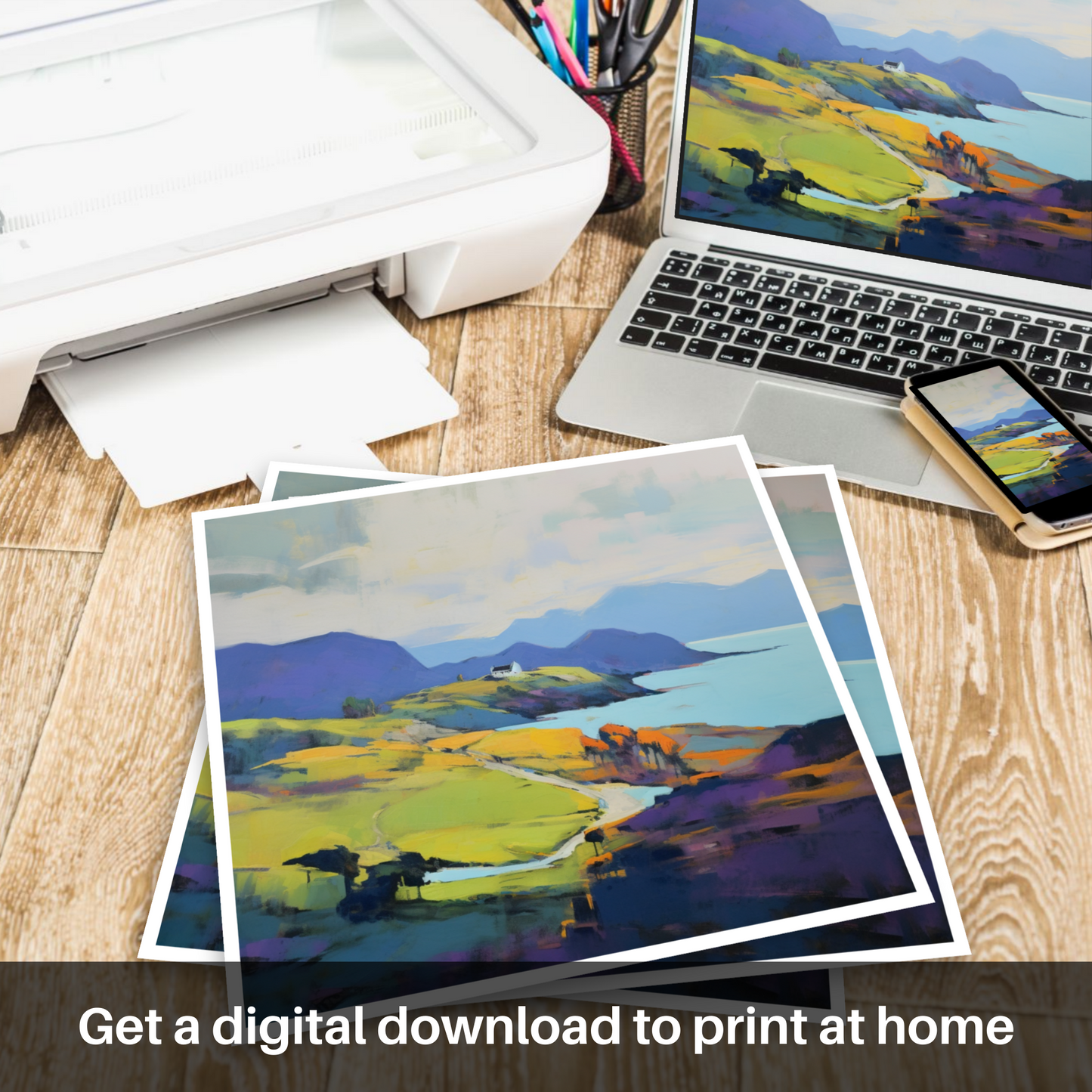 Immerse yourself in the vibrant hues and bold strokes that reflect the untamed beauty of the Isle of Islay, a gem in the Inner Hebrides' crown. This vivacious print captures the dynamic charm of the Scottish isles with a flourish of Pop Art panache, offering a contemporary twist on a classic landscape.