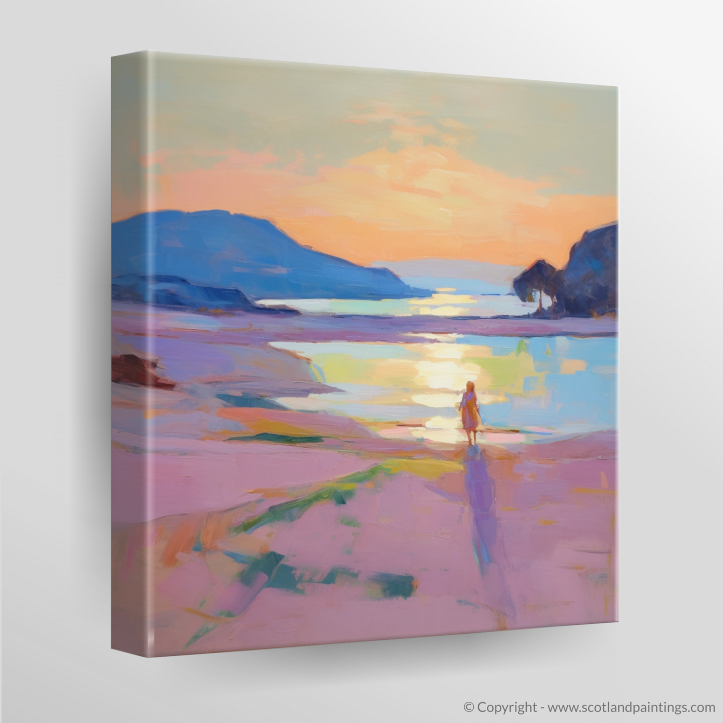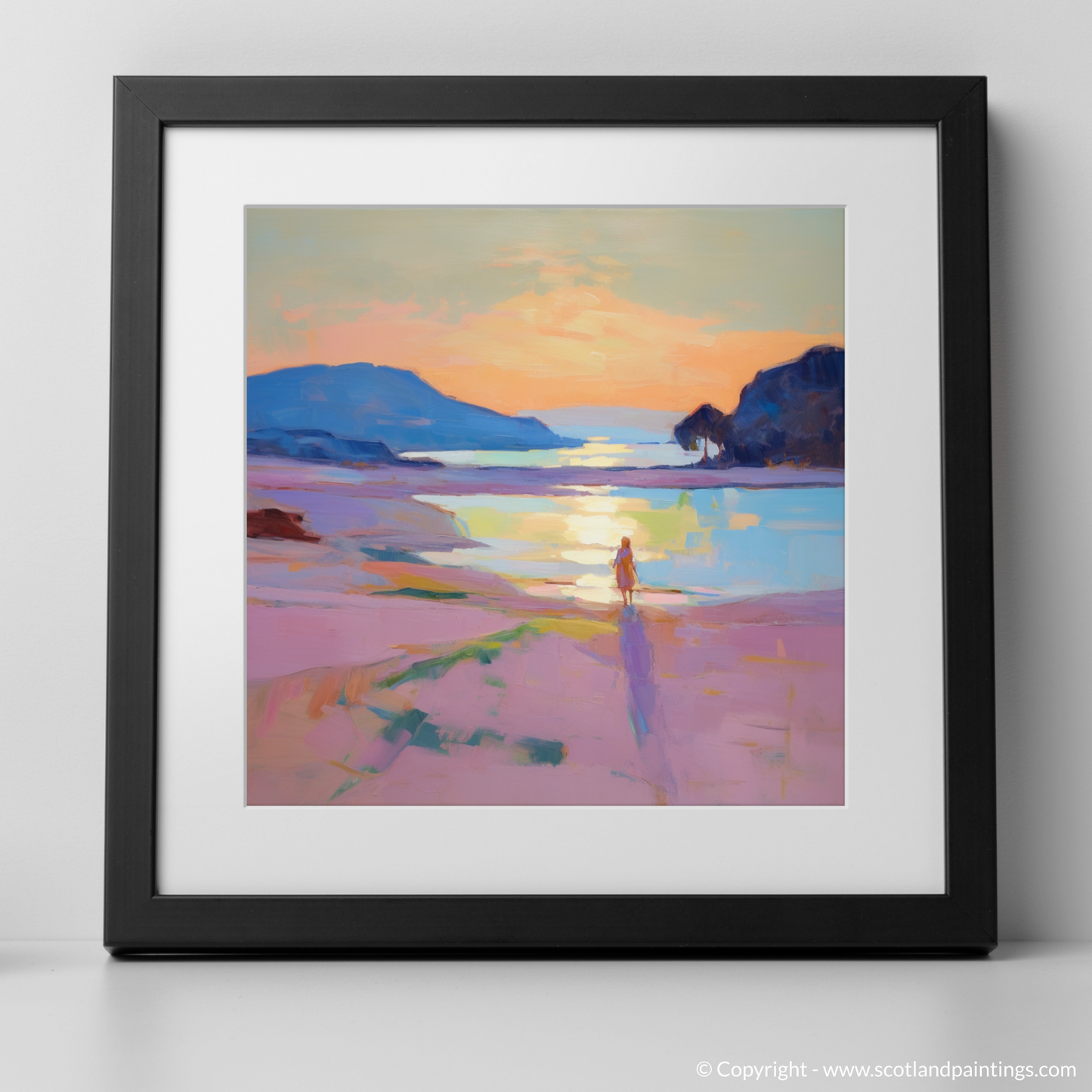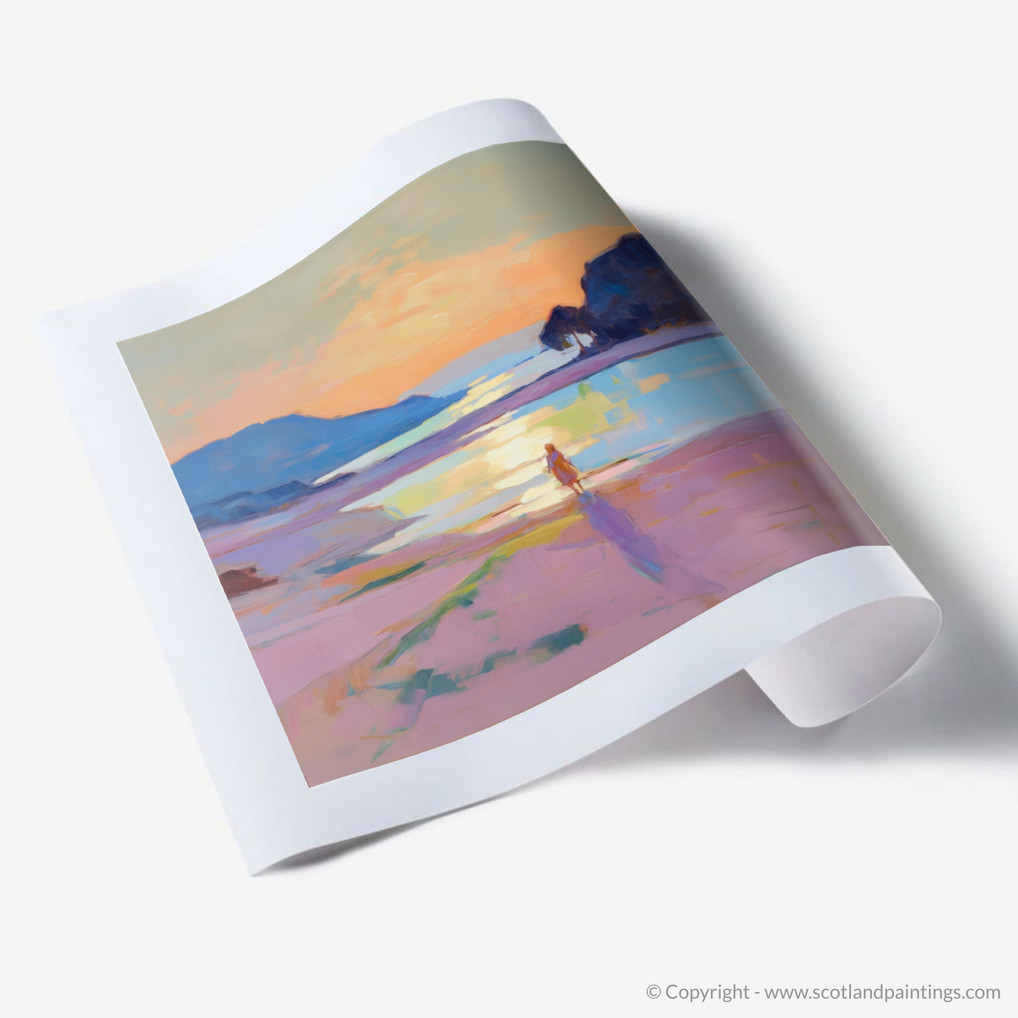 Immerse yourself in the tranquil beauty of Lunan Bay at the serene moment of dusk, captured exquisitely in this Impressionist-inspired print. The art piece beckons viewers to stroll along the shoreline as it is softly illuminated by the last whispers of daylight. Soothing hues of mauve, blush, and lilac wash over the sands, lending an almost dreamlike quality to the seascape, as delicate brushstrokes mimic the gentle lapping of the tide against the shore.