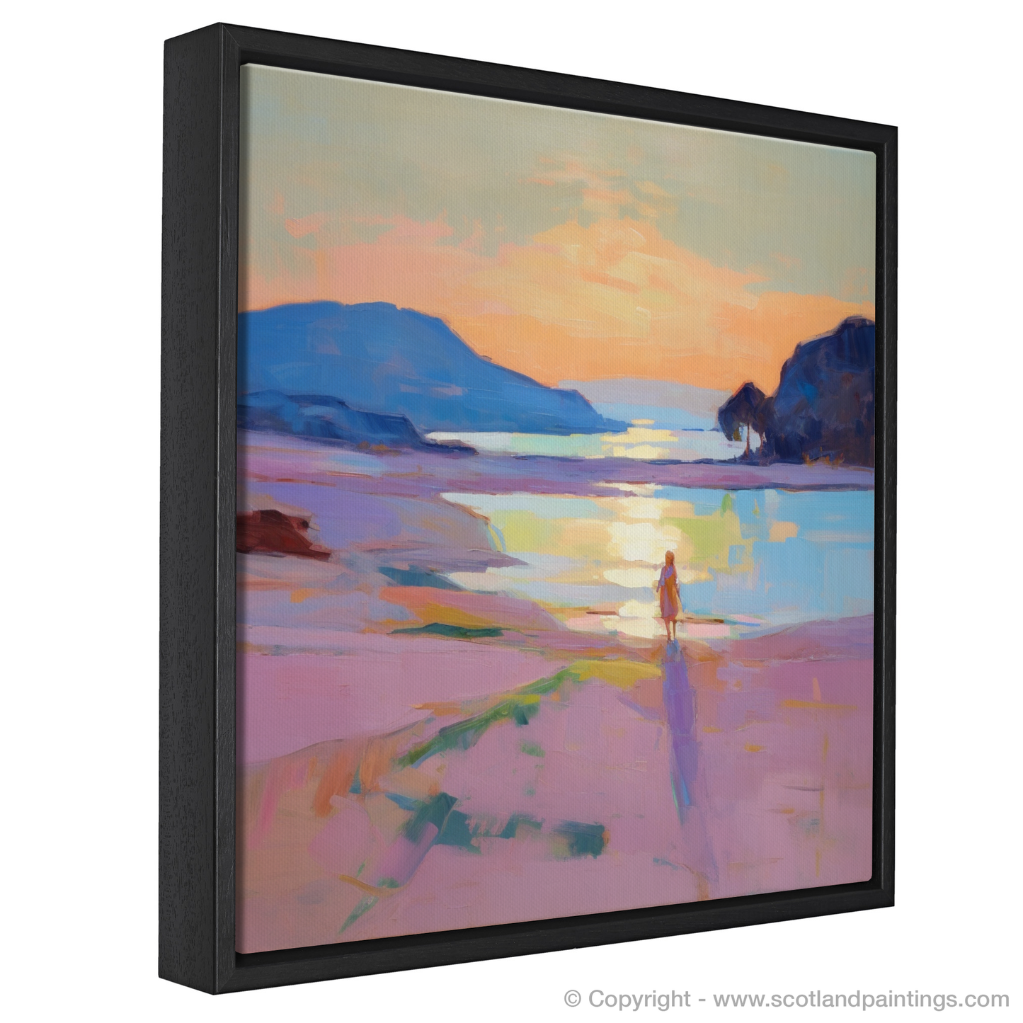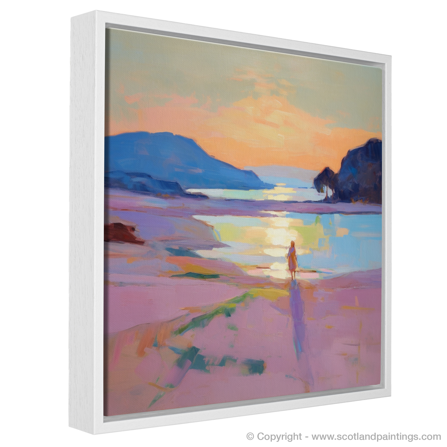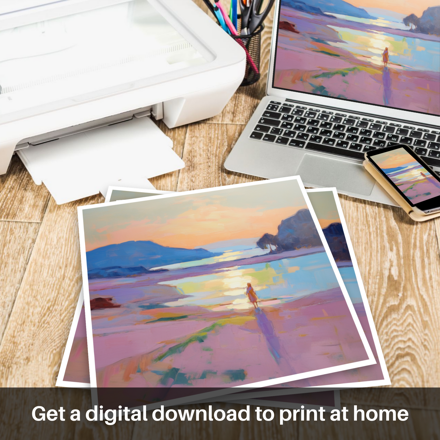 Immerse yourself in the tranquil beauty of Lunan Bay at the serene moment of dusk, captured exquisitely in this Impressionist-inspired print. The art piece beckons viewers to stroll along the shoreline as it is softly illuminated by the last whispers of daylight. Soothing hues of mauve, blush, and lilac wash over the sands, lending an almost dreamlike quality to the seascape, as delicate brushstrokes mimic the gentle lapping of the tide against the shore.