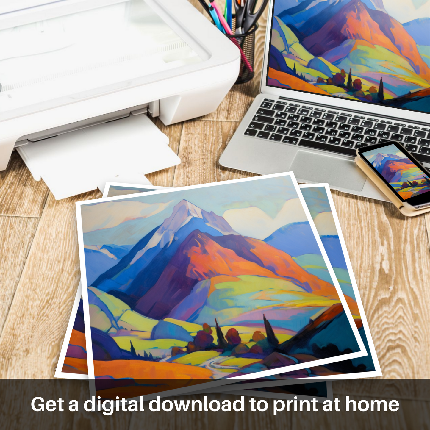 The print captures the essence of Cubist artistry, with angular forms segmenting the rolling hills and soaring peak, creating a dynamic composition. Every facet of the mountain and surrounding valley is infused with a burst of colour, from the deep purples and blues casting dramatic shadows to the warm oranges and yellows reflecting the sun's embrace.