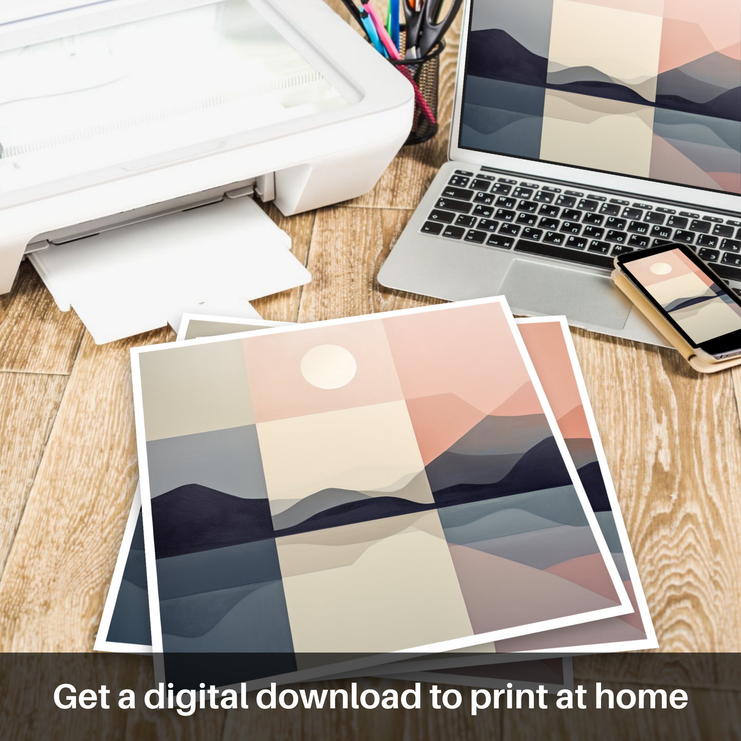 Crafted with a symphony of muted hues, the artwork epitomises tranquillity through its harmonious colour blocks that effortlessly convey the peaceful hours of dawn or dusk. The top half of the composition basks in a gentle gradient of warm blush and subtle cream, crowned by a singular, unadorned circle suggestive of the sun or moon's celestial presence.