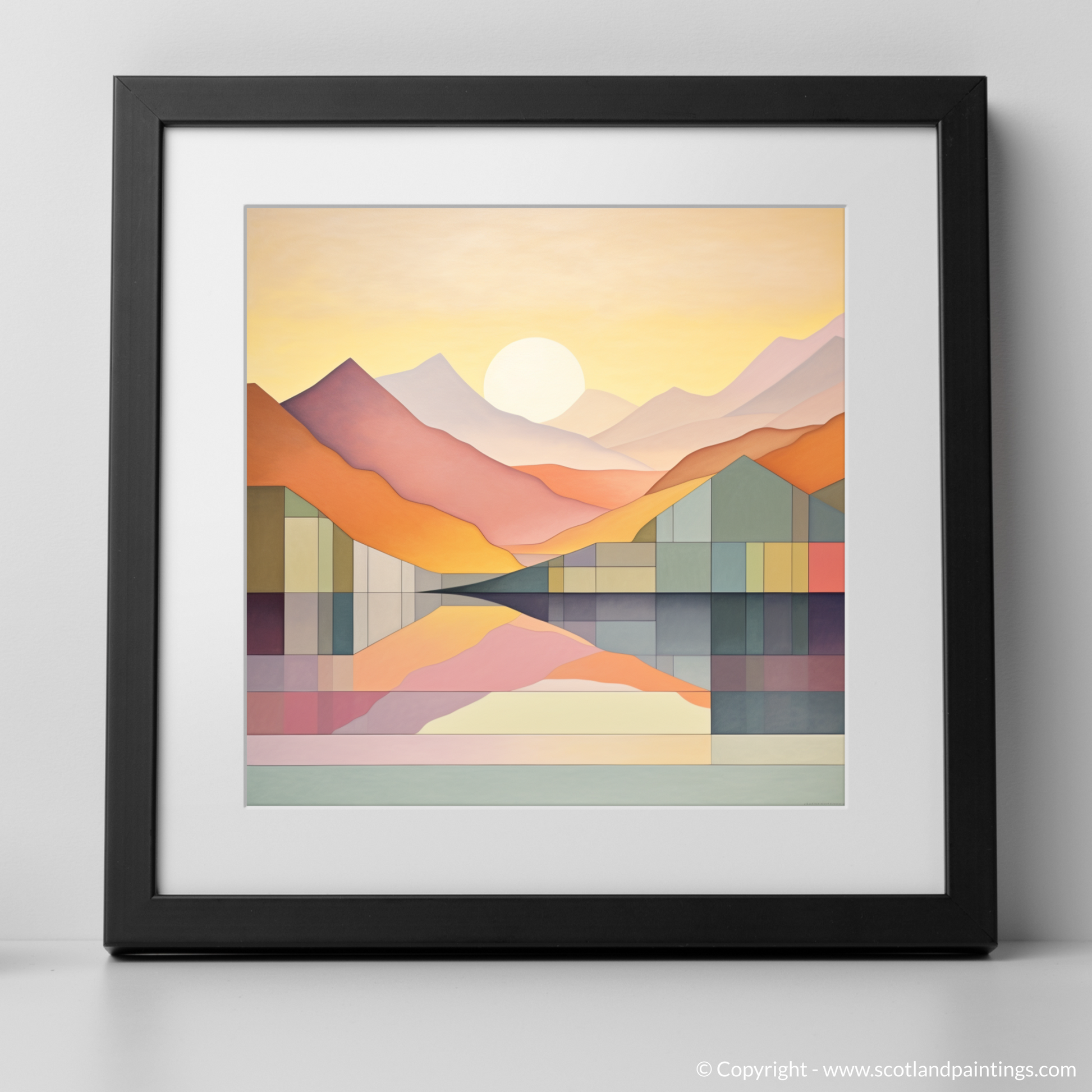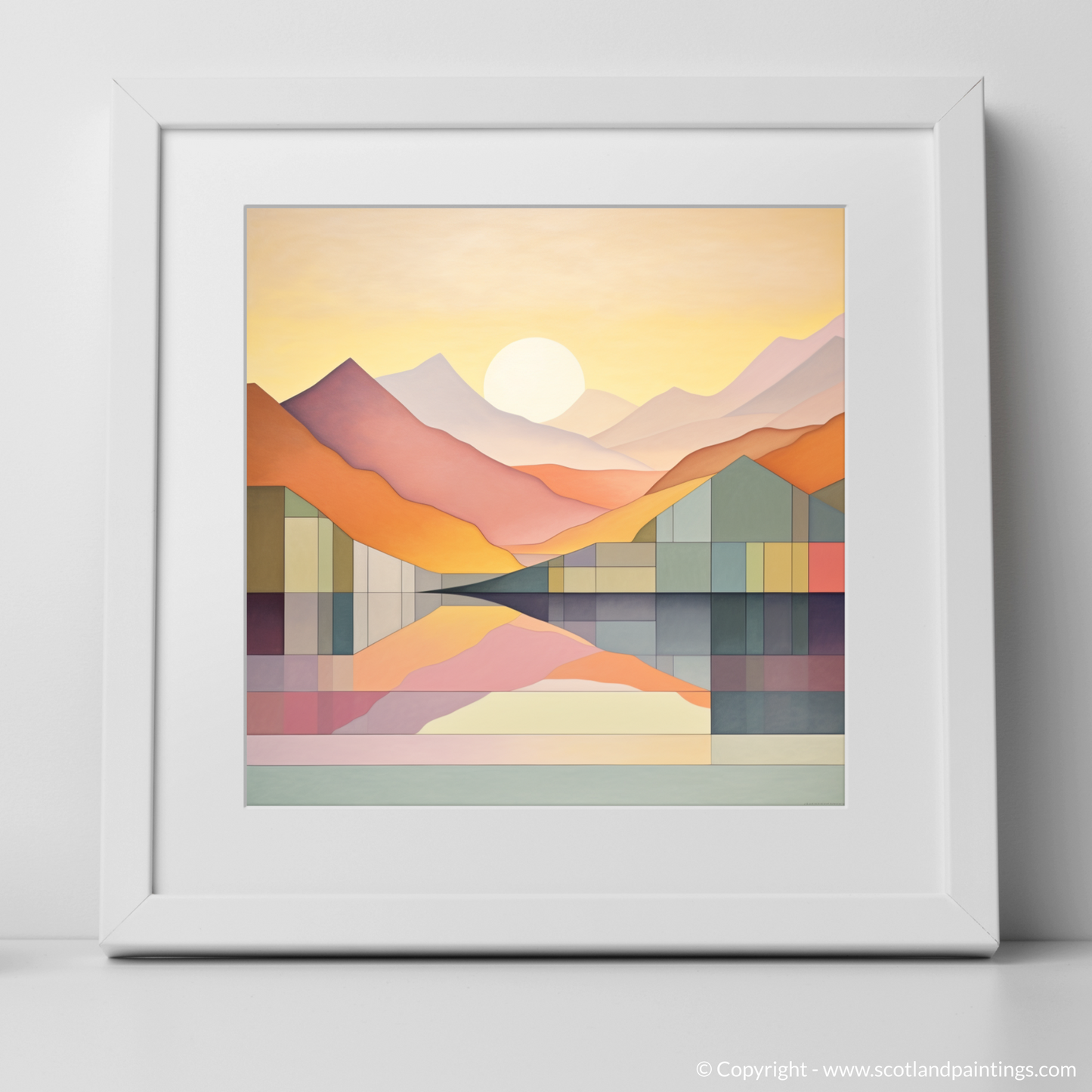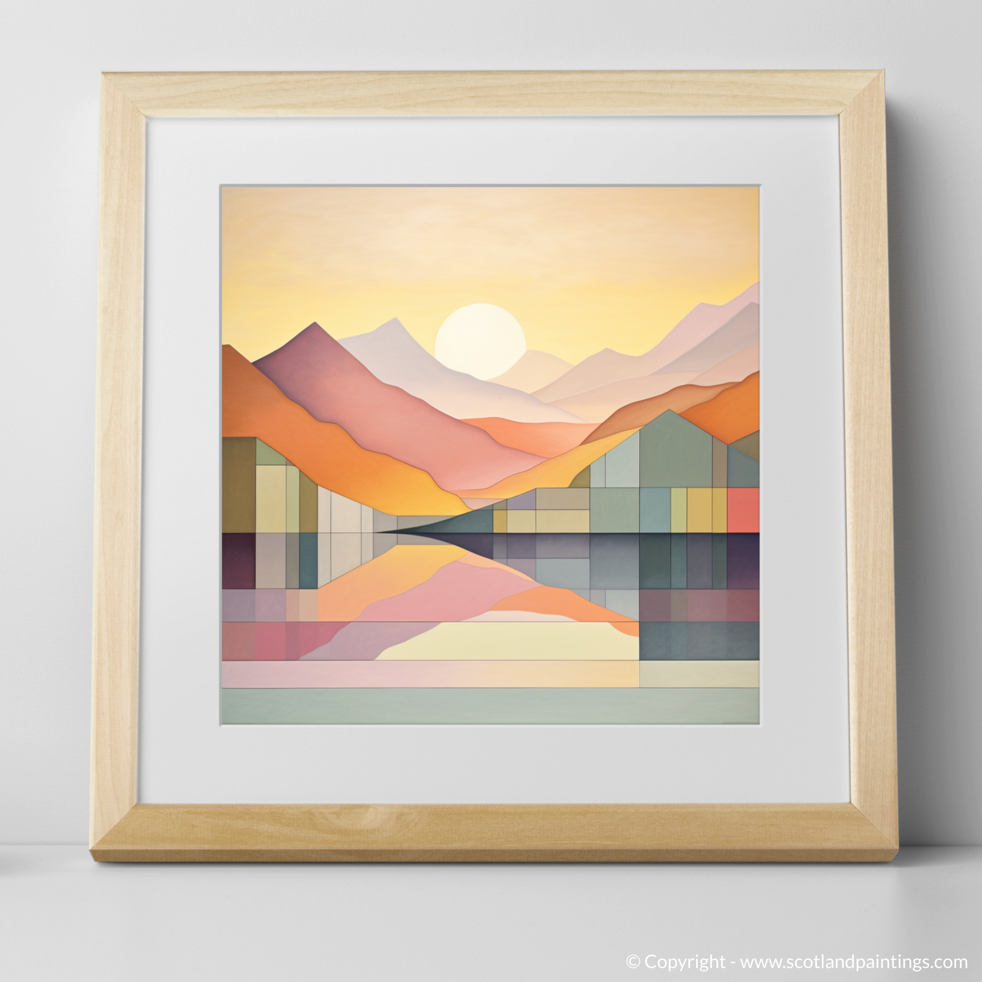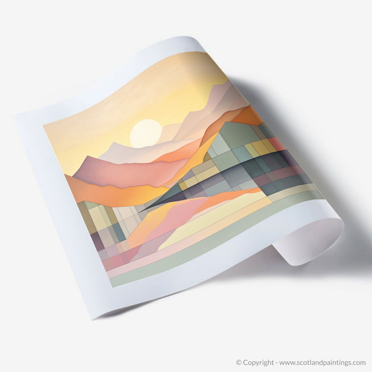 Captivated by the serene beauty of Loch Morar, this sophisticated print embodies the essence of minimalism with its harmonious geometric abstraction. The artwork interprets the tranquil Scottish landscape through a symphony of soft, warm hues caressing the viewer's senses, as peach and rose-coloured peaks descend into cool, muted reflections upon the still waters below.