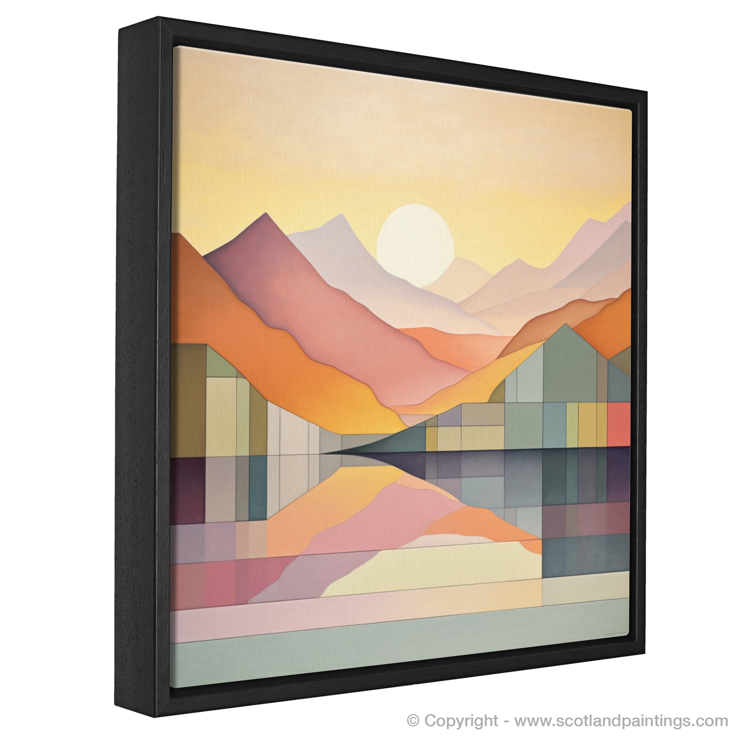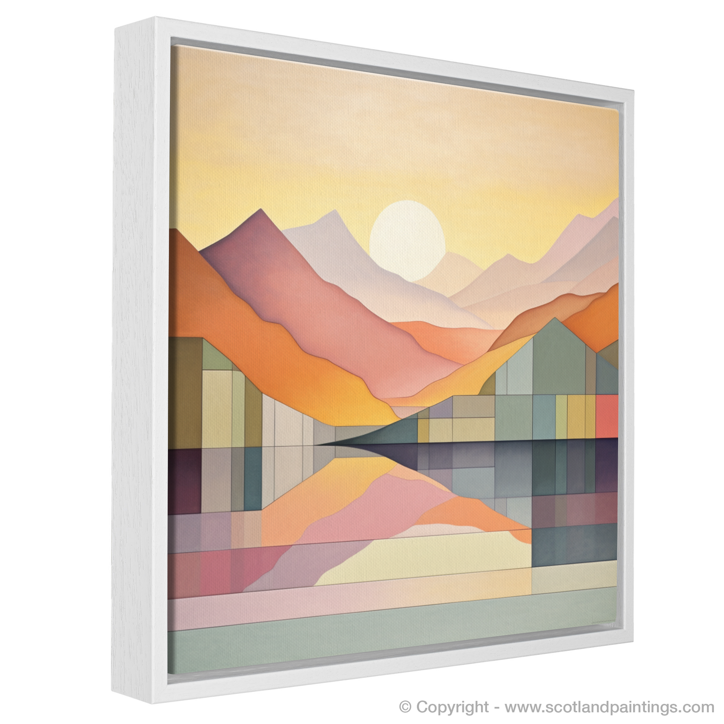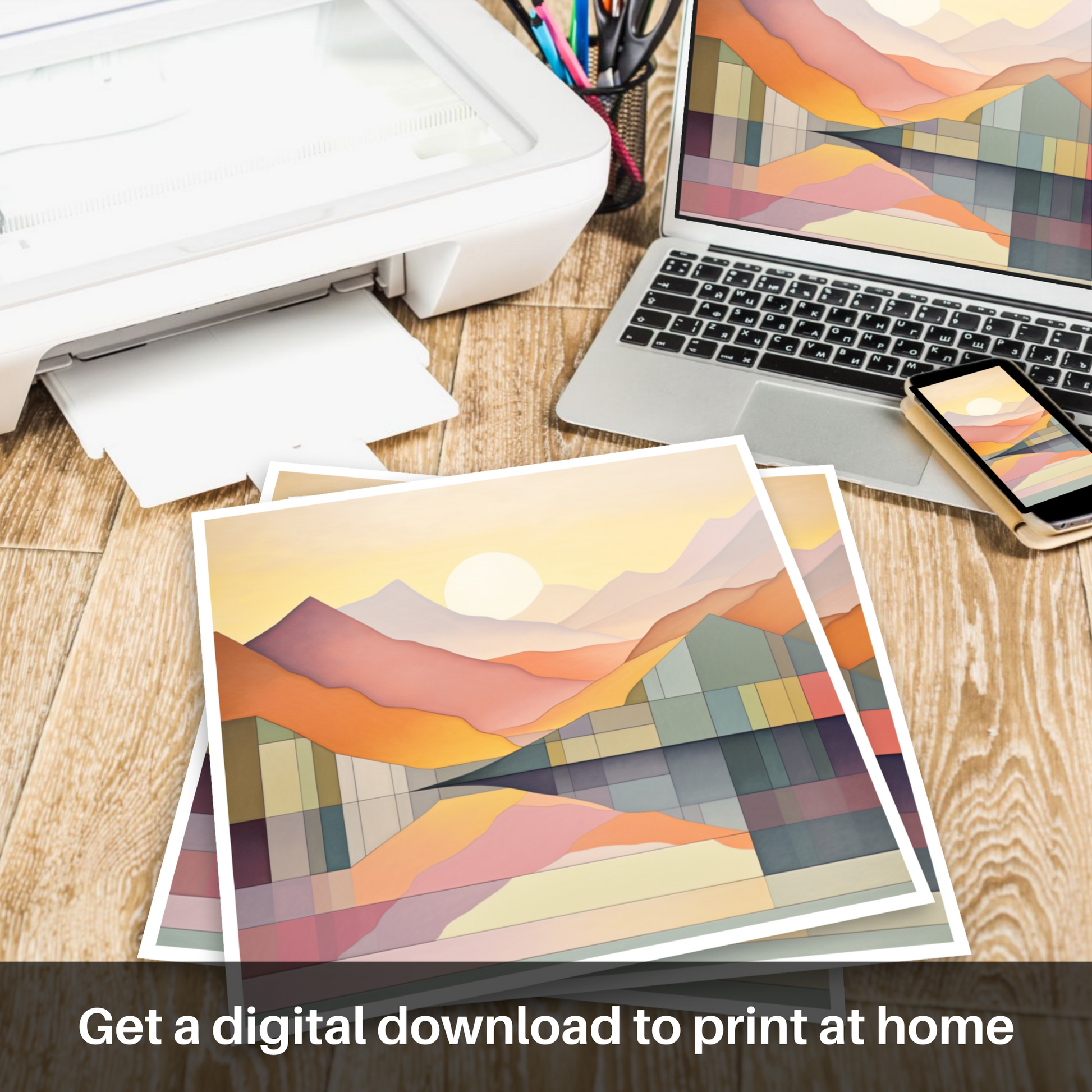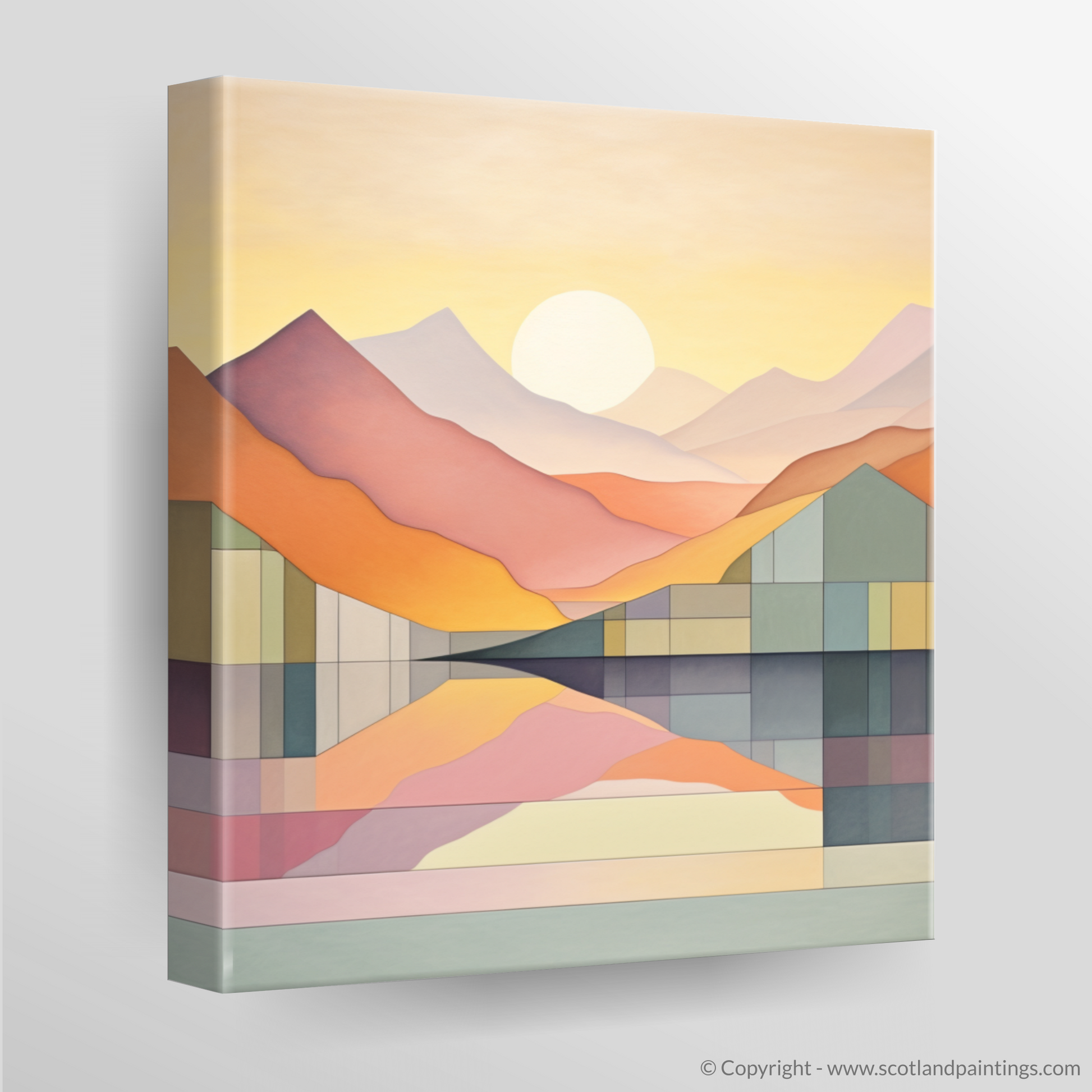 Captivated by the serene beauty of Loch Morar, this sophisticated print embodies the essence of minimalism with its harmonious geometric abstraction. The artwork interprets the tranquil Scottish landscape through a symphony of soft, warm hues caressing the viewer's senses, as peach and rose-coloured peaks descend into cool, muted reflections upon the still waters below.