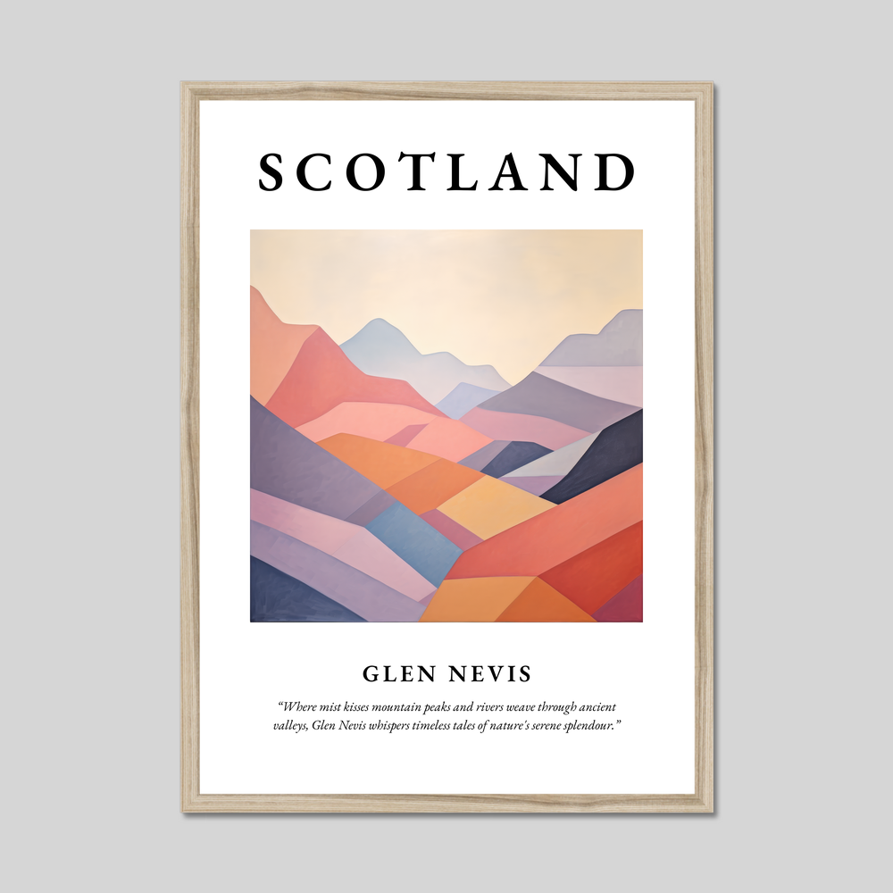 Embrace the timeless beauty of Scotland with our exquisite 50cm x 70cm framed poster print, featuring a stunning minimalist depiction of Glen Nevis. This captivating piece from our "Modern & Minimal" collection celebrates the sublime charm of one of Scotland's most enchanting landscapes. The word “SCOTLAND” graces the top in bold letters, anchoring the design with a proud proclamation of place. Below, a serene painting captures the essence of Glen Nevis with gentle hues and sweeping lines that evoke the mist-kissed mountain peaks and winding rivers. This piece beautifully encapsulates the untouched splendour of nature, providing a window into a world where tranquility reigns.