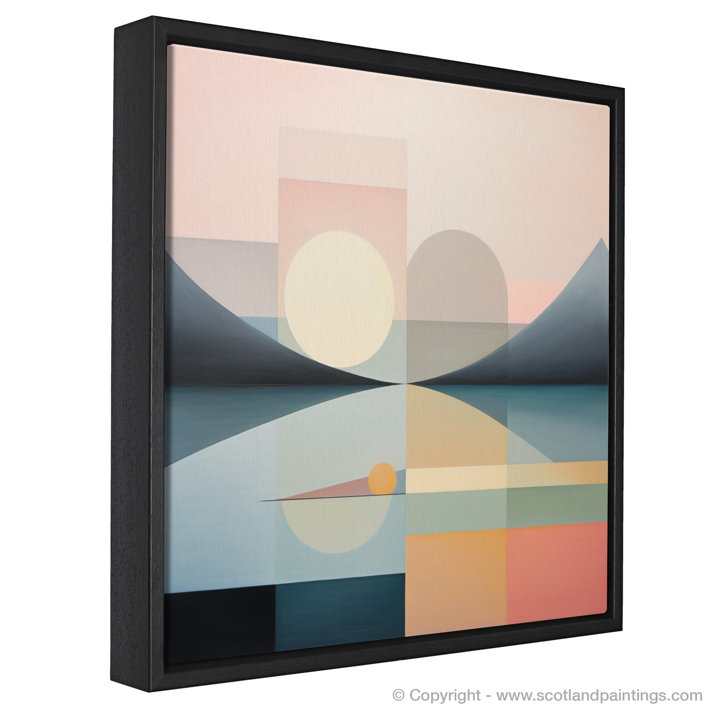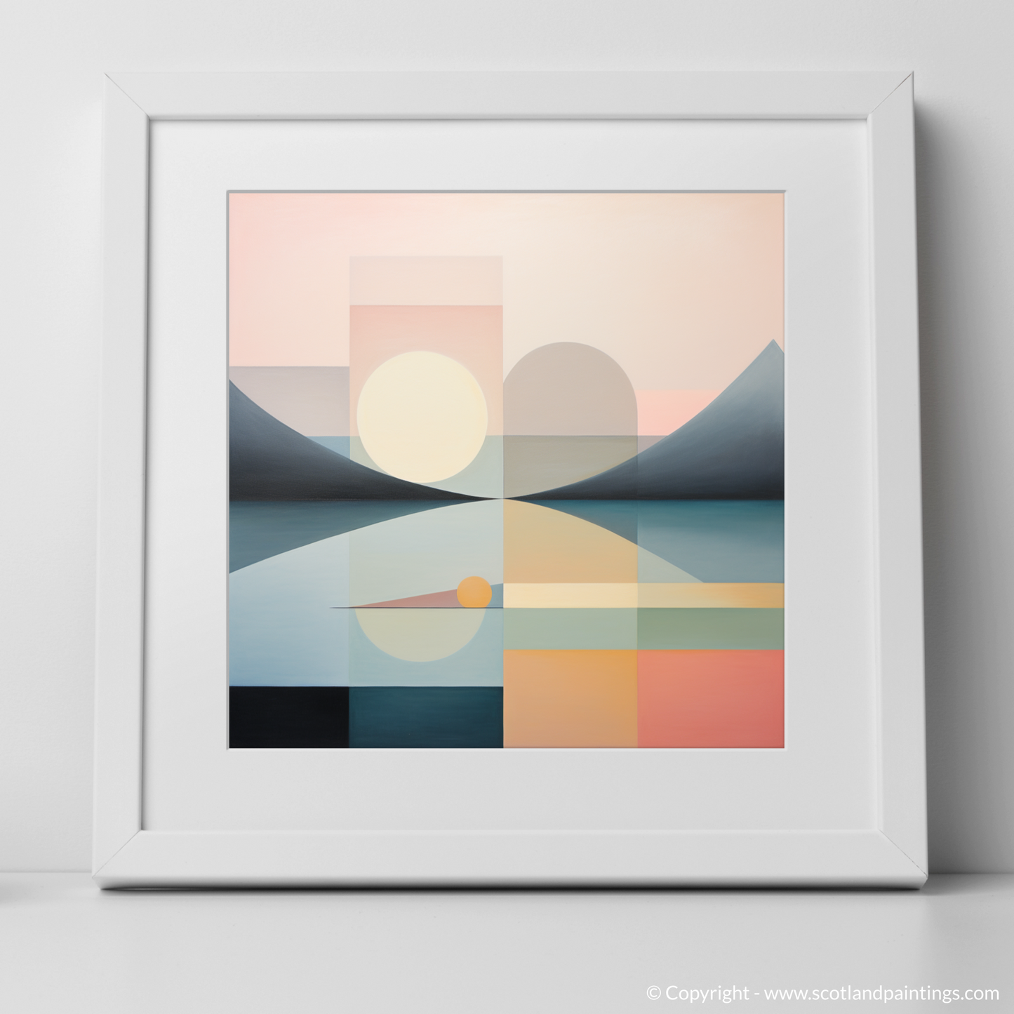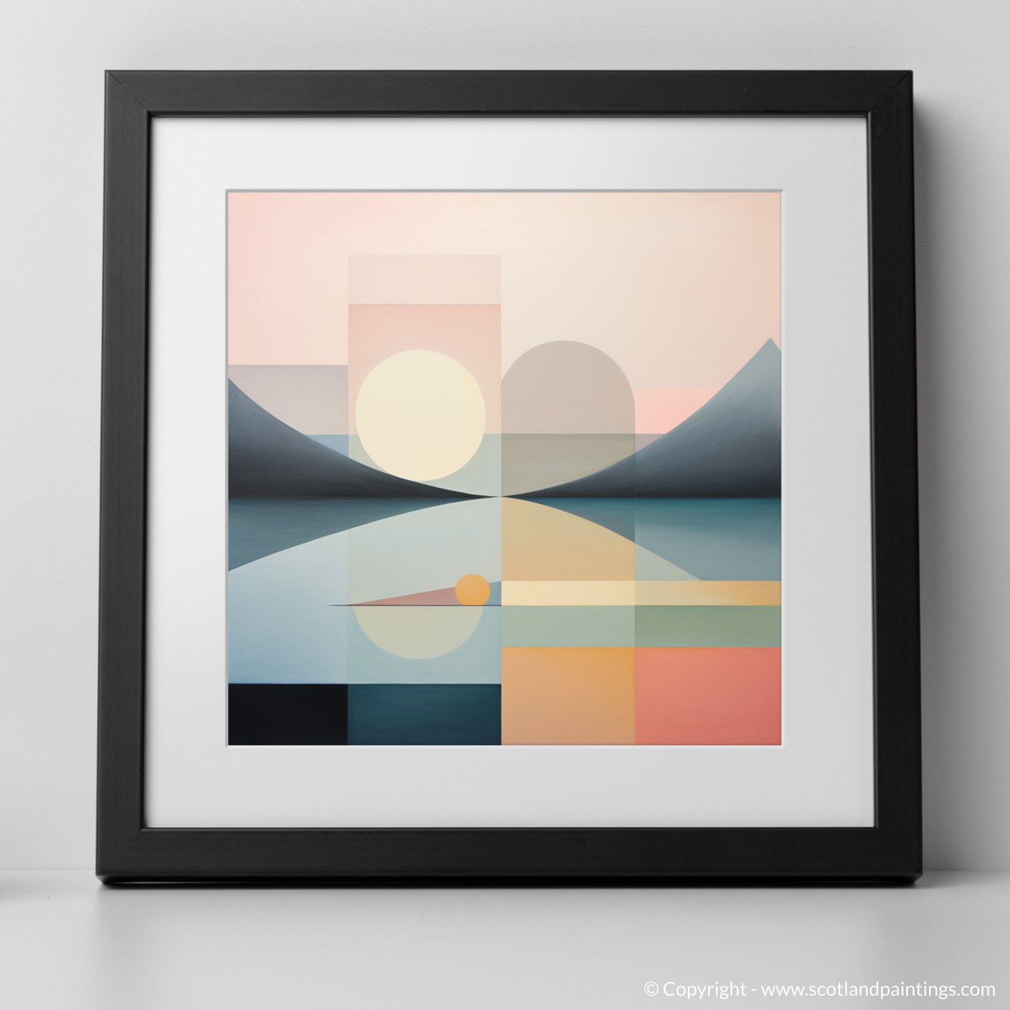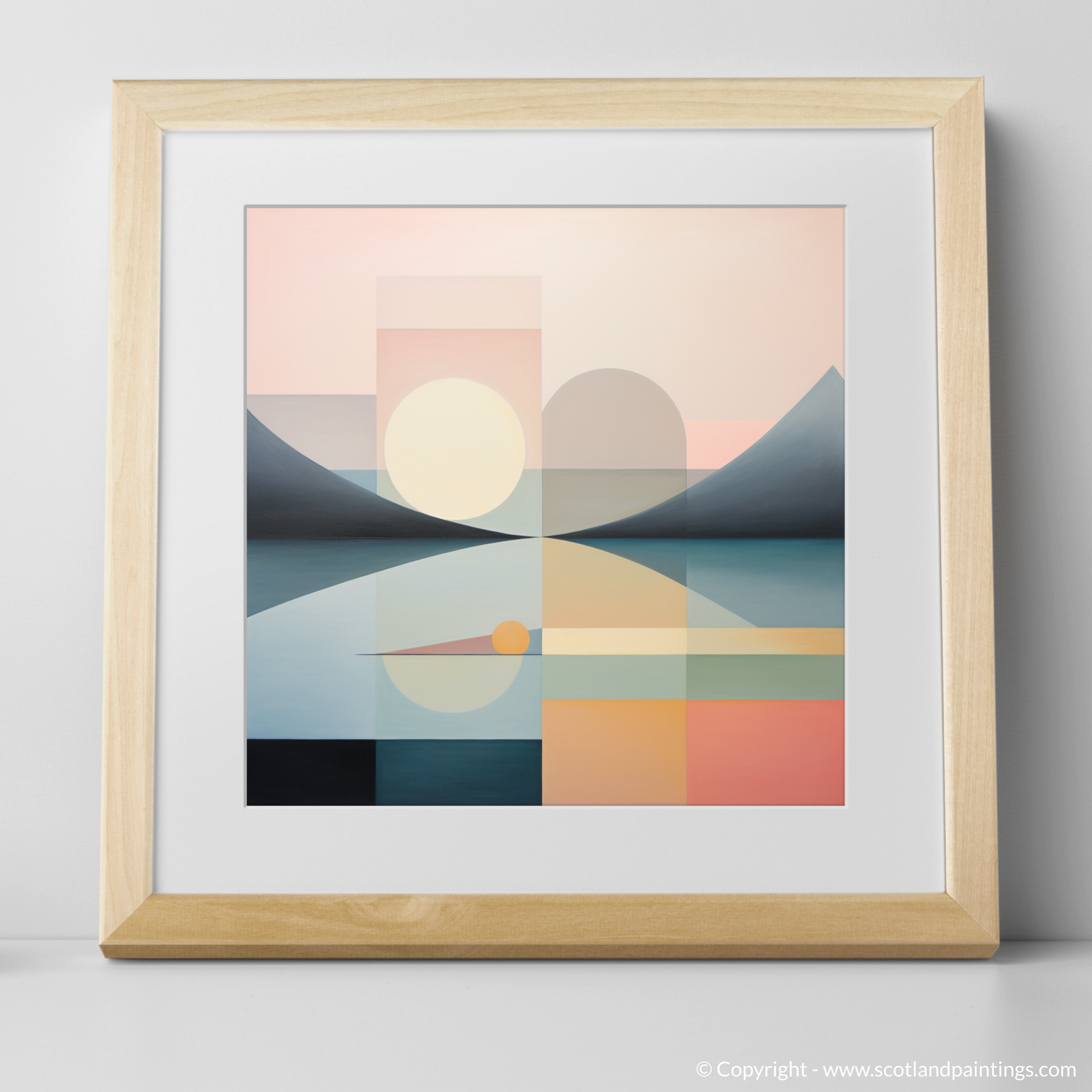 Immerse yourself in the serene beauty of Scotland's natural grandeur with this eloquent minimalist interpretation of Loch Lomond. The artwork offers an abstract depiction of the famed loch, evoking its tranquil atmosphere through a masterfully restrained colour palette and geometric shapes. A gentle gradient of blush sky meets the bold, dark silhouette of undulating hills, conveying the calm end of day when light softly yields to dusk.