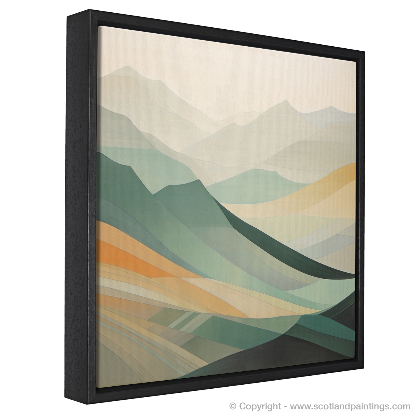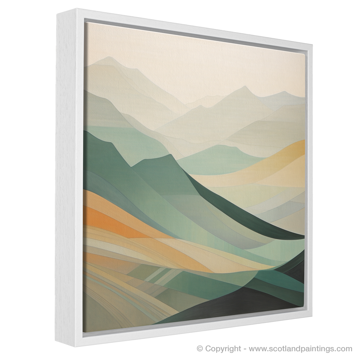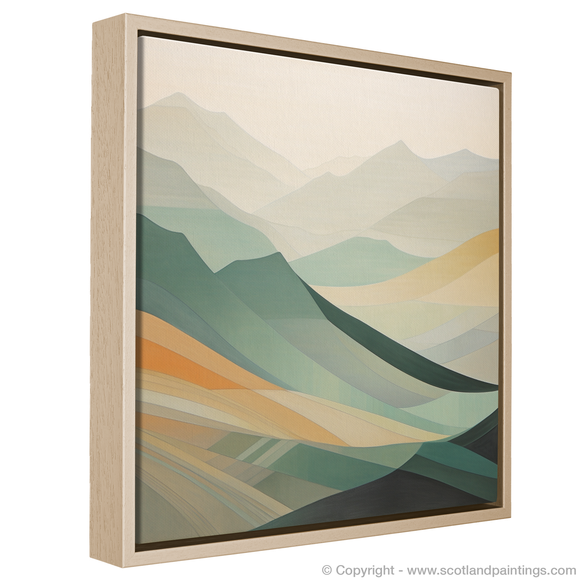 The piece features a series of overlapping, simplified shapes that echo the undulating terrain of Scotland's wilderness. Broad, stylised strokes of muted greens and soft beiges merge seamlessly, punctuated by an occasional understated hint of amber that invokes the heathery hues found in the glen's wild moorland.