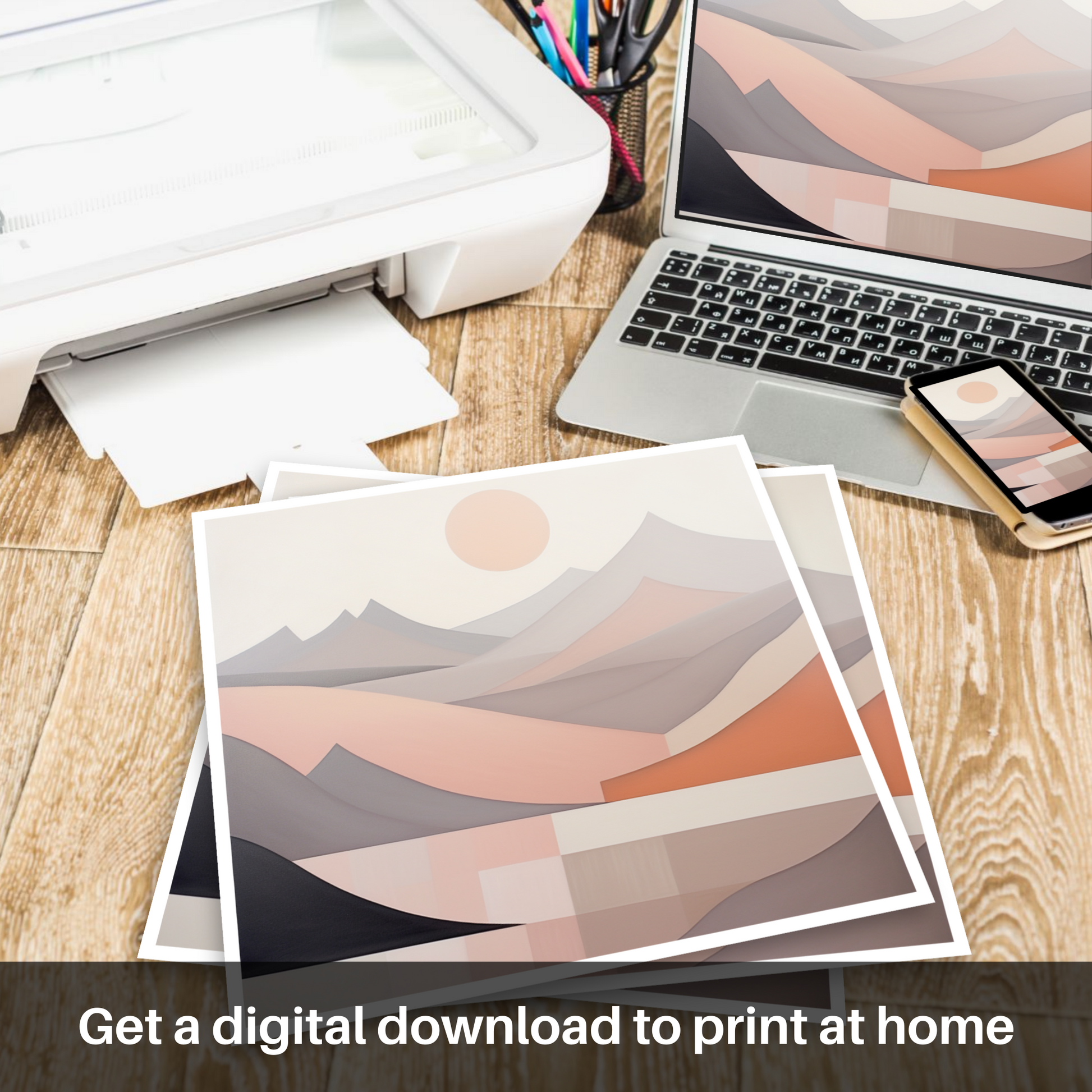Subtle gradients of grey create the illusion of depth and mirror the gentle slope of distant mountains, while warmer tones of peach and salmon evoke the gentle kiss of dawn or the last embers of dusk. A pale, circular form hangs above the horizon, suggesting the sun's quiet presence in a clear sky.